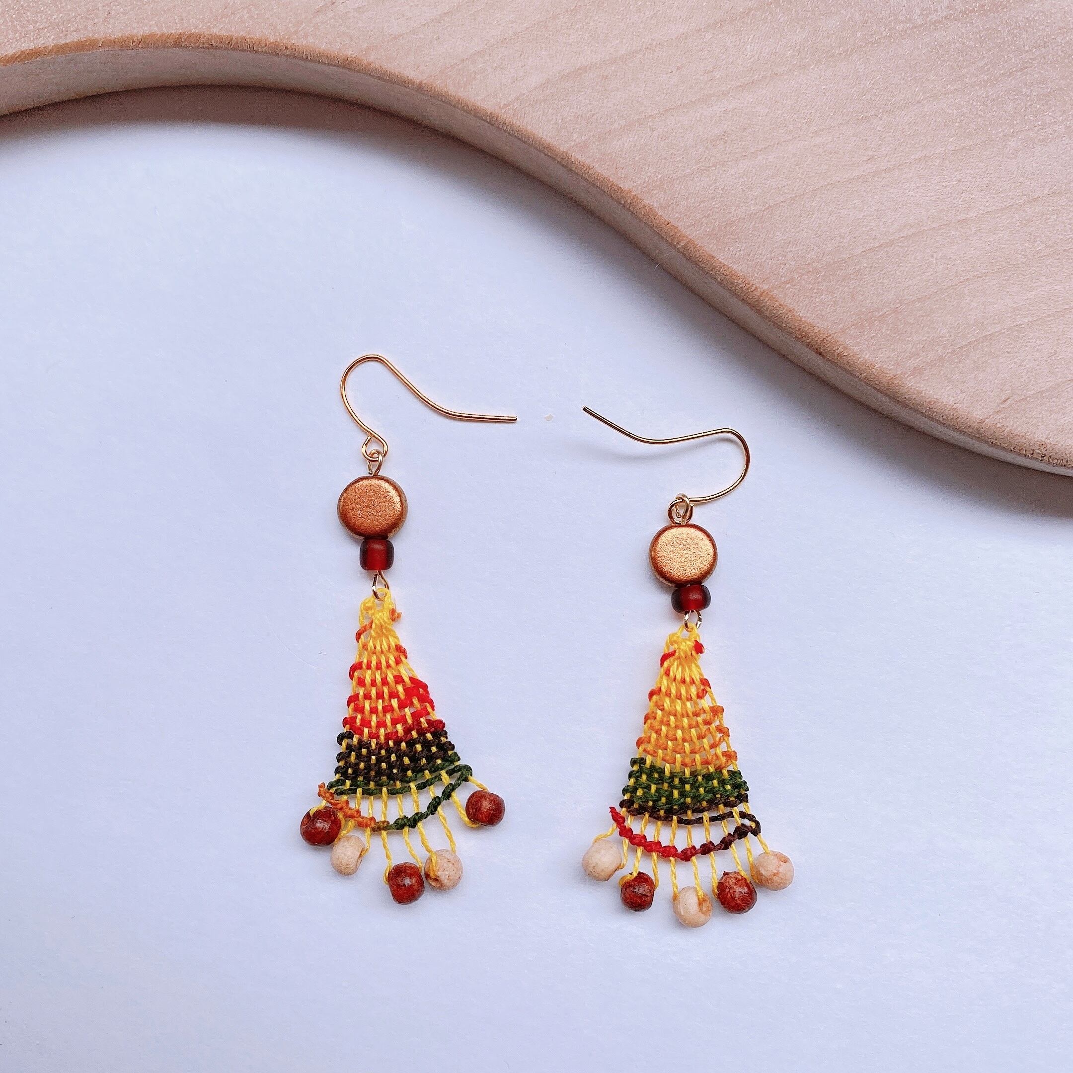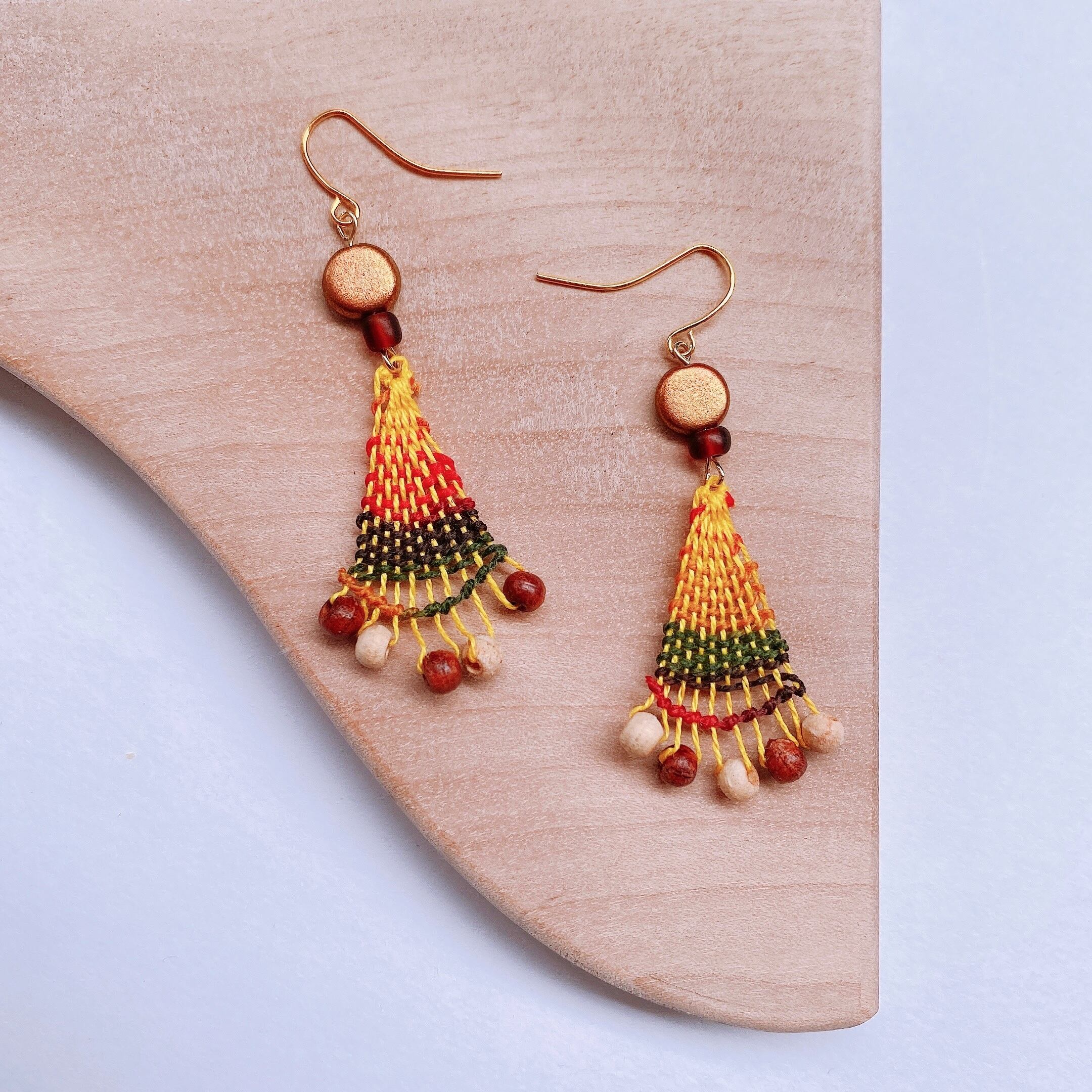 [材料]    黄色糸・グラデーション糸・ウッドビーズ・ステンレスビーズ・ピアス金具