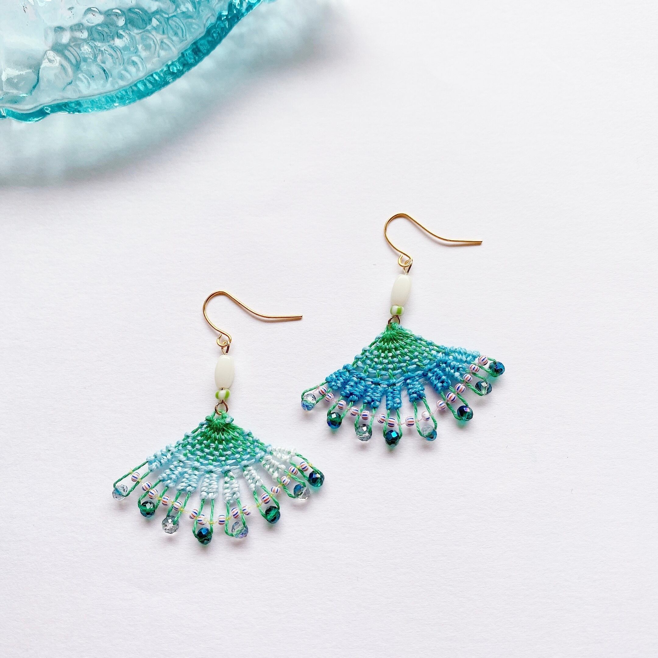 [材料]    薄いブルー糸・グラデーション糸・ダイヤカットビーズ・ストライプ極小ビーズ・ピアス金具