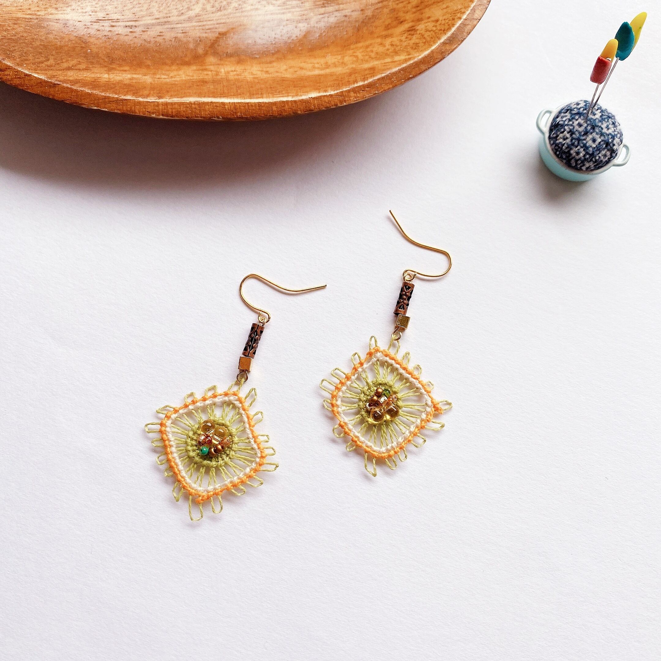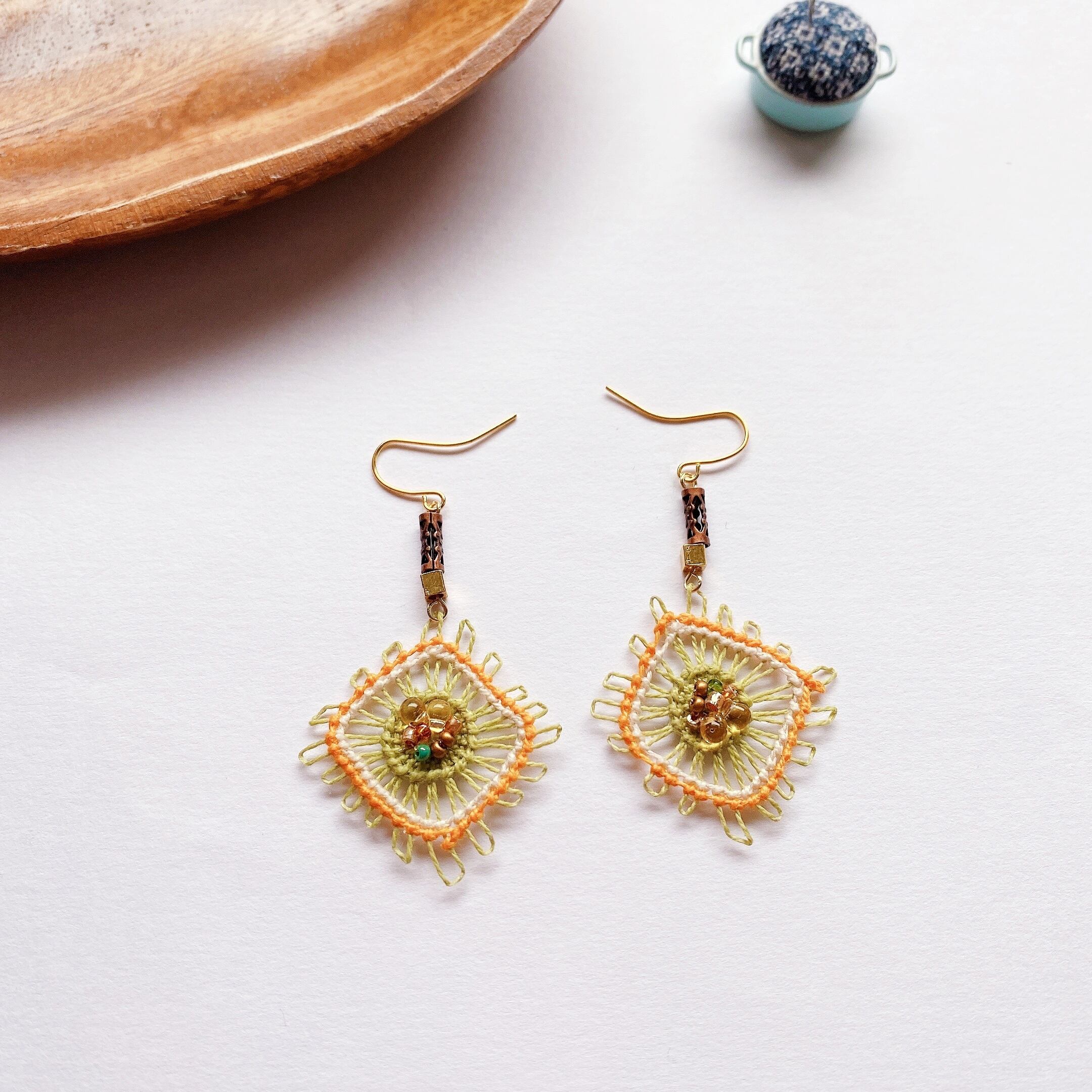 [材料]    生成り色・ホワイト・オレンジ糸・フランスアンティークビーズ・ピアス金具