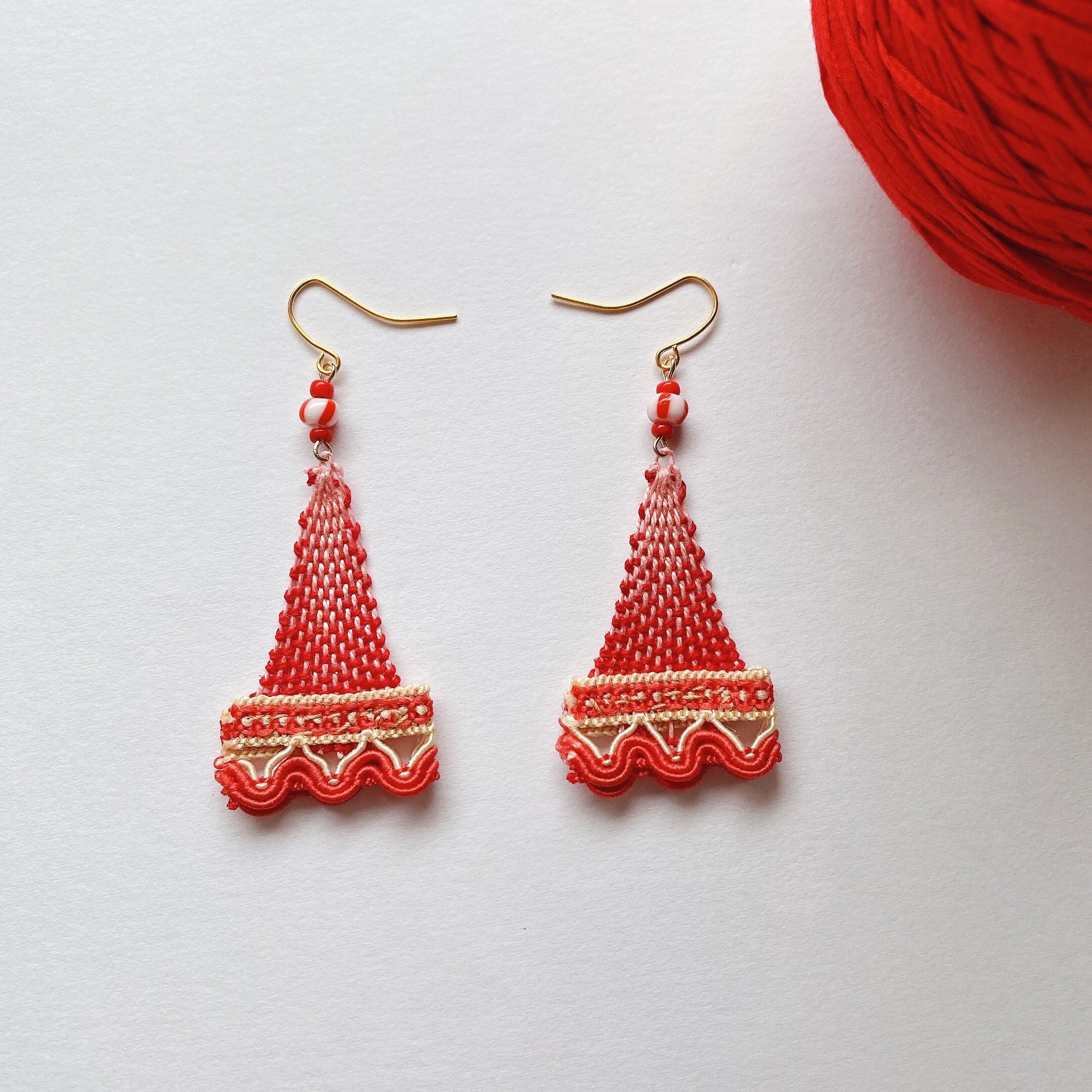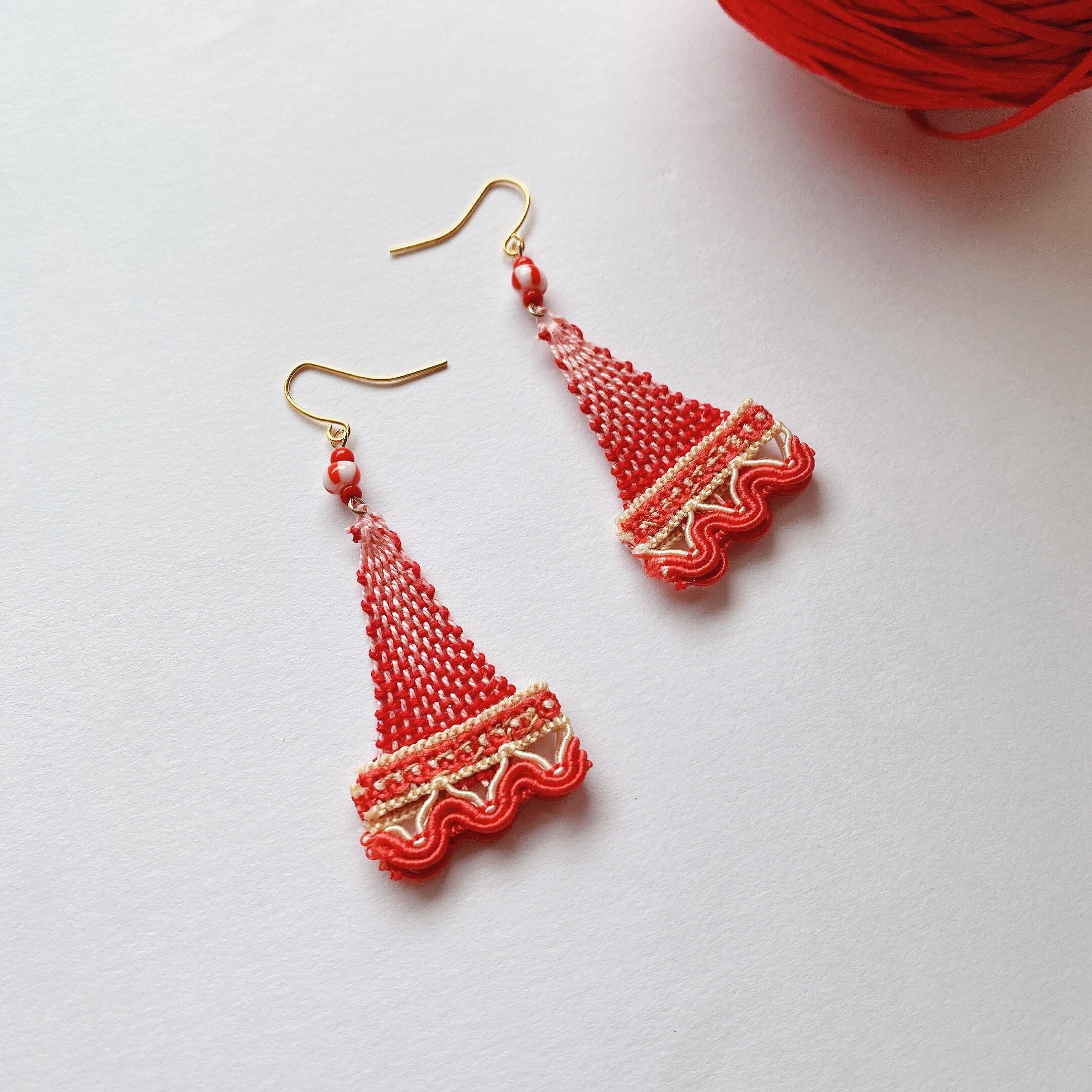 [材料]   赤・生成り色糸・山形バイヤステープ・ストライプ赤ガラスビーズ・ピアス金具
