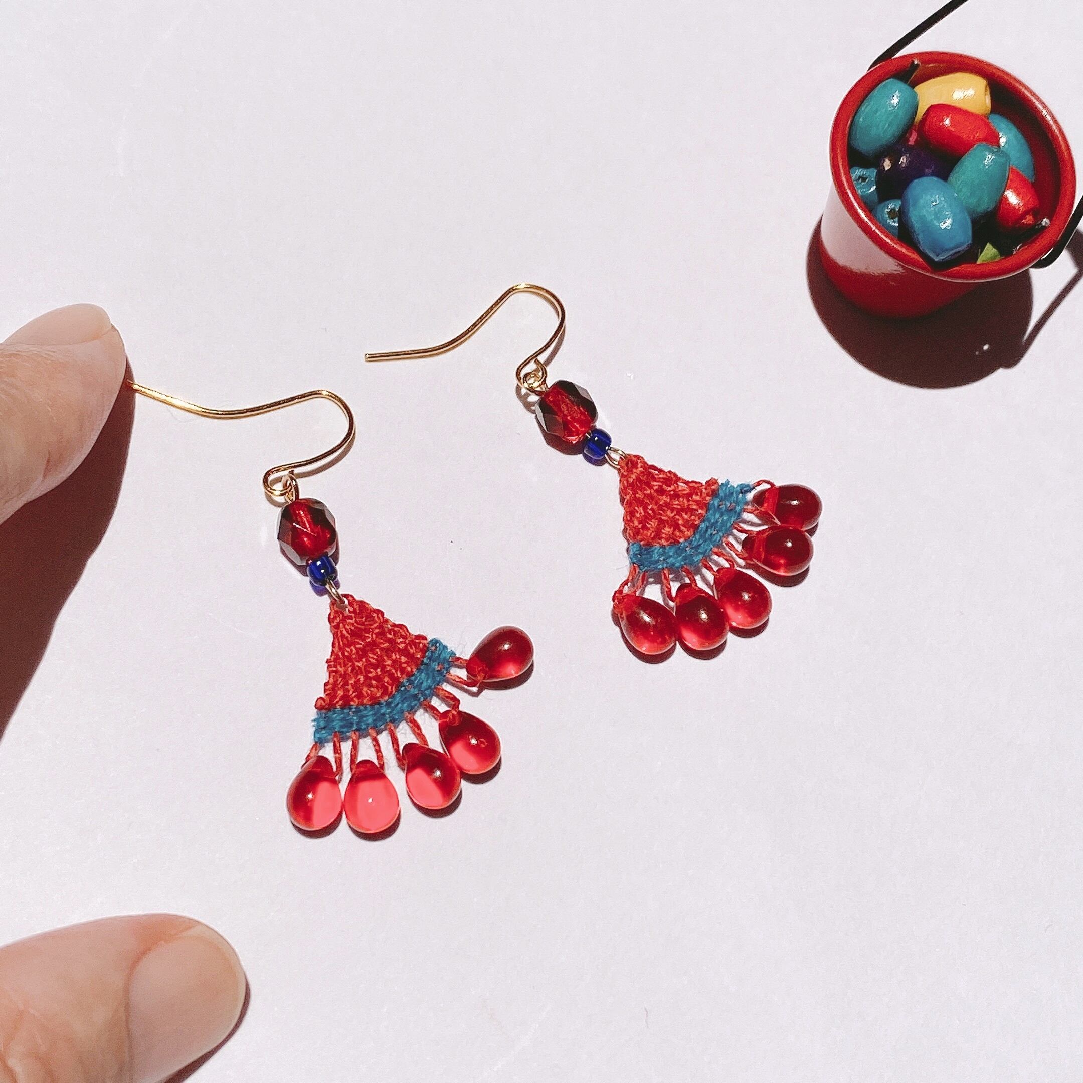 [材料]   赤色・ターコイズ色糸・赤いしずく型ビーズ・トルコ赤ガラスビーズ・ガラスビーズ・ピアス金具