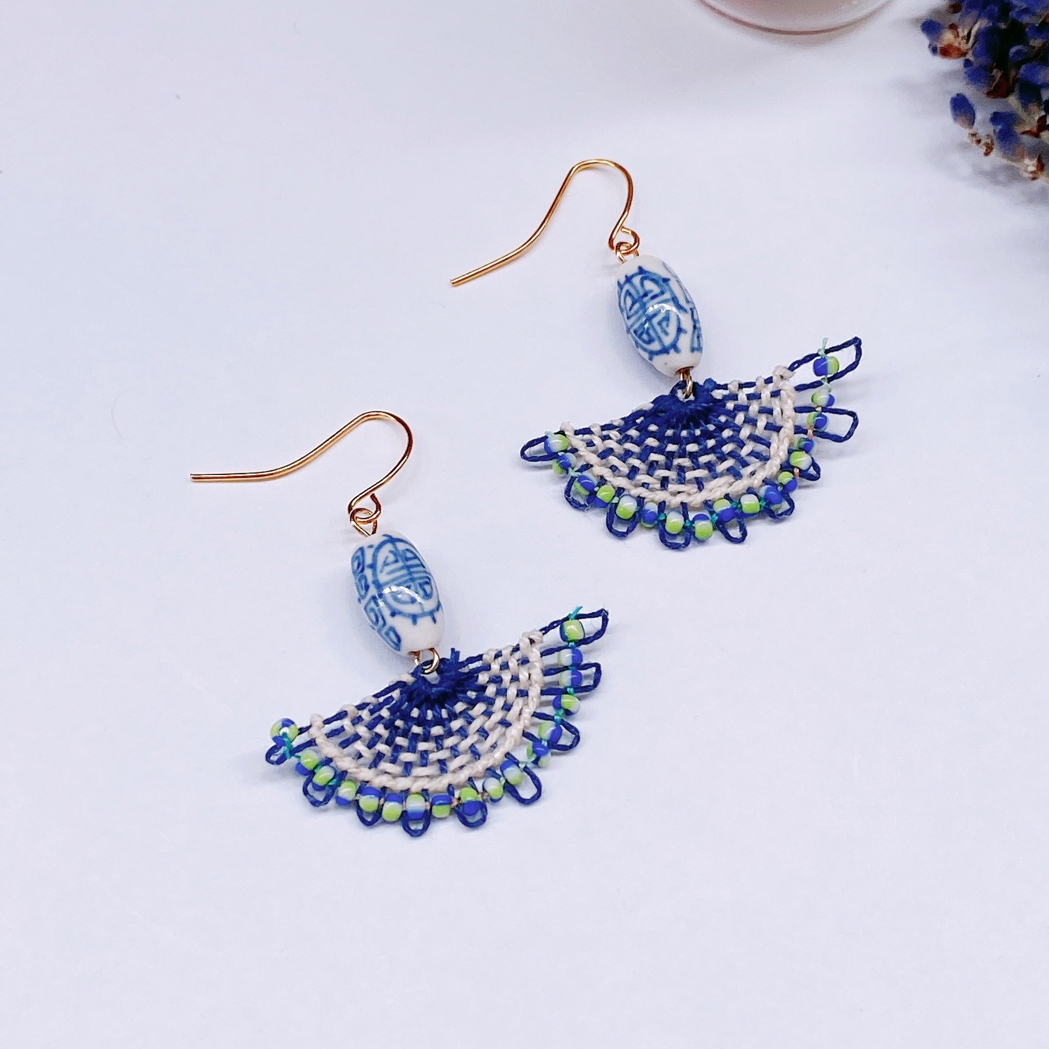[材料]   ブルー・白色糸・小さなストライプビーズ・陶器ビーズ・ガラスビーズ・ピアス金具