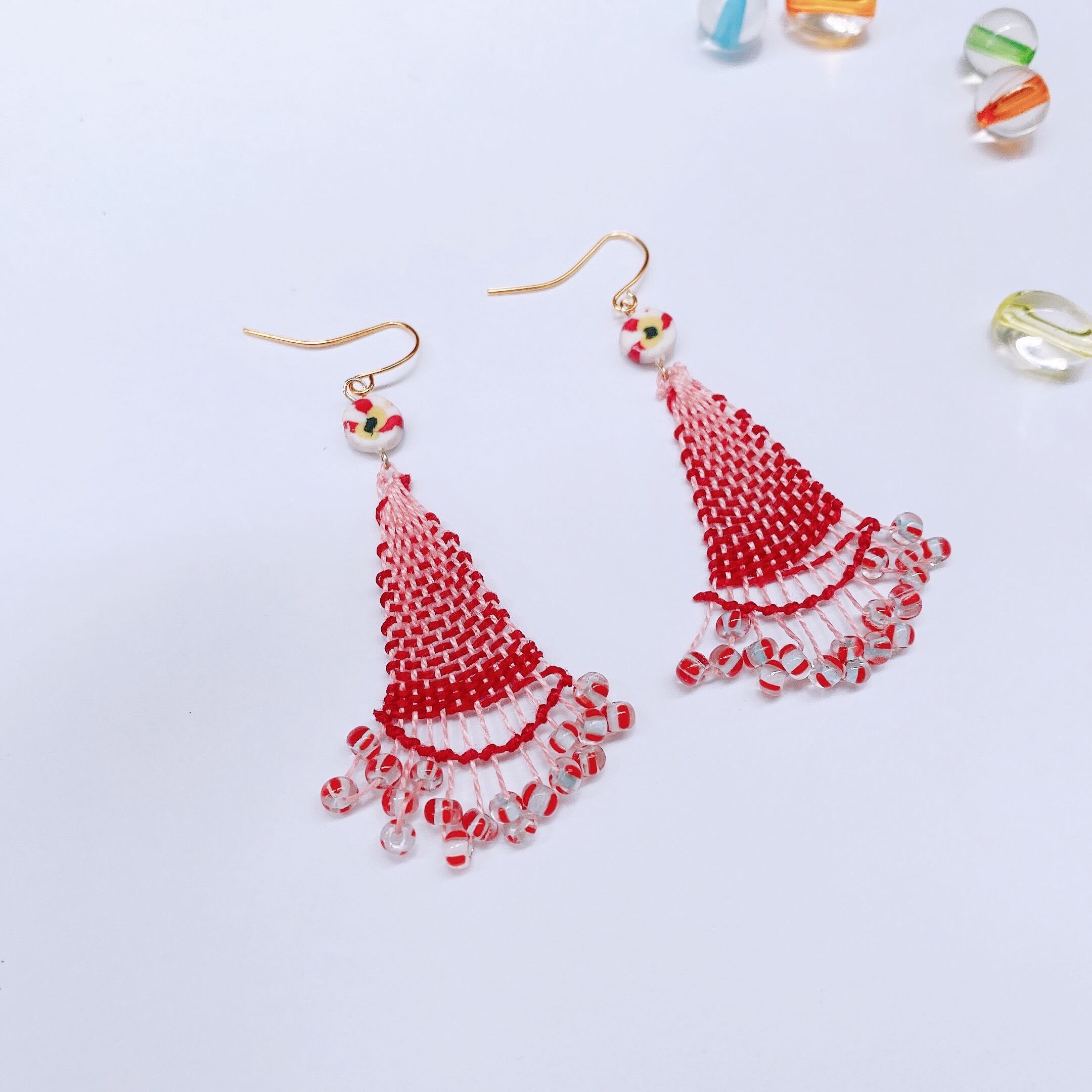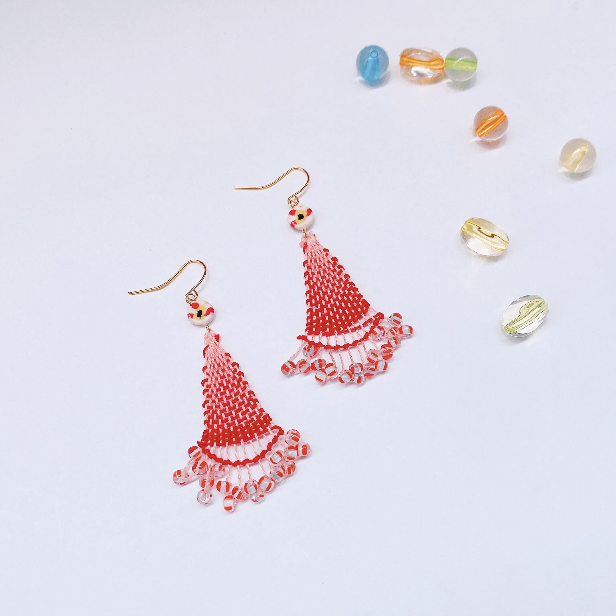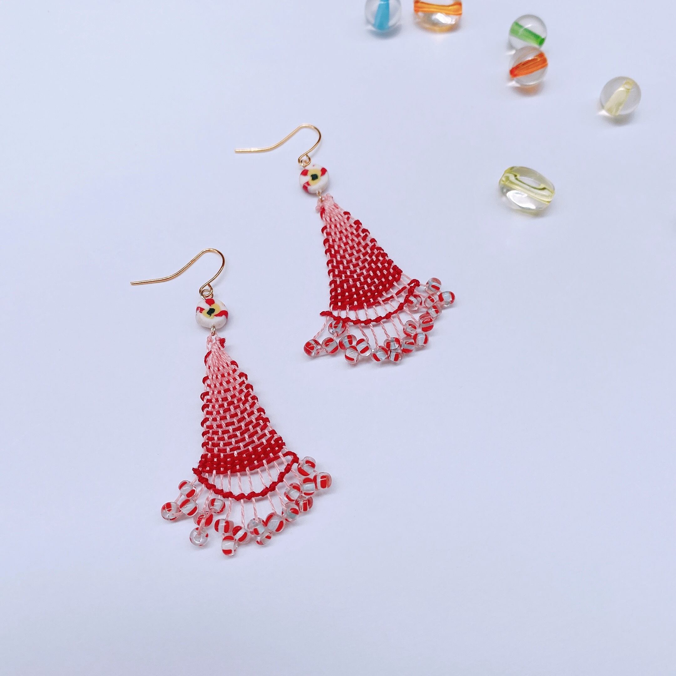 [材料]   赤・薄いピンク糸・ストラプビーズ・オリジナル樹脂ビーズ・ピアス金具