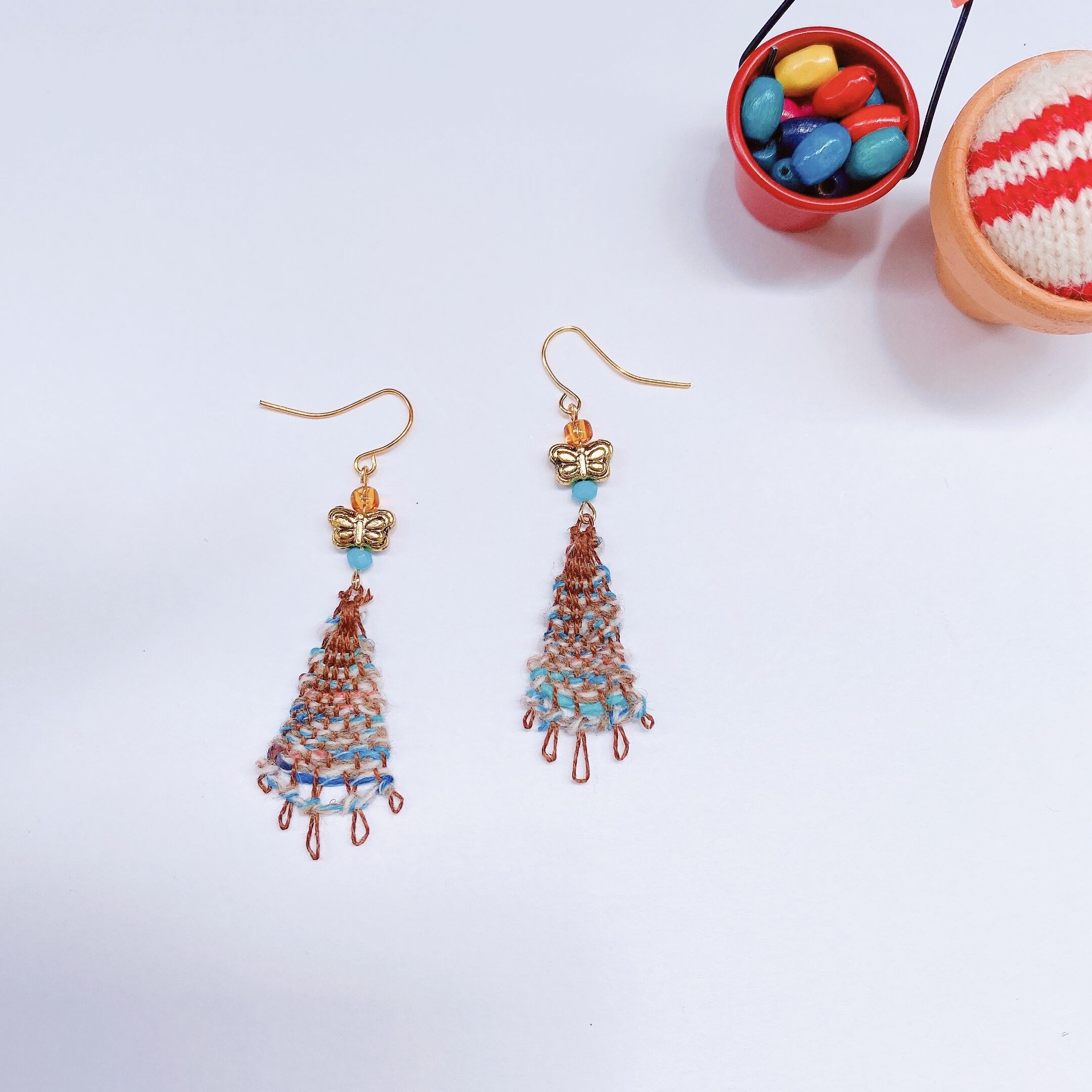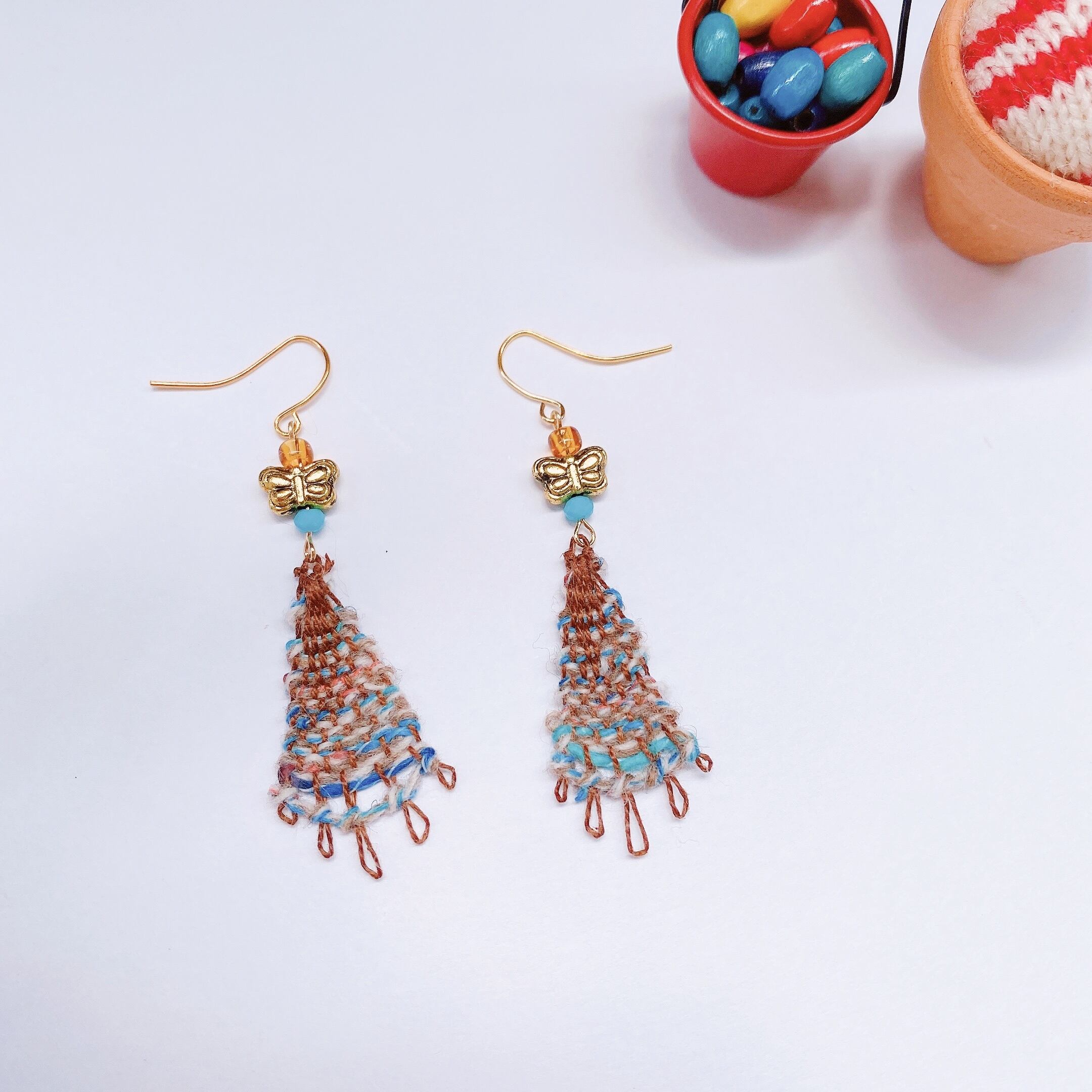 [材料]   茶色糸・段染めブルー・ホワイト糸・ガラスビーズ・チョウチョモチーフパーツ・ピアス金具