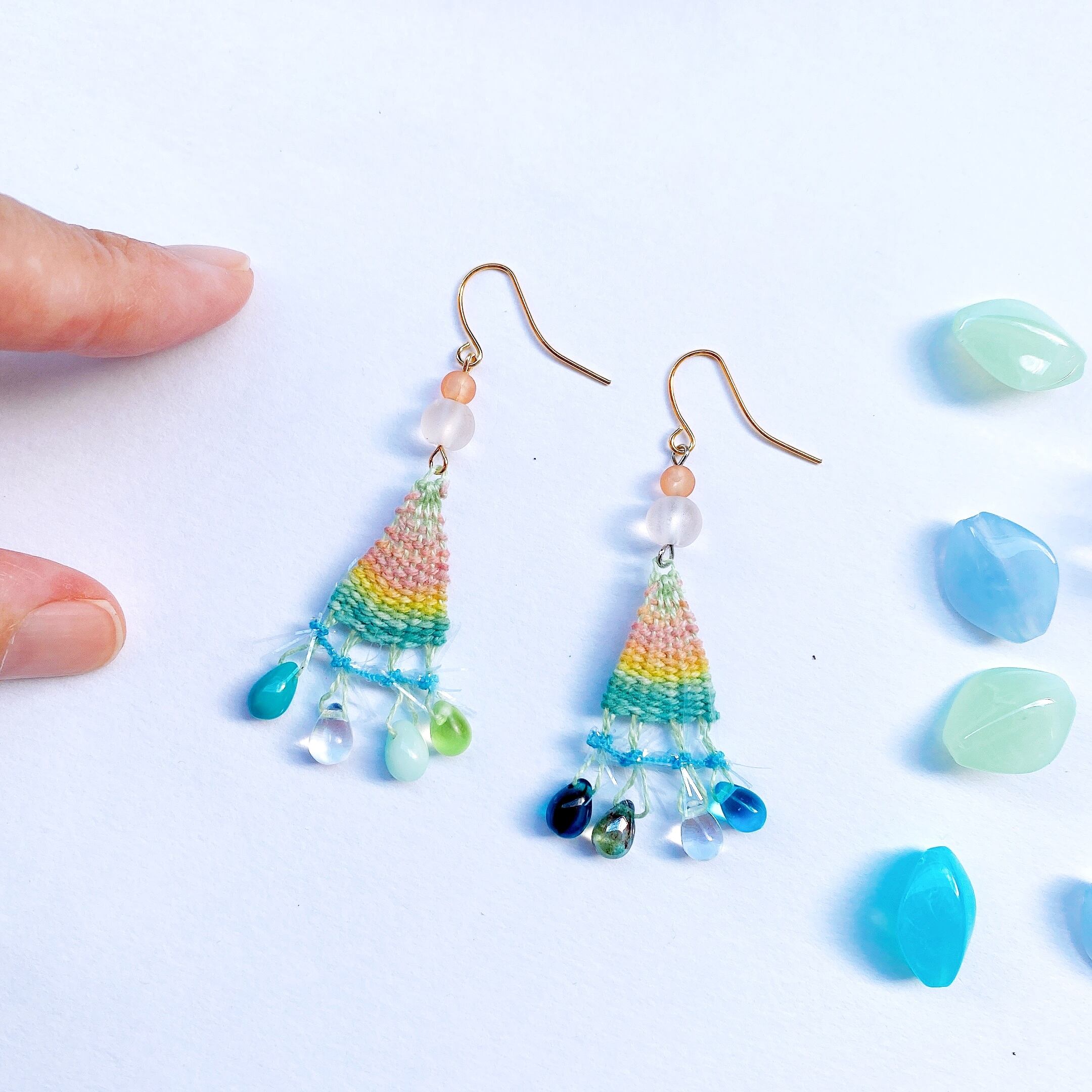 [材料] パステルグリーンベース・虹色糸・ブルー系しずくビーズ・トルコクラッシュビーズ・ピアス金具
