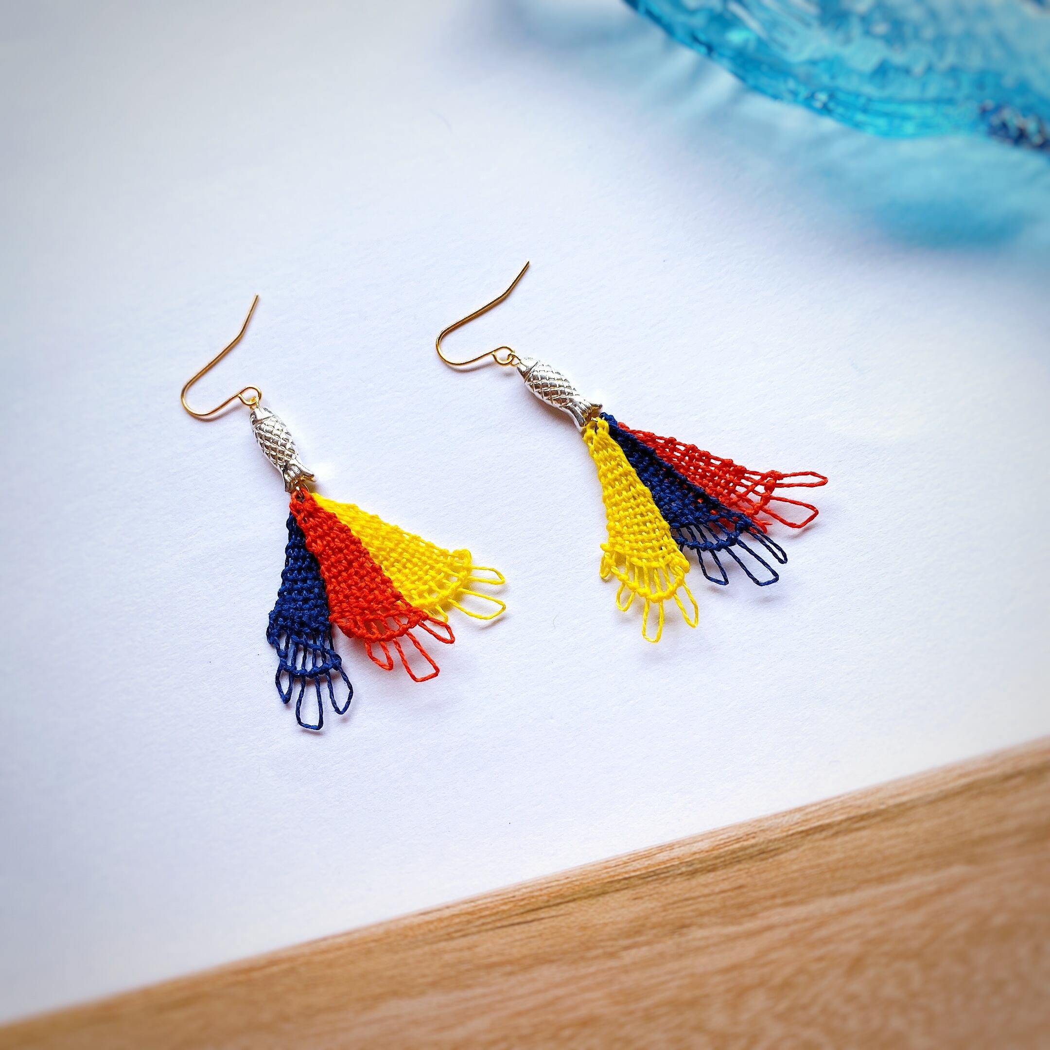 [材料]   黄色・赤・青糸・魚モチーフパーツ・ピアス金具