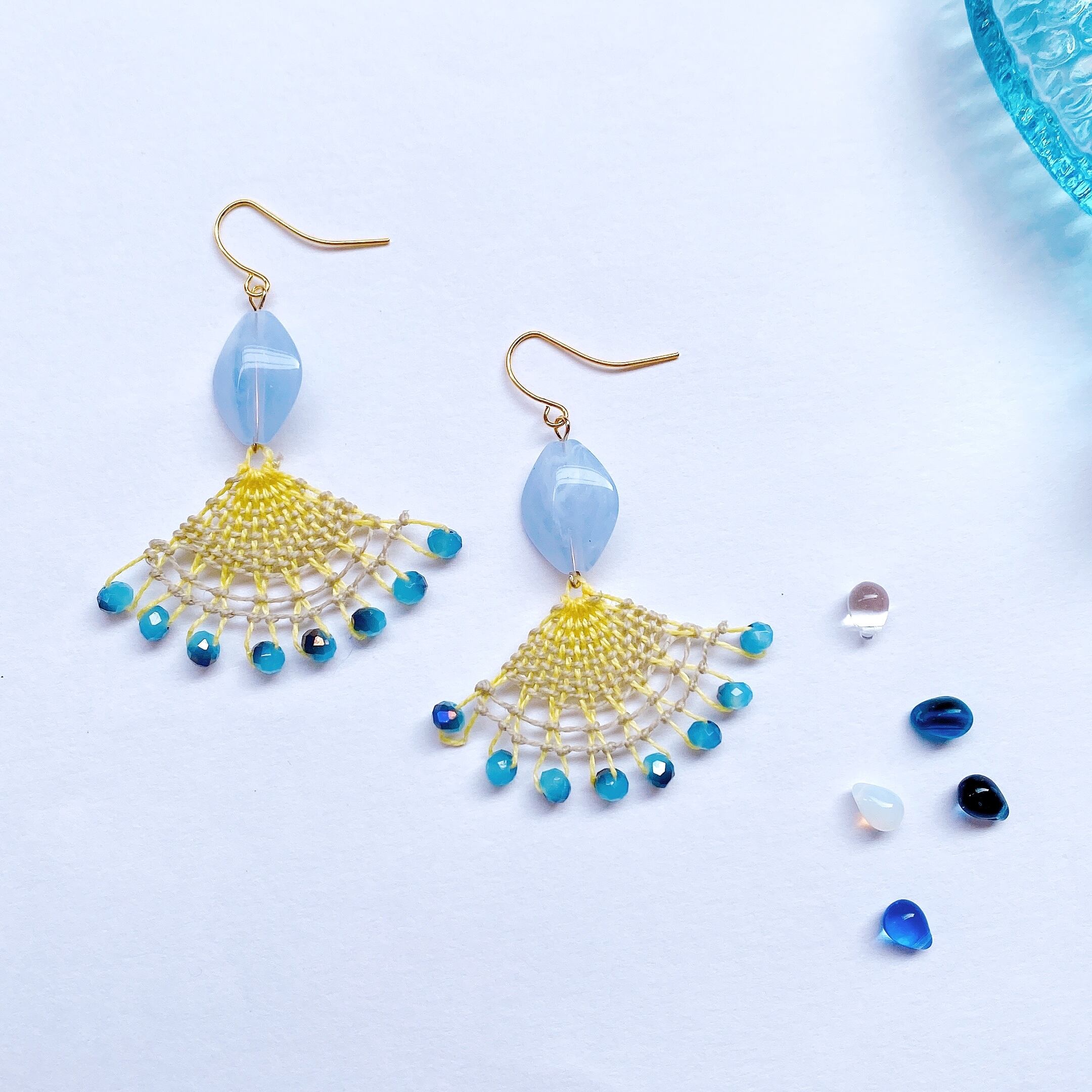 [材料]   黄色・生成色糸・ダイヤカットガラスビーズ・アクリルビーズ・ピアス金具