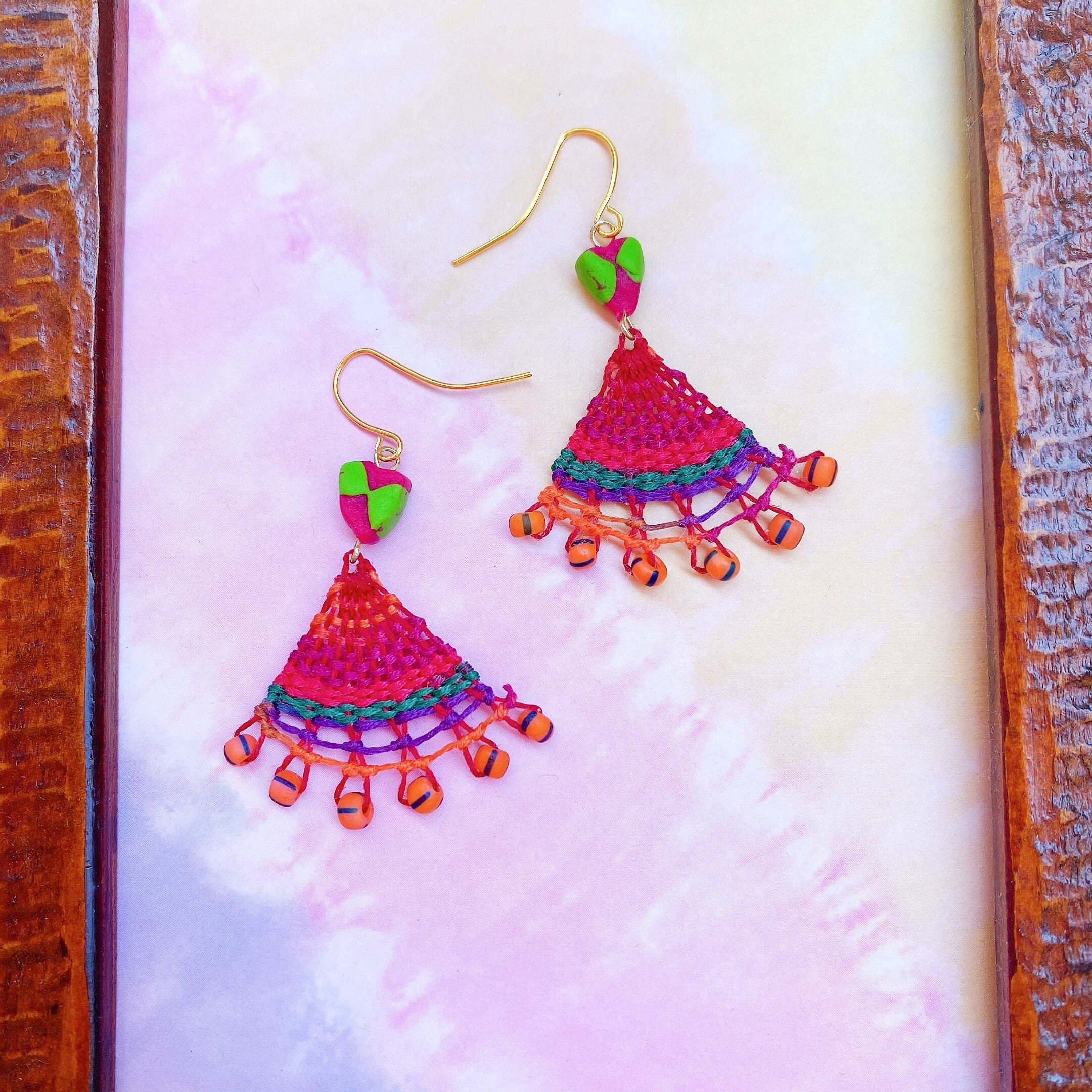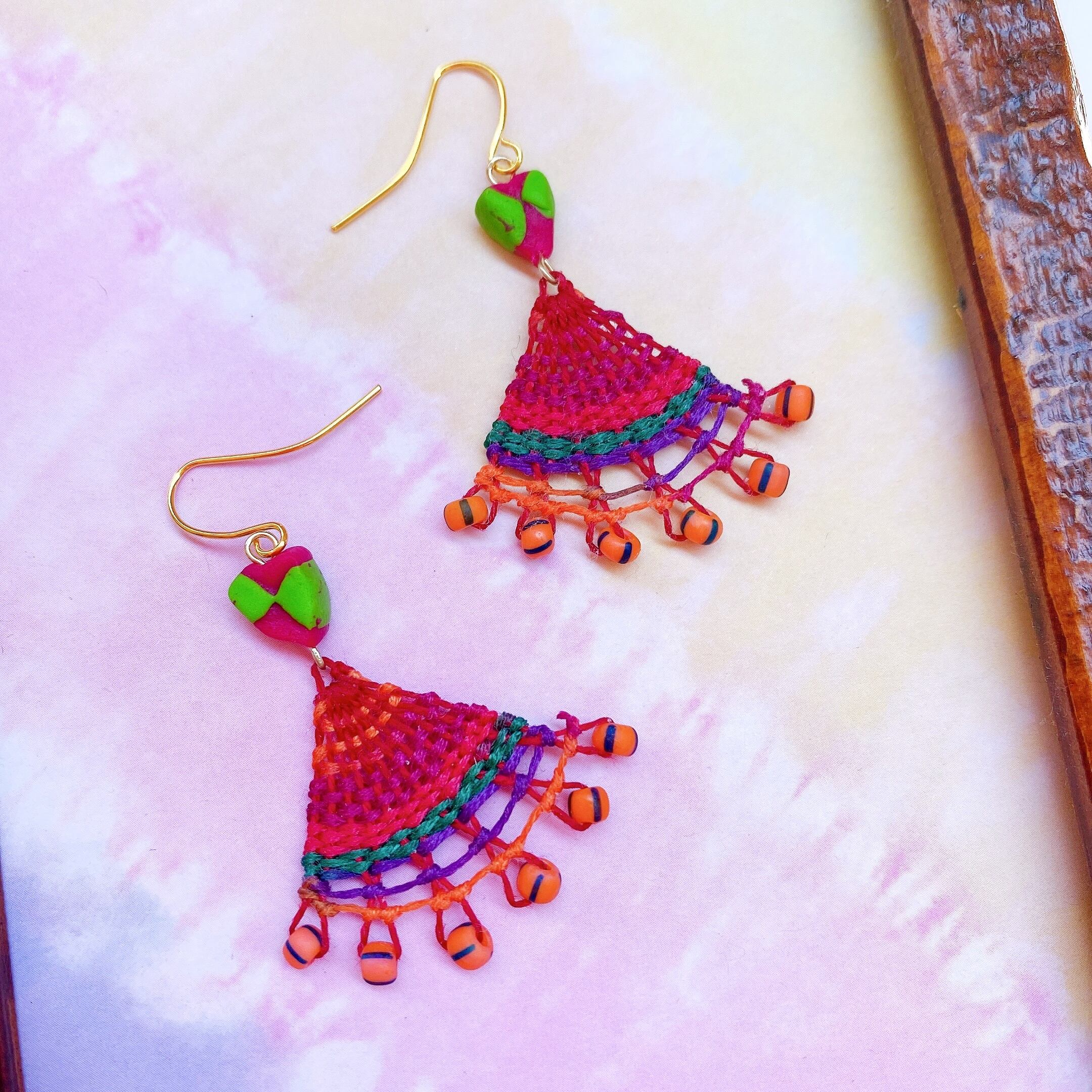 [材料]   赤色・紺色糸・ストライプオレンジビーズ・オリジナル樹脂ビーズ・ピアス金具