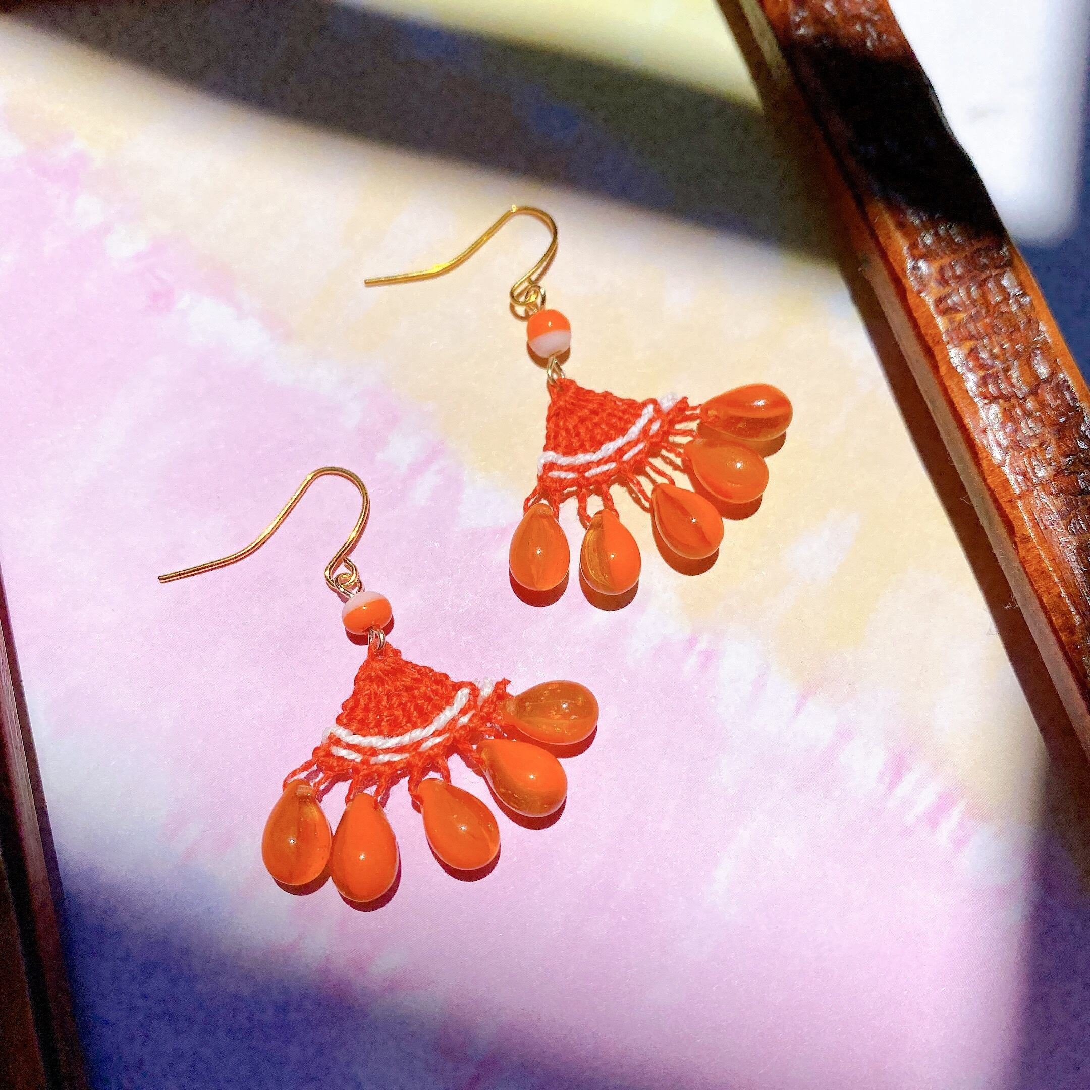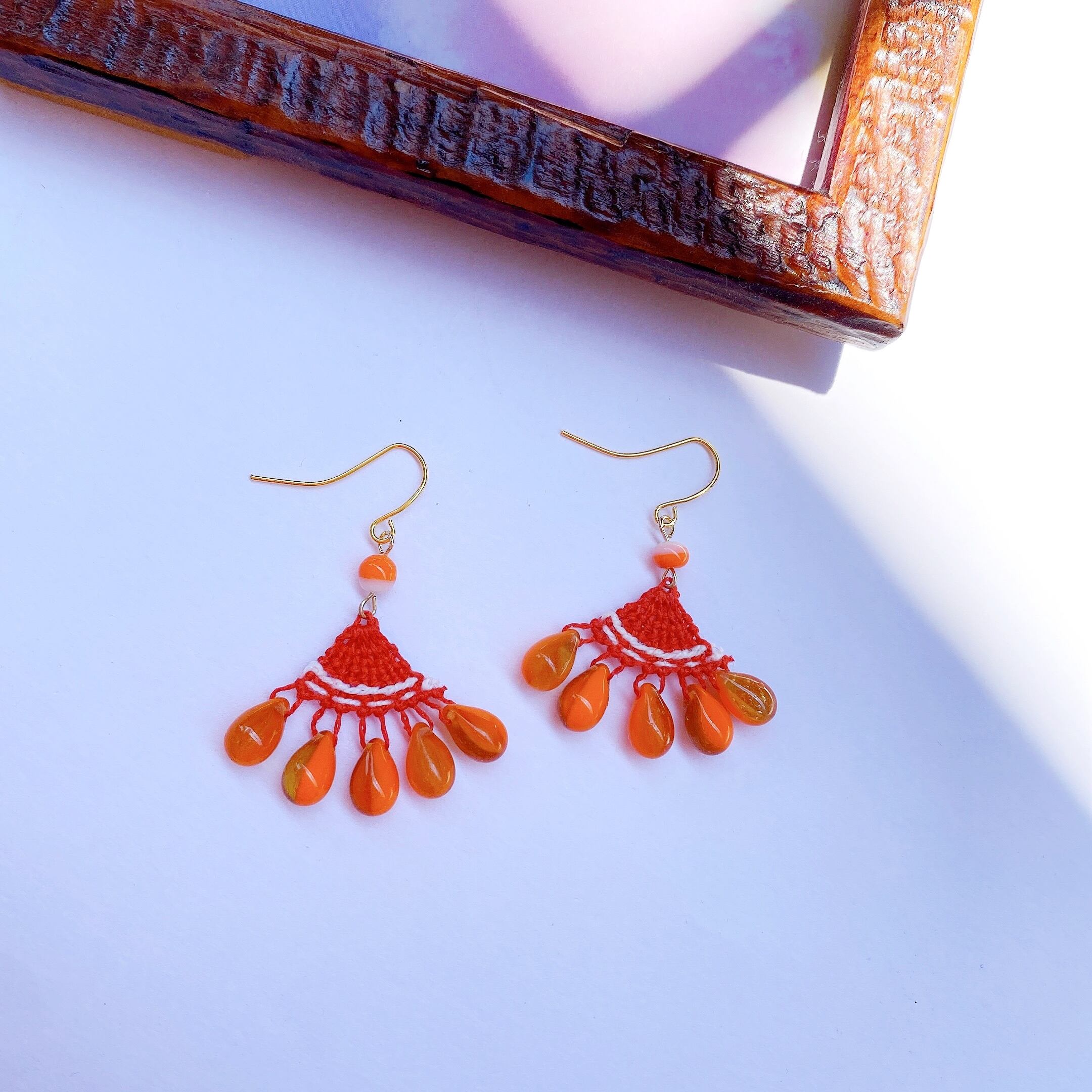 [材料]   オレンジ色・白糸・しずく型ガラスビーズ・小さなガラスビーズ・ピアス金具