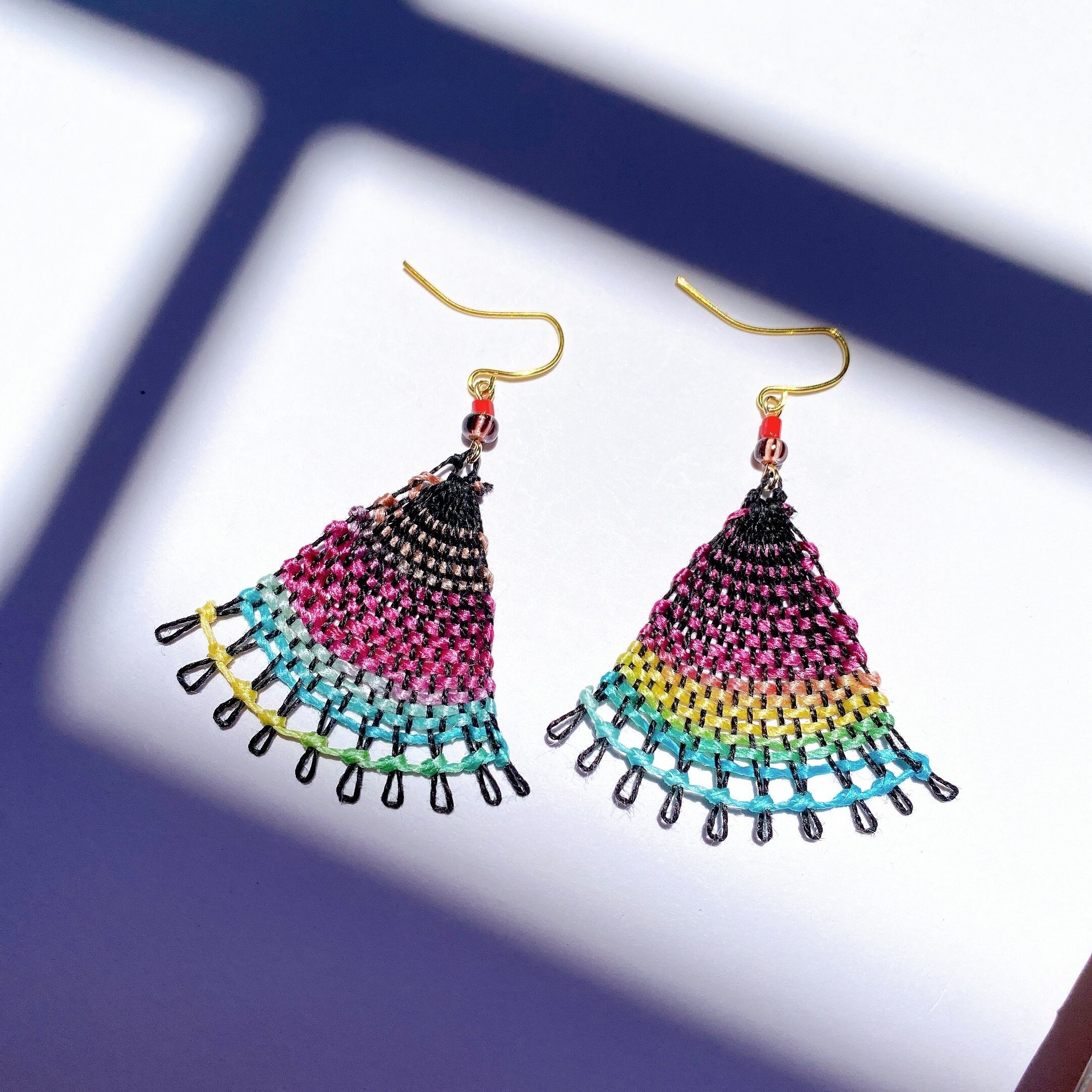 [材料]   シルクグラデーション・紺色糸・ストライプガラスビーズ・小さなガラスビーズ・ピアス金具
