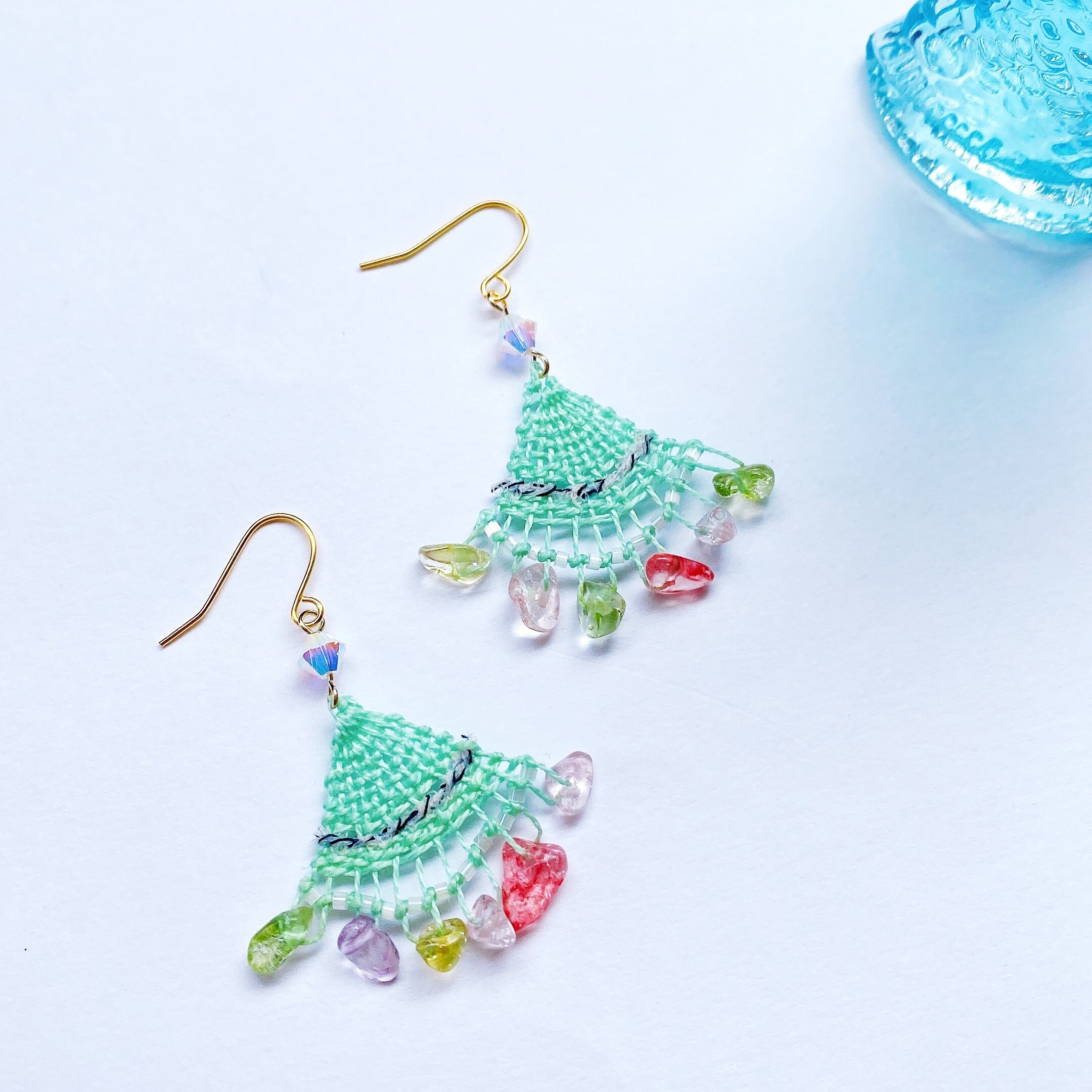 [材料]   コバルトブルー糸・さざれ石ビーズ・小さなガラスビーズ・ピアス金具