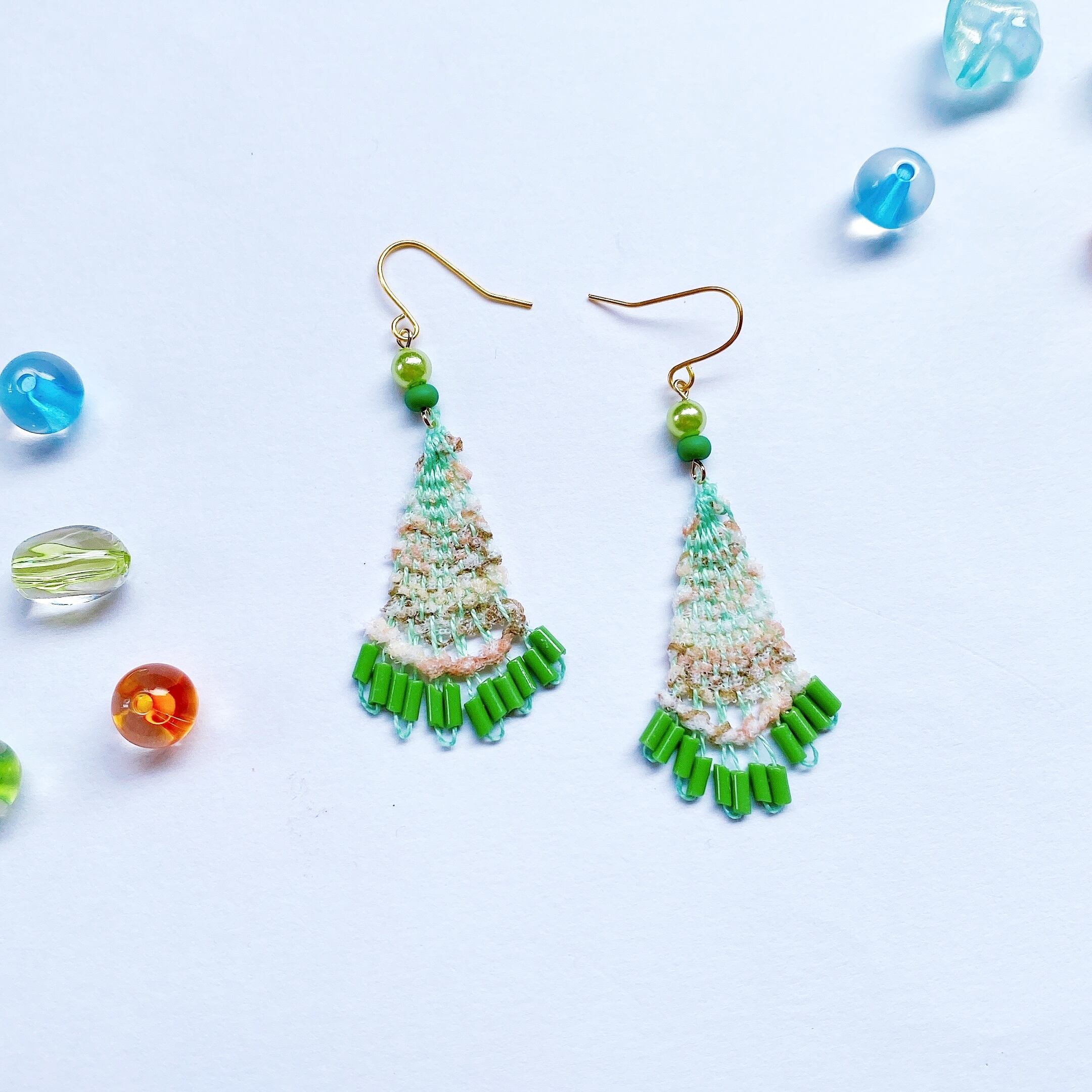 [材料]   エメラルドグリーン糸・グラデーション糸・竹型ビーズ・ガラスビーズ・ピアス金具