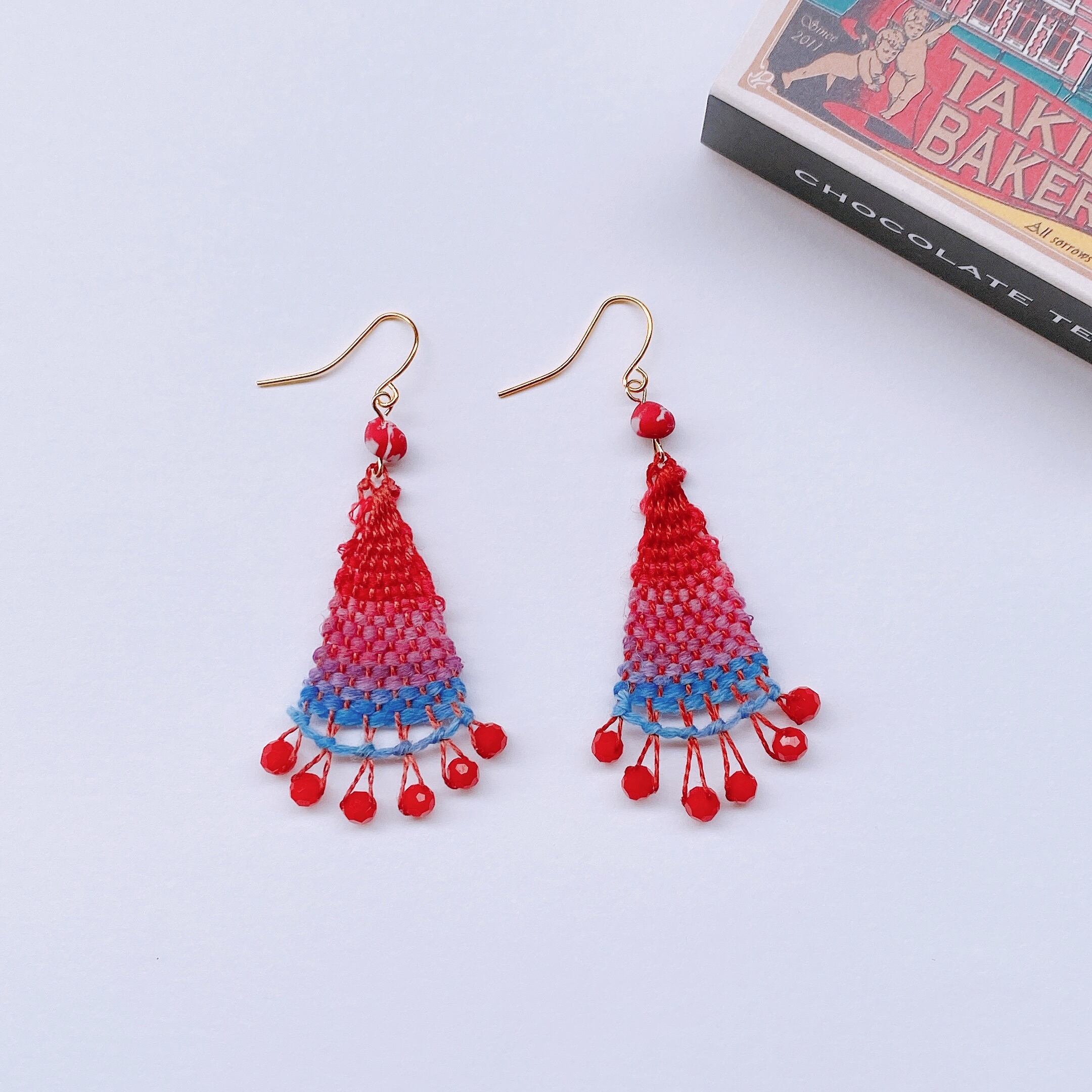 [材料]   赤色糸・グラデーション糸・ダイヤカットビーズ・オリジナル樹脂ビーズ・ピアス金具
