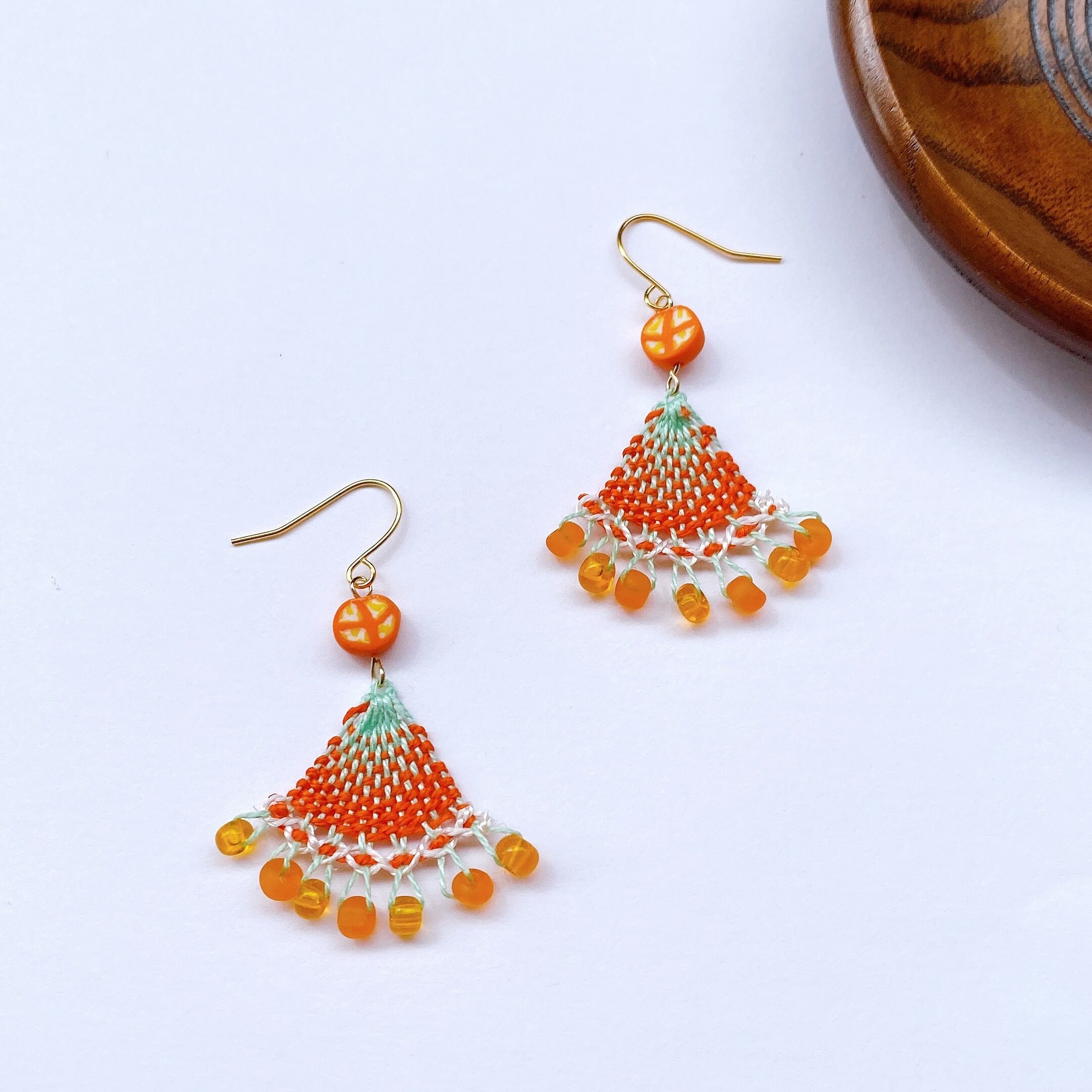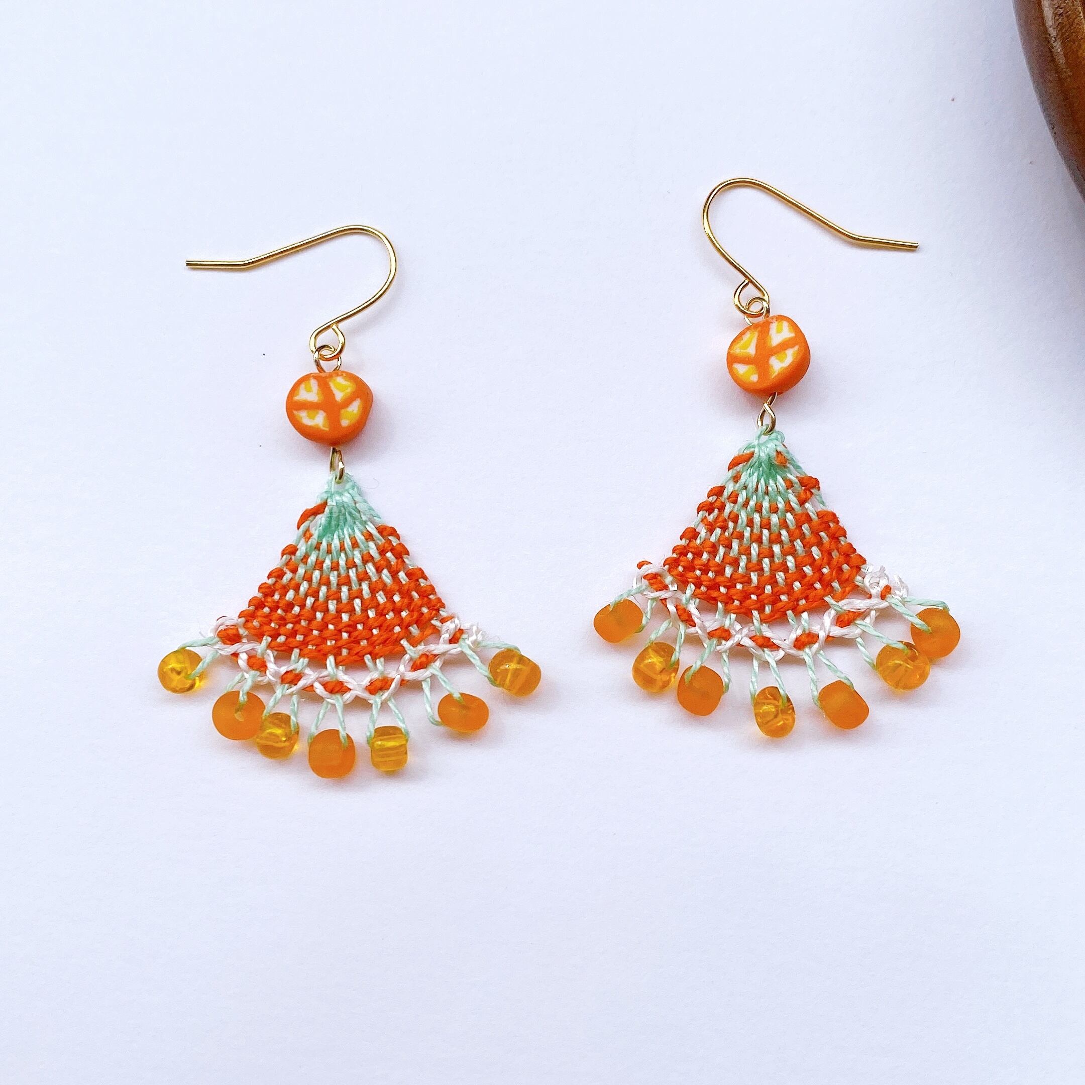 [材料]   ホワイト・オレンジ糸・大きめオレンジ色ビーズ・オリジナル樹脂ビーズ・ピアス金具