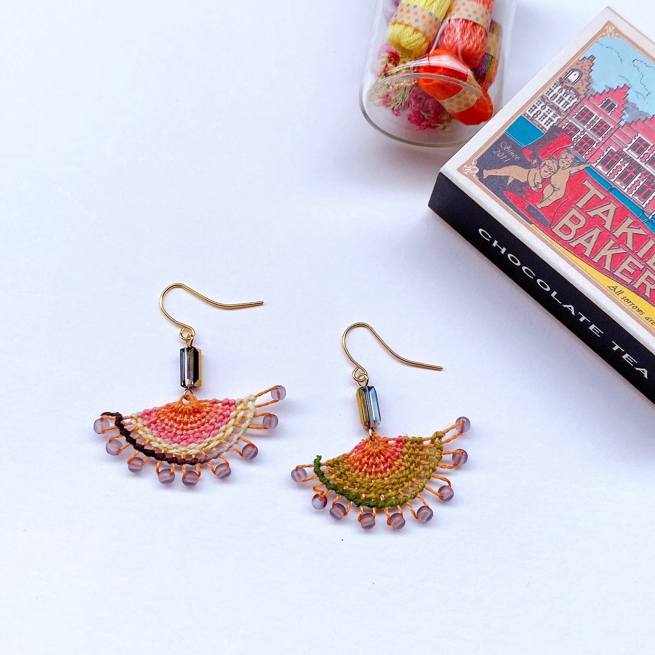 [材料]   薄いオレンジ・クラデーション糸・半透明ビーズ・ダイヤカットビーズ・ピアス金具