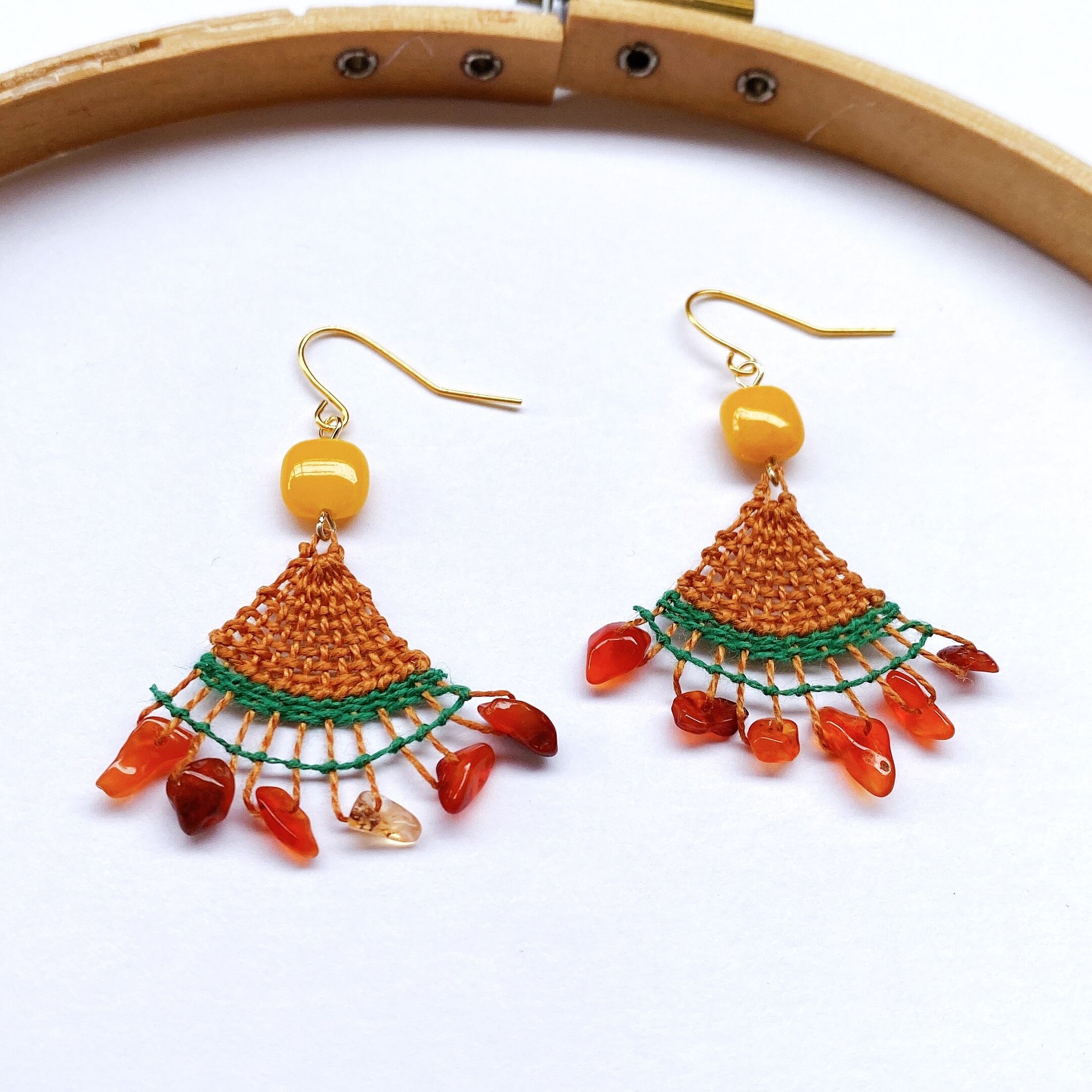 [材料]  ブラウン・グリーン糸・カーネリアンさざれビーズ・黄色ガラスビーズ・ピアス金具