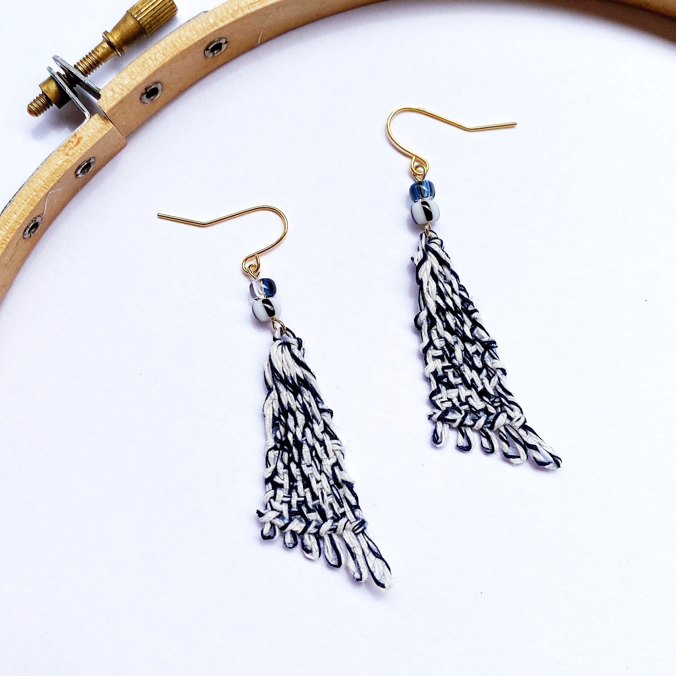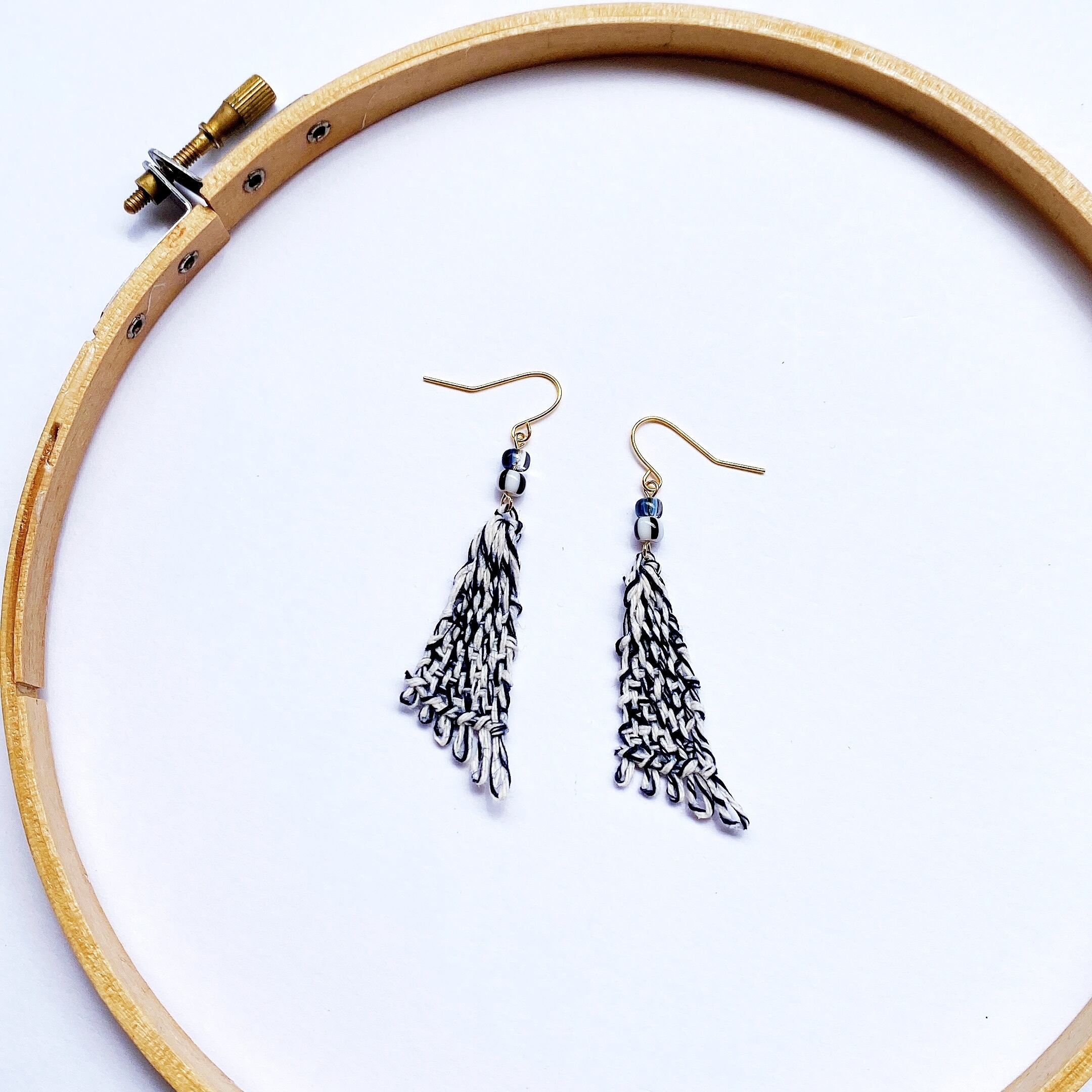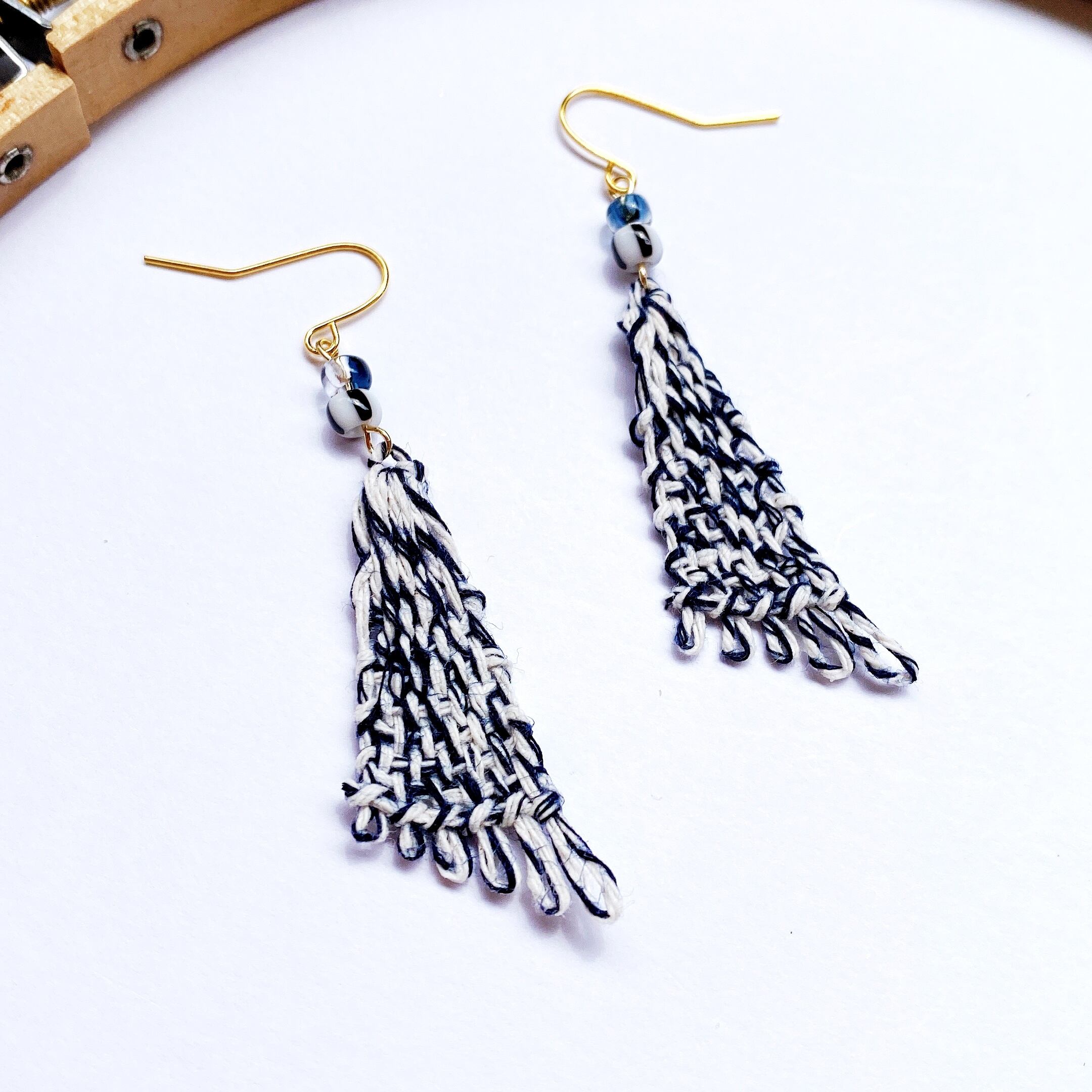 [材料]  紺色・白色糸・ストライプビーズ2色・ピアス金具