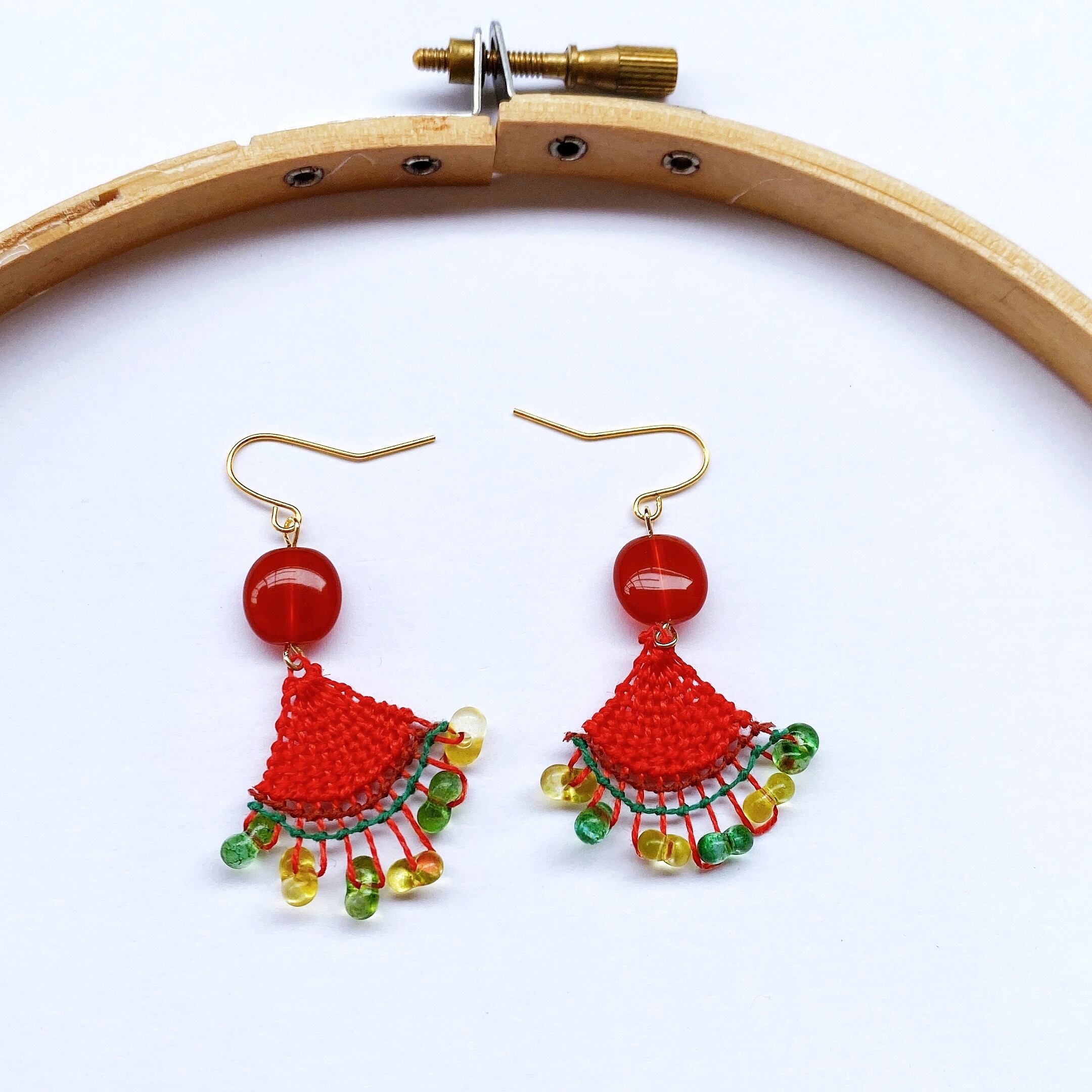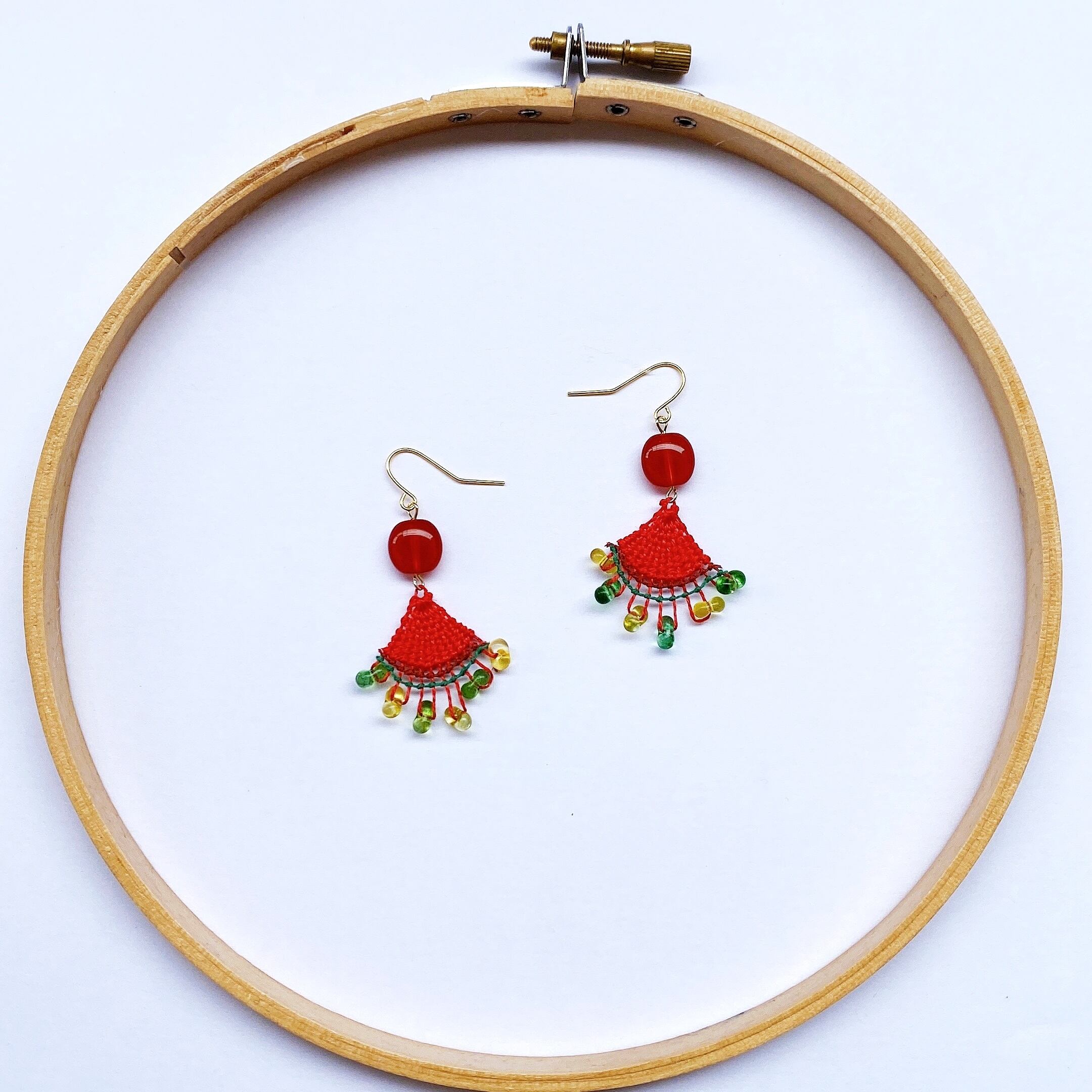 [材料]  赤色・緑色糸・ぷっくりトルコビーズ・グミのようなトルコビーズ・ピアス金具