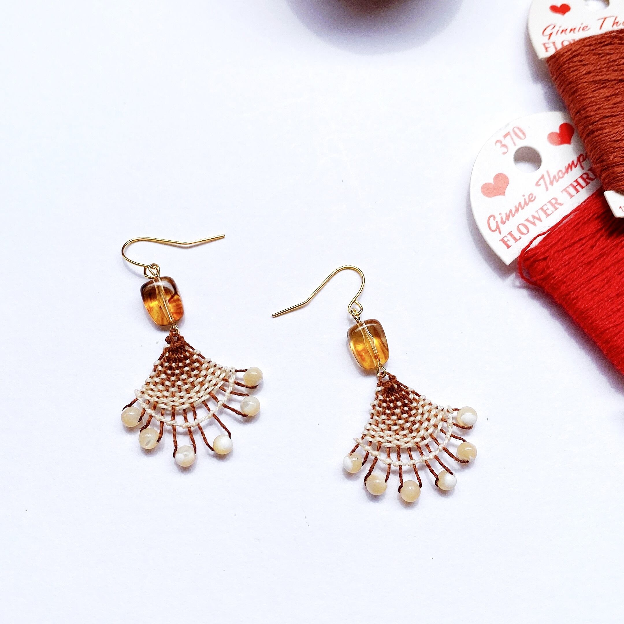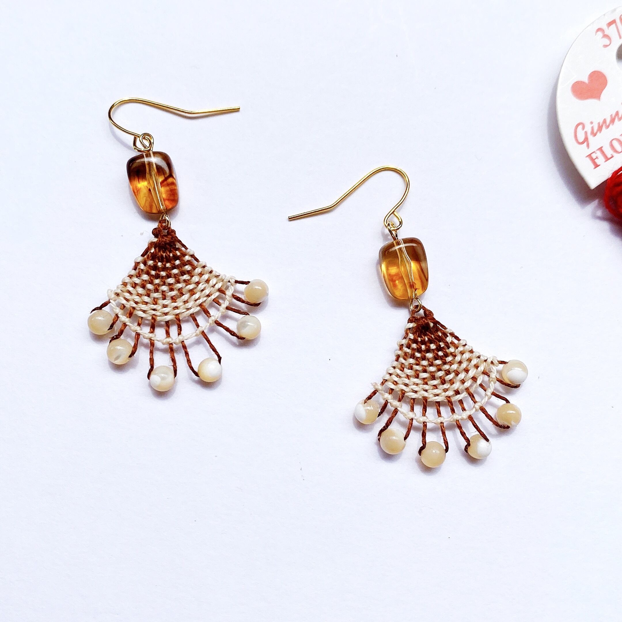 [材料]  ブラウン色・ホワイト色糸・マザーオブパール天然石ビーズ・ガラスビーズ・ピアス金具