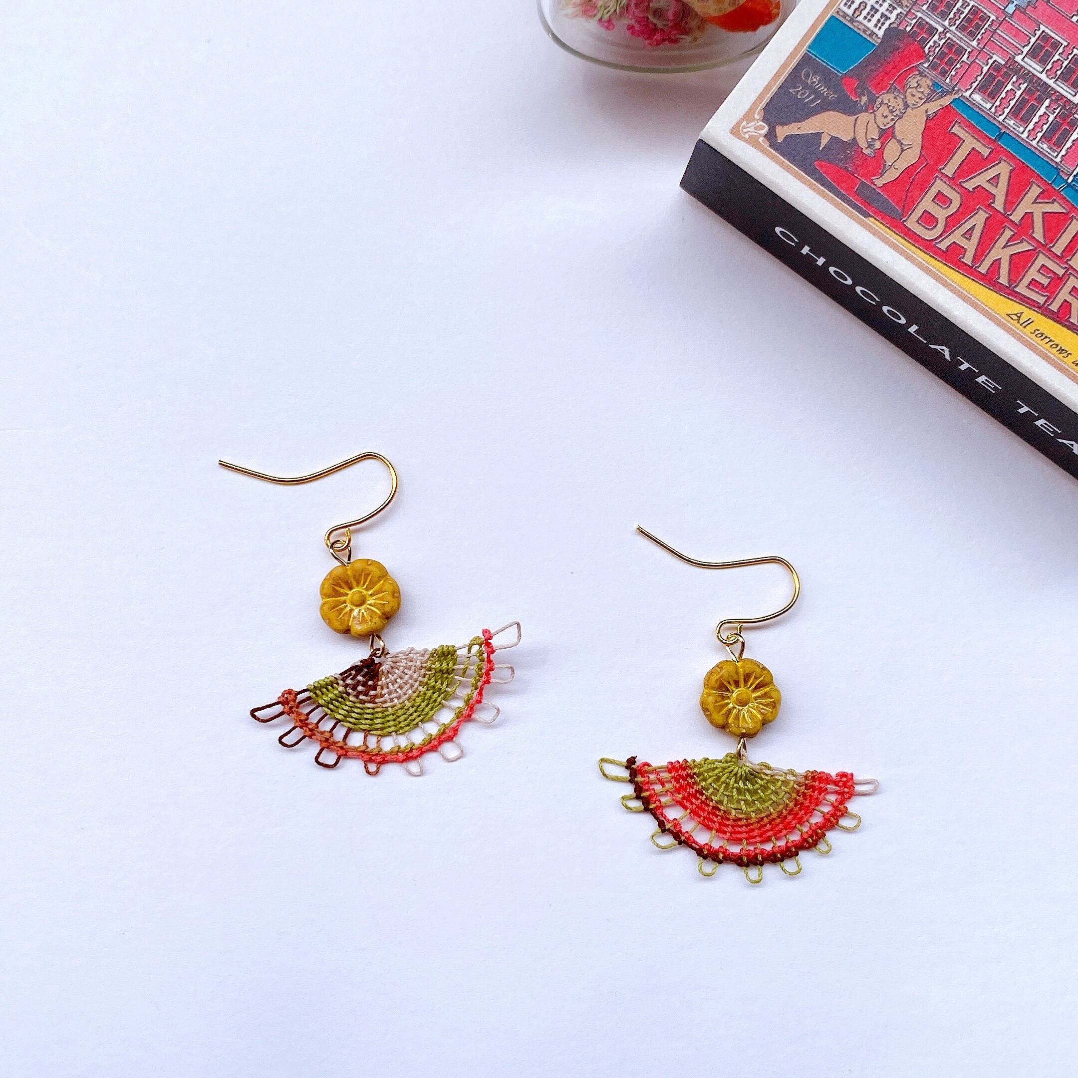 [材料]  ピンク茶色系グラデーション糸・お花型ビーズ・ピアス金具