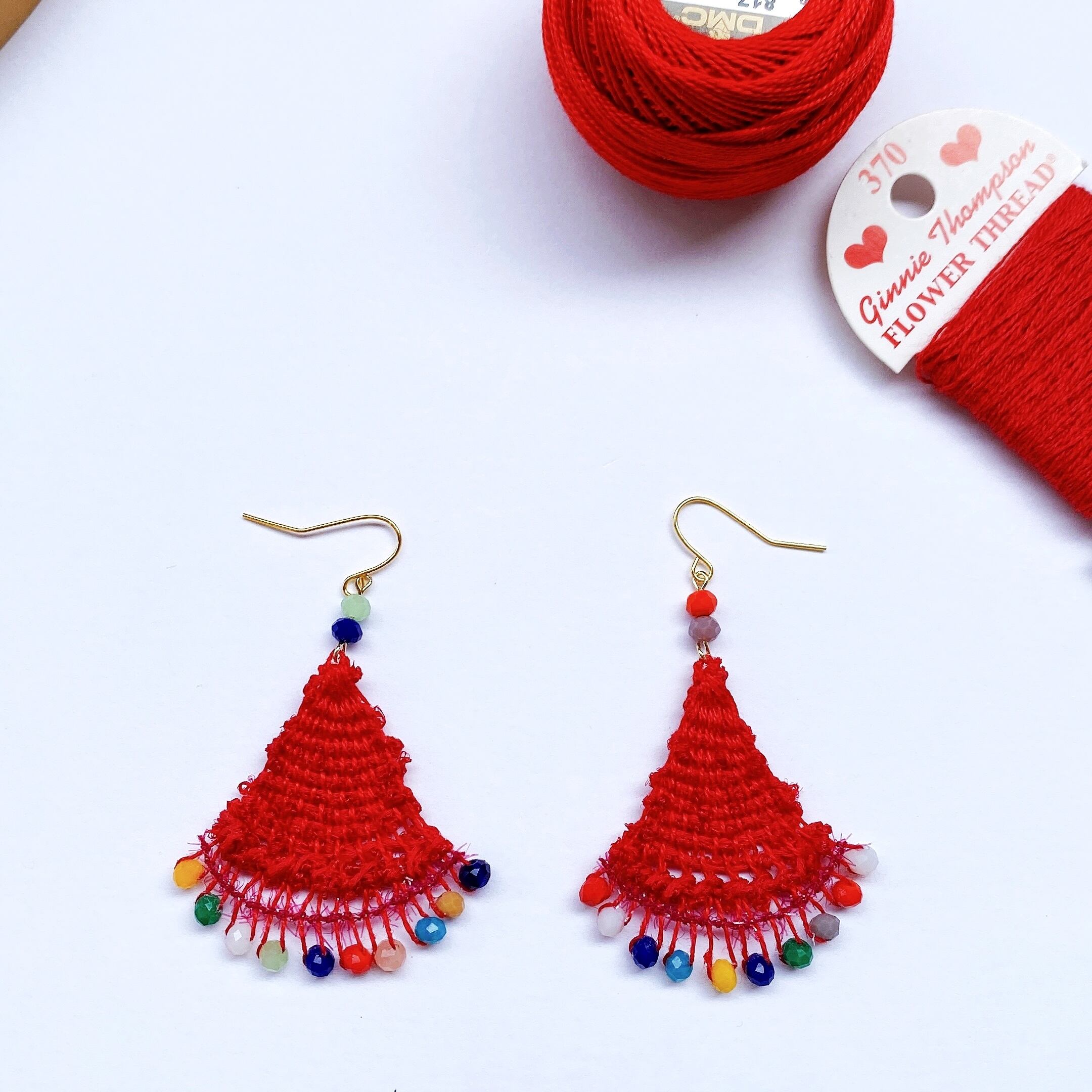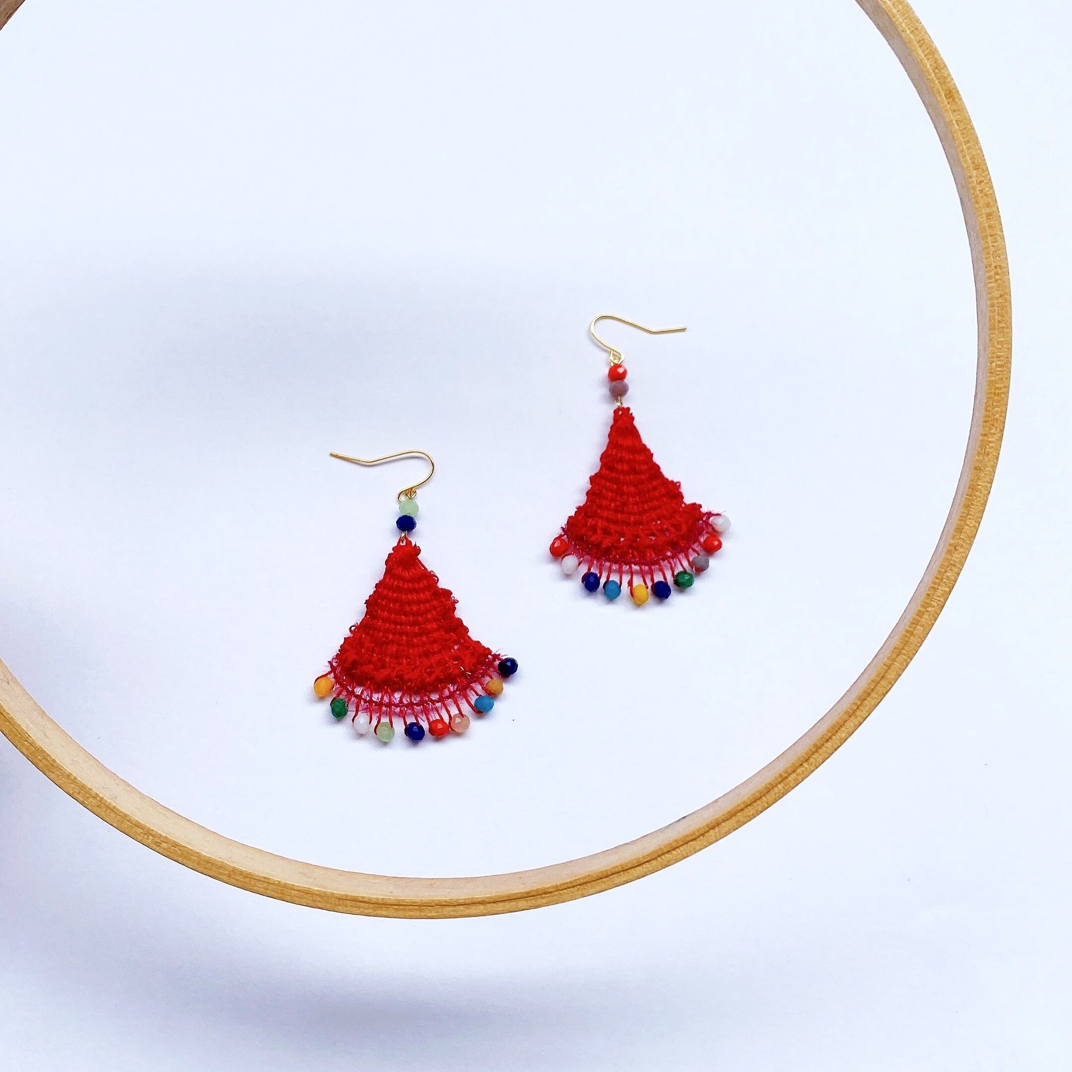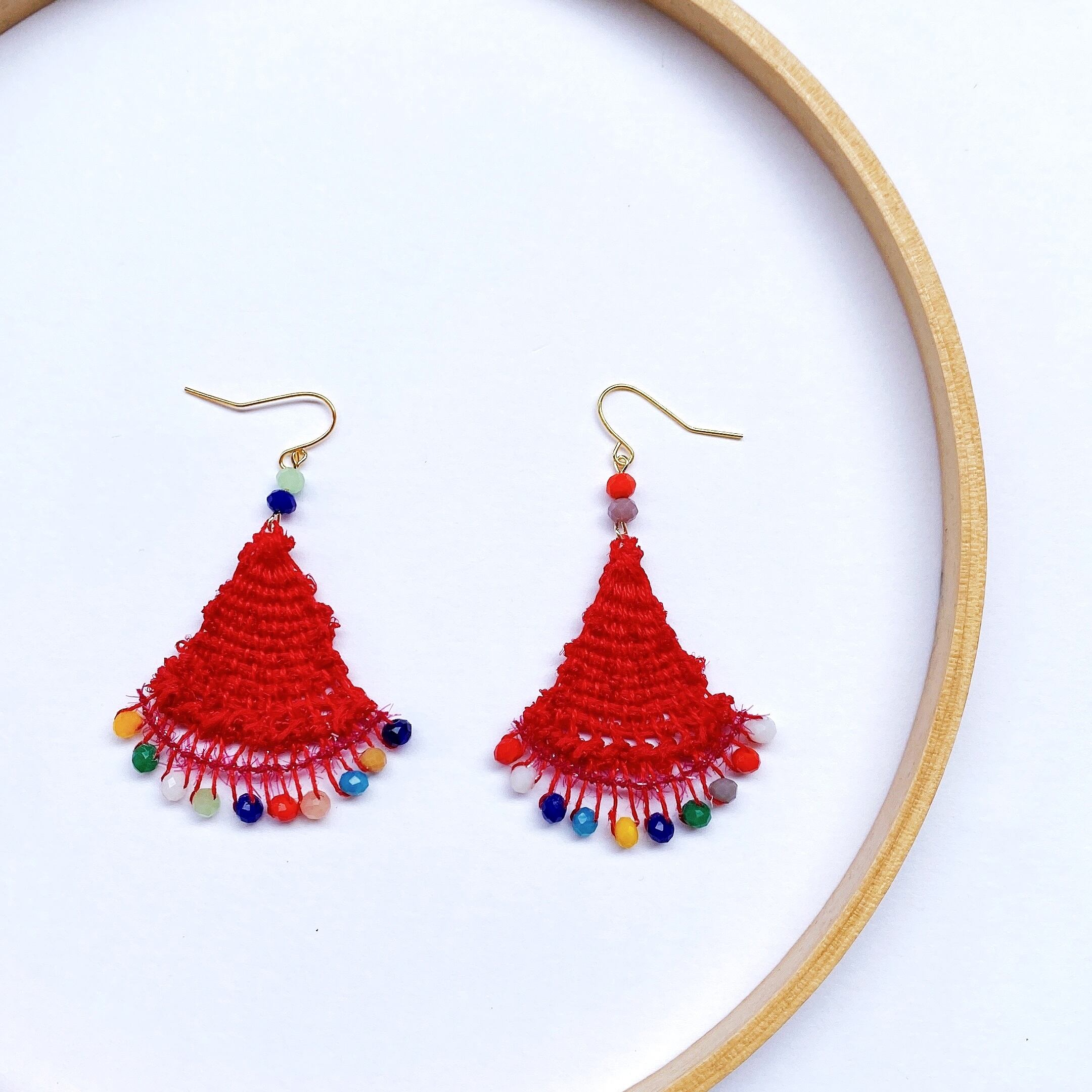 [材料]  赤色・赤色キラキラ糸・ダイヤカットカラフルビーズ・ピアス金具