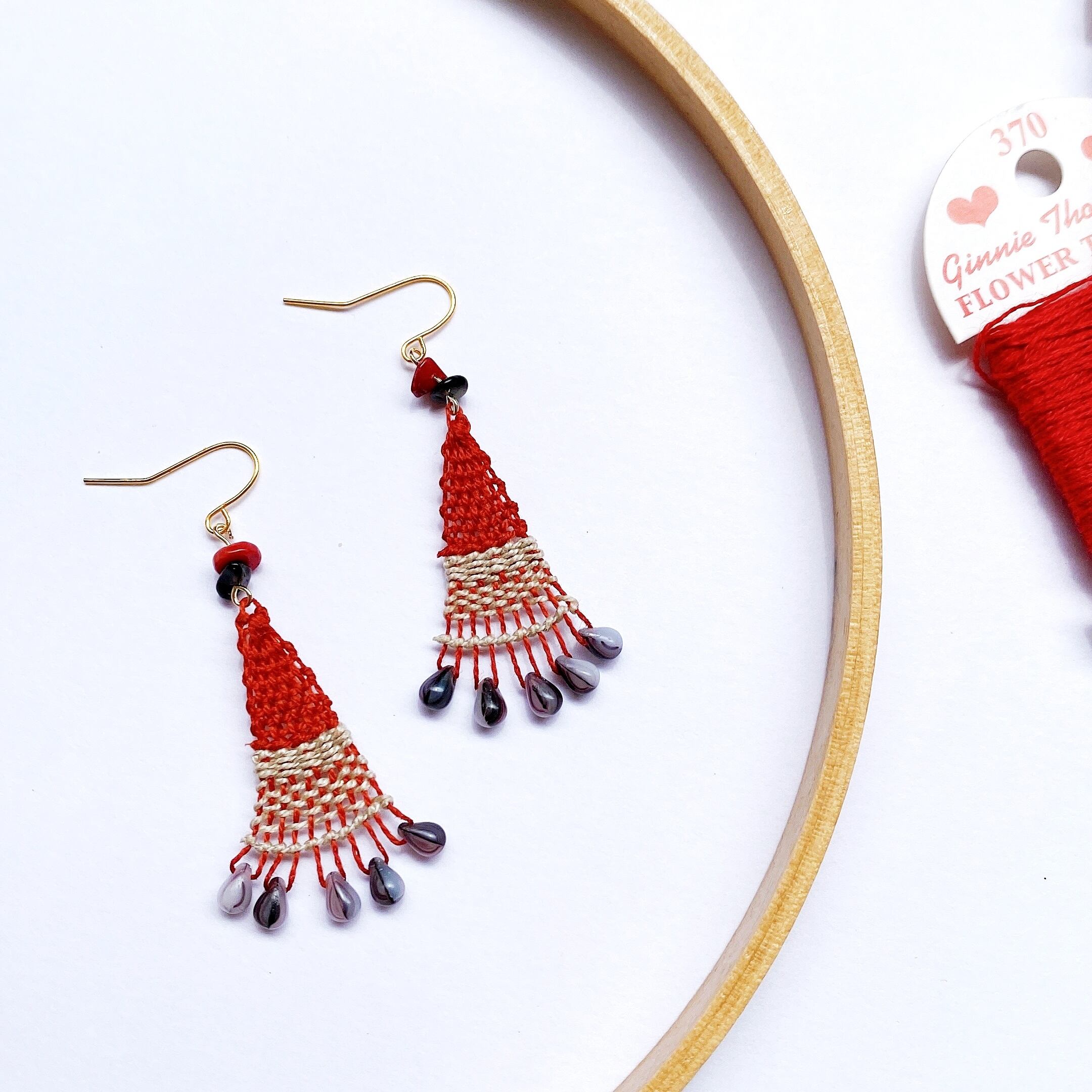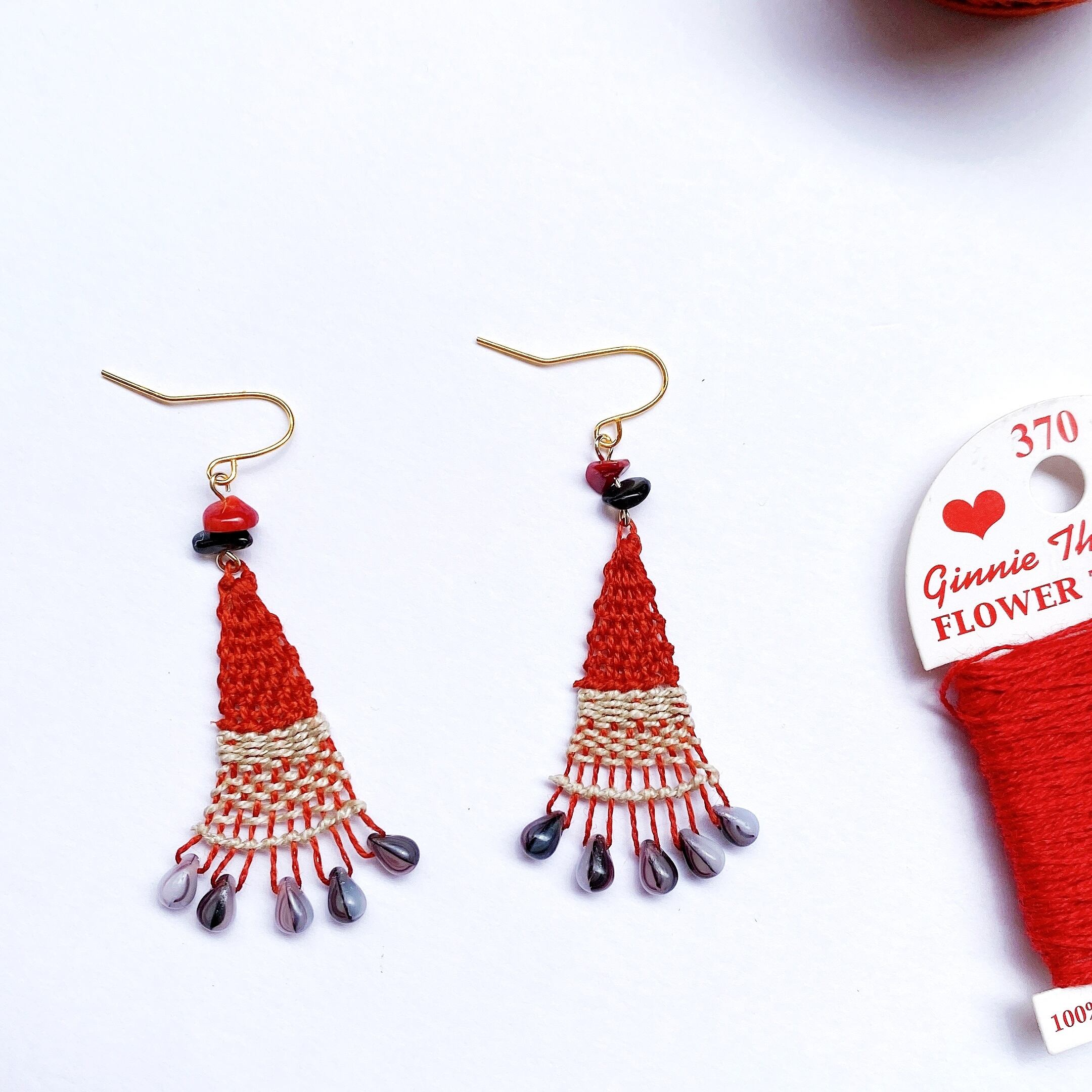 [材料]  茶色・白色糸・しずく型ビーズ・細石天然石ビーズ・ピアス金具