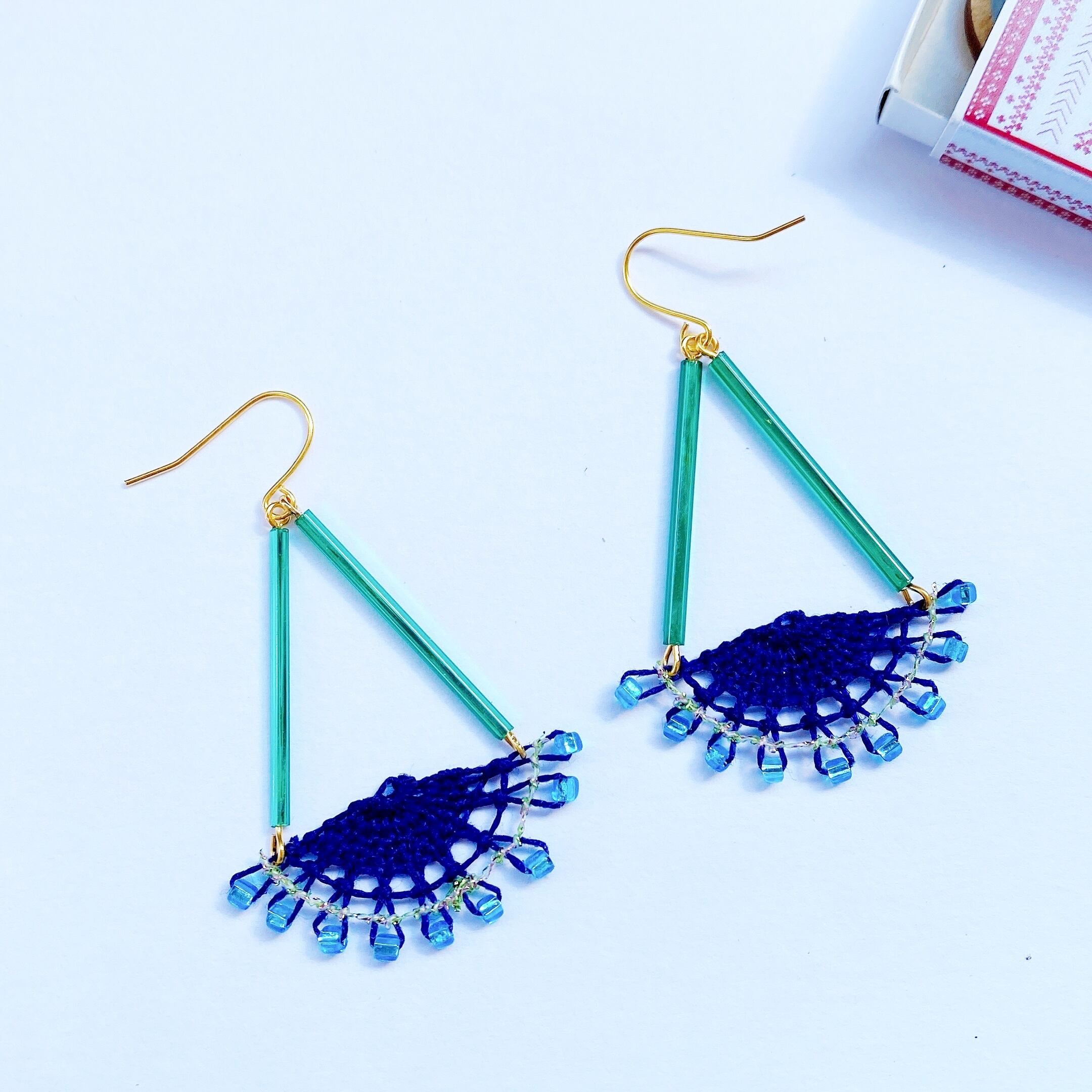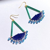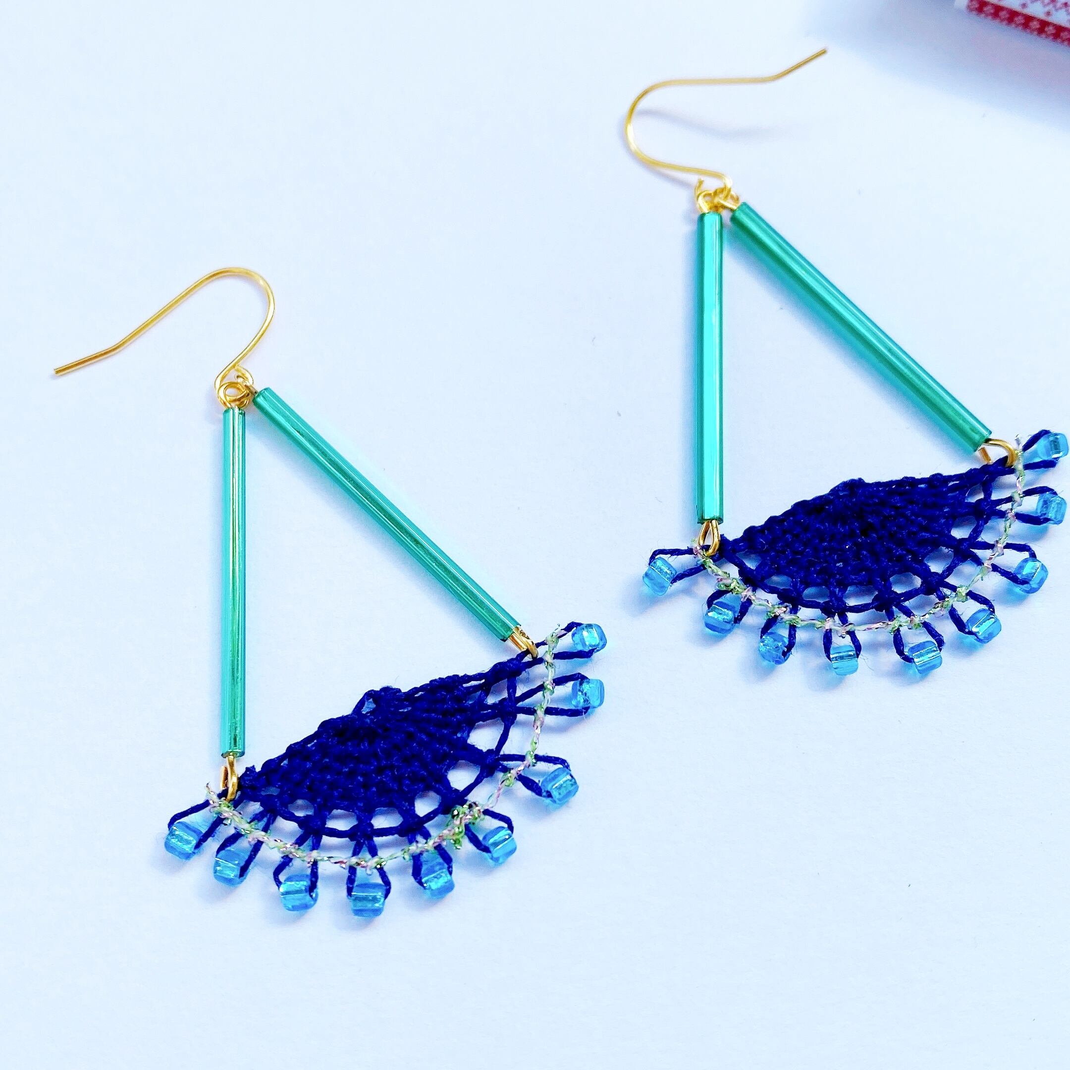 [材料]  濃い青色糸・スクエア水色ビーズ・細長いガラスビーズ・ピアス金具