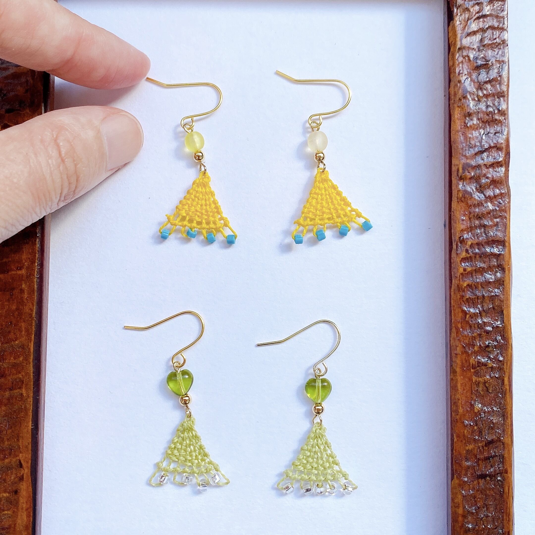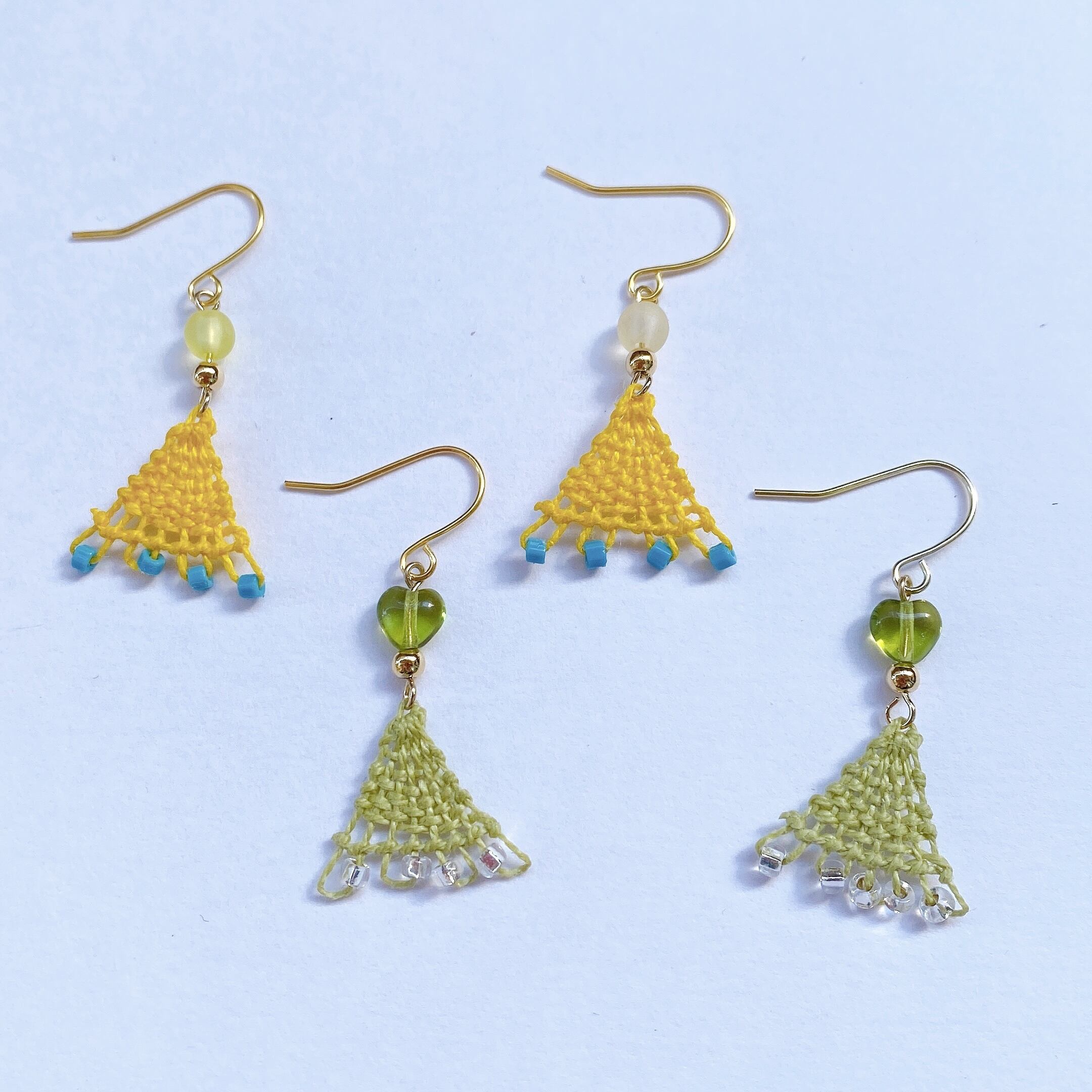 [材料]  イエロー・グリーン糸・極小ガラスビーズ・トルコガラスビーズ・ピアス金具
