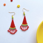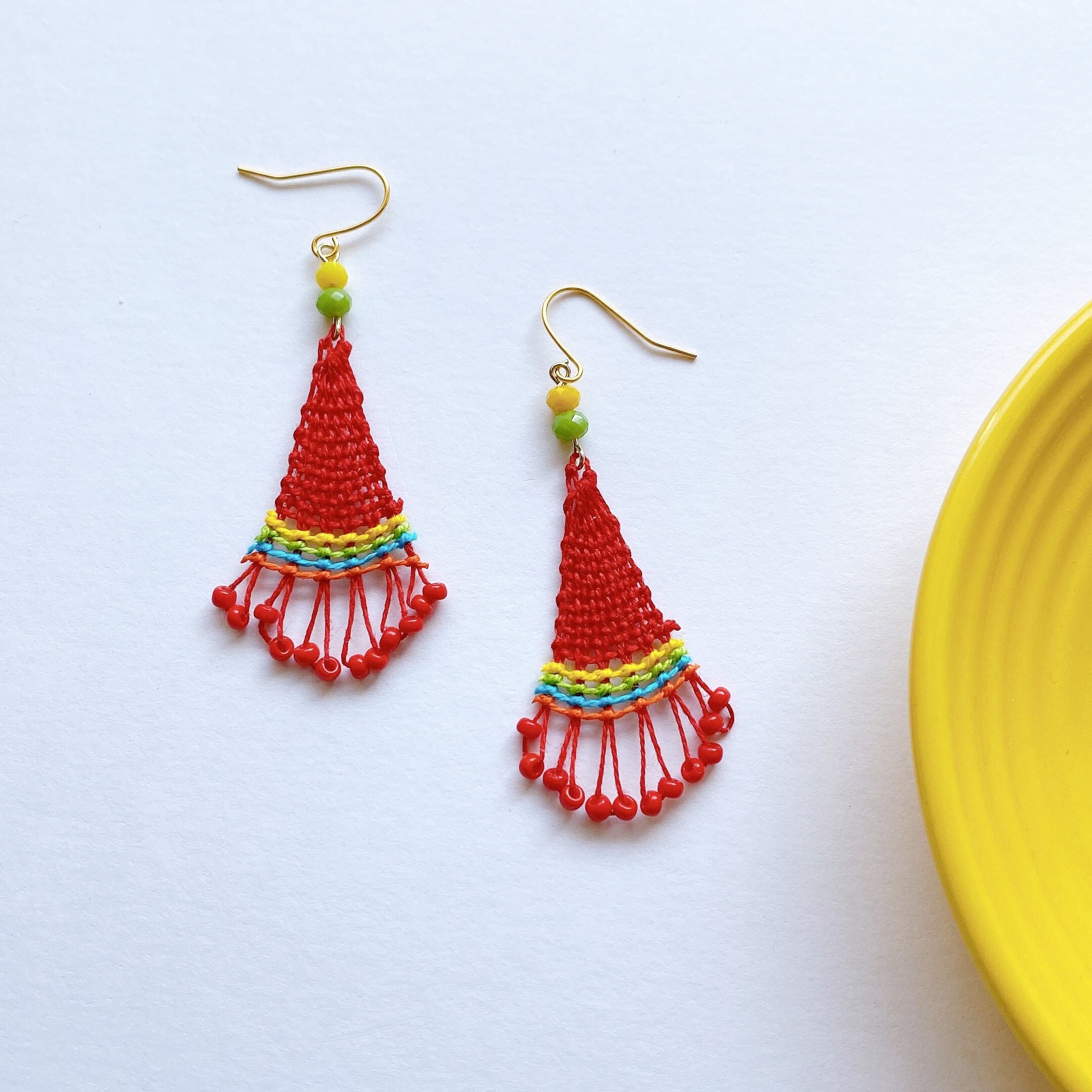 [材料]   赤色・虹色糸・極小ガ赤色ガラスビーズ・ダイヤカットビーズ・ピアス金具