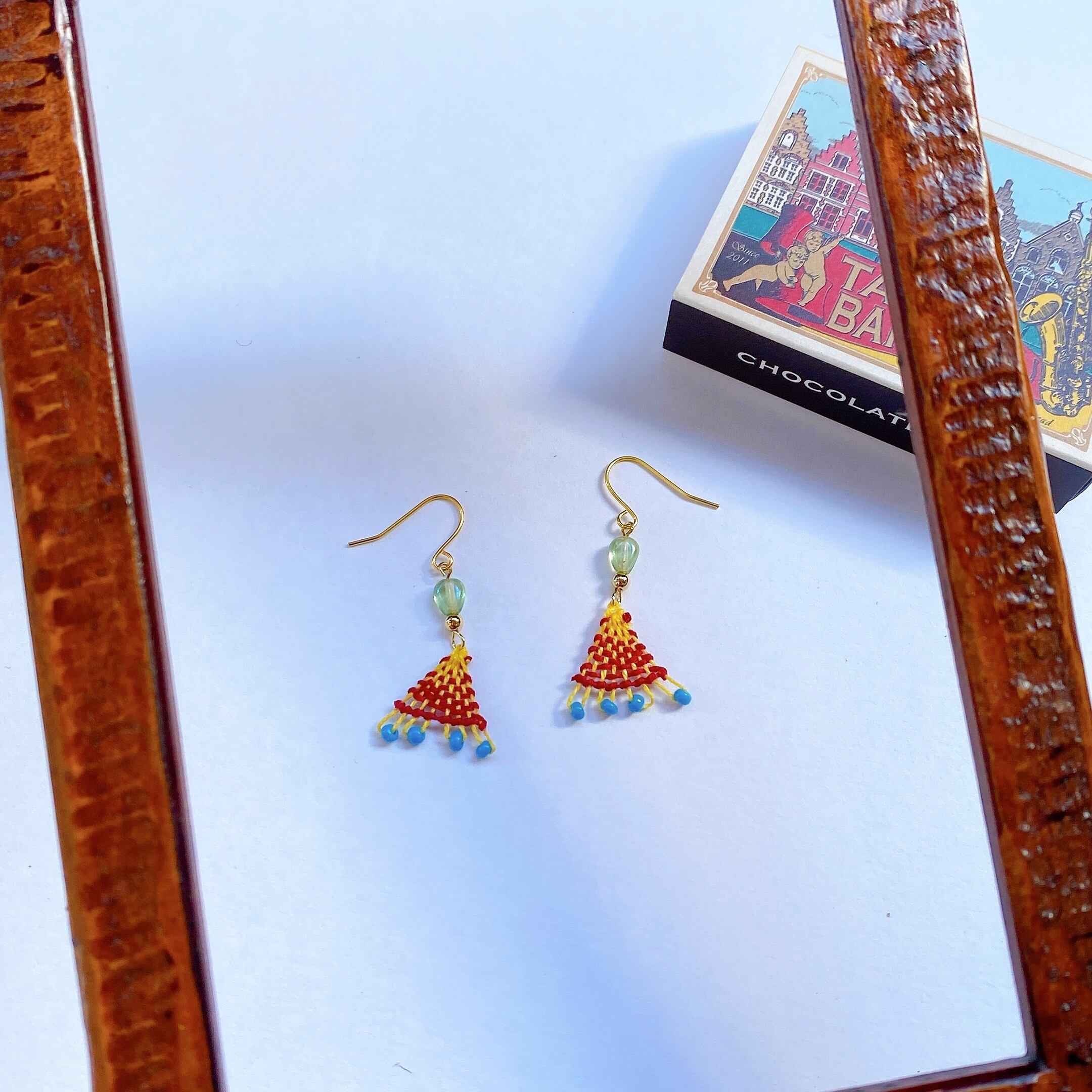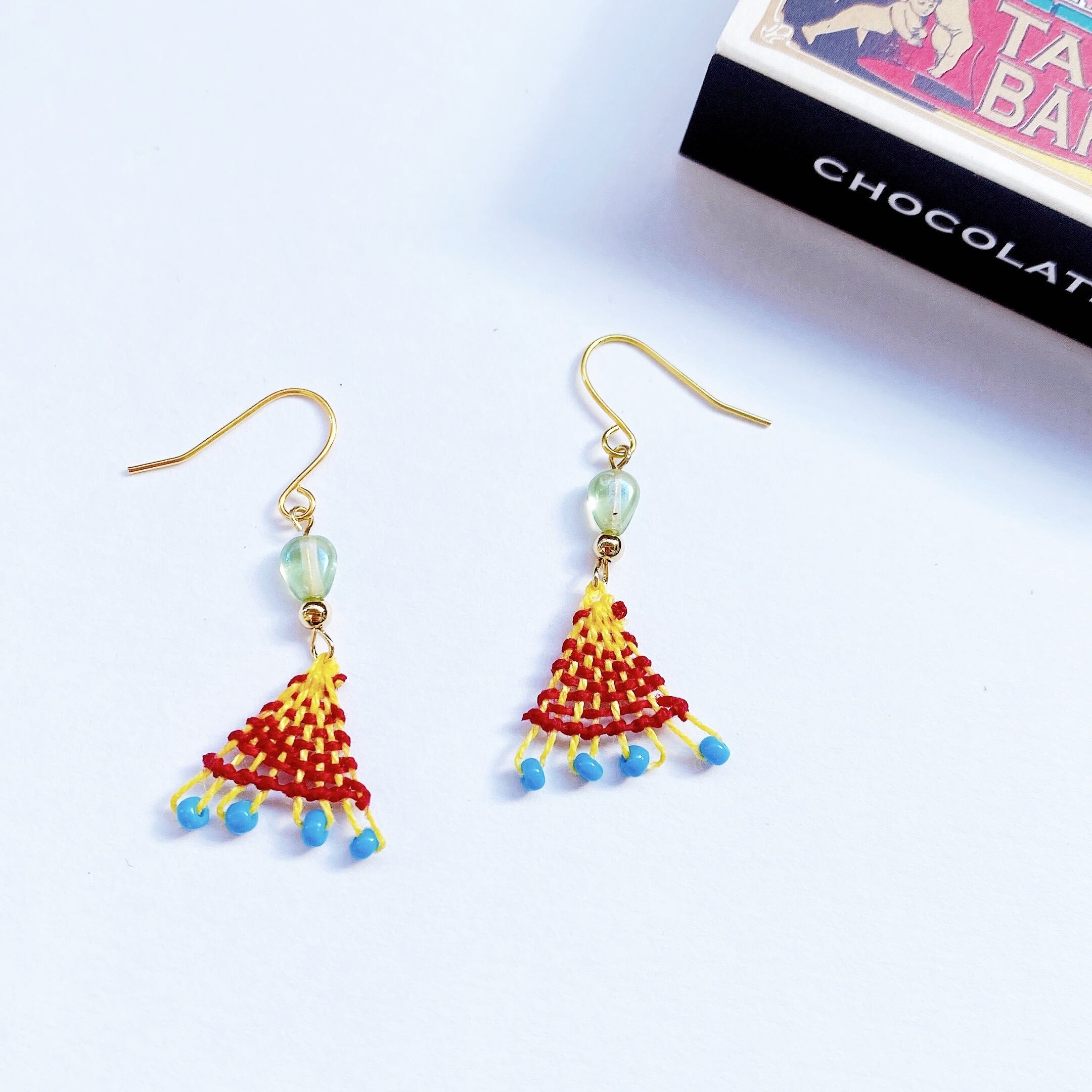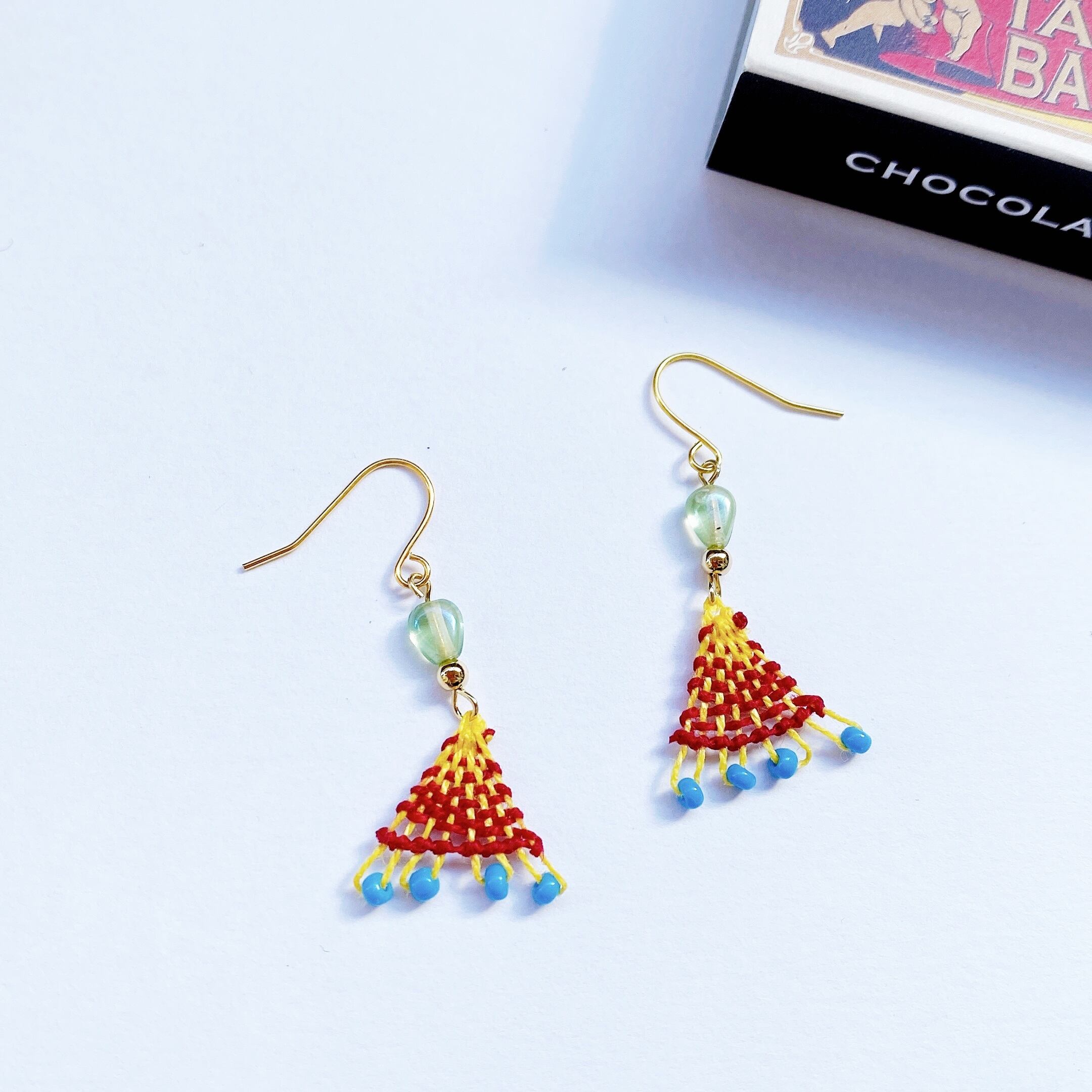 [材料]   イエロー/赤色糸・極小ビーズ・トルコガラスビーズ・ピアス金具