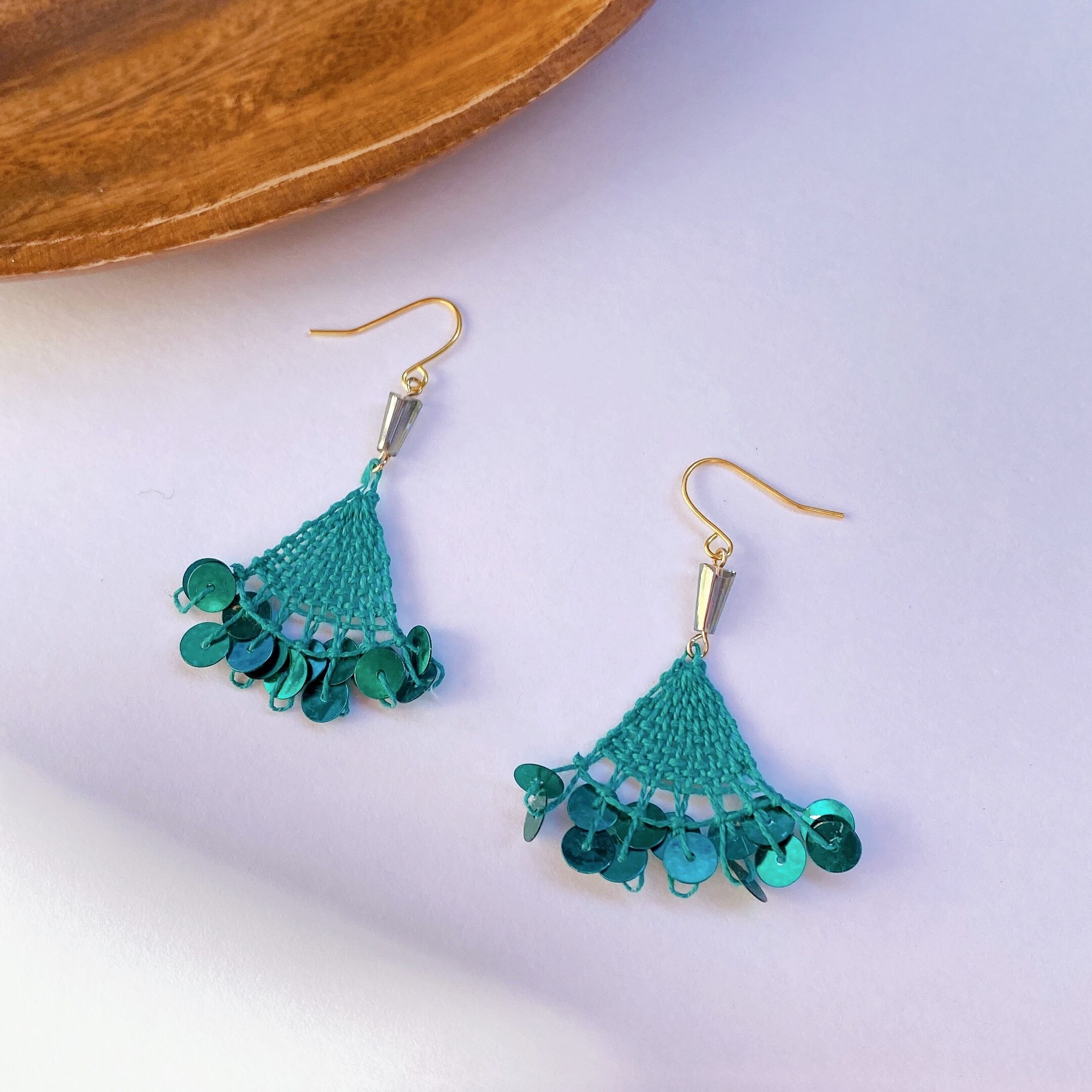 [材料]   ターコイズグリーン糸・スパンコールビーズ・青みシルバーガラスビーズ・ピアス金具