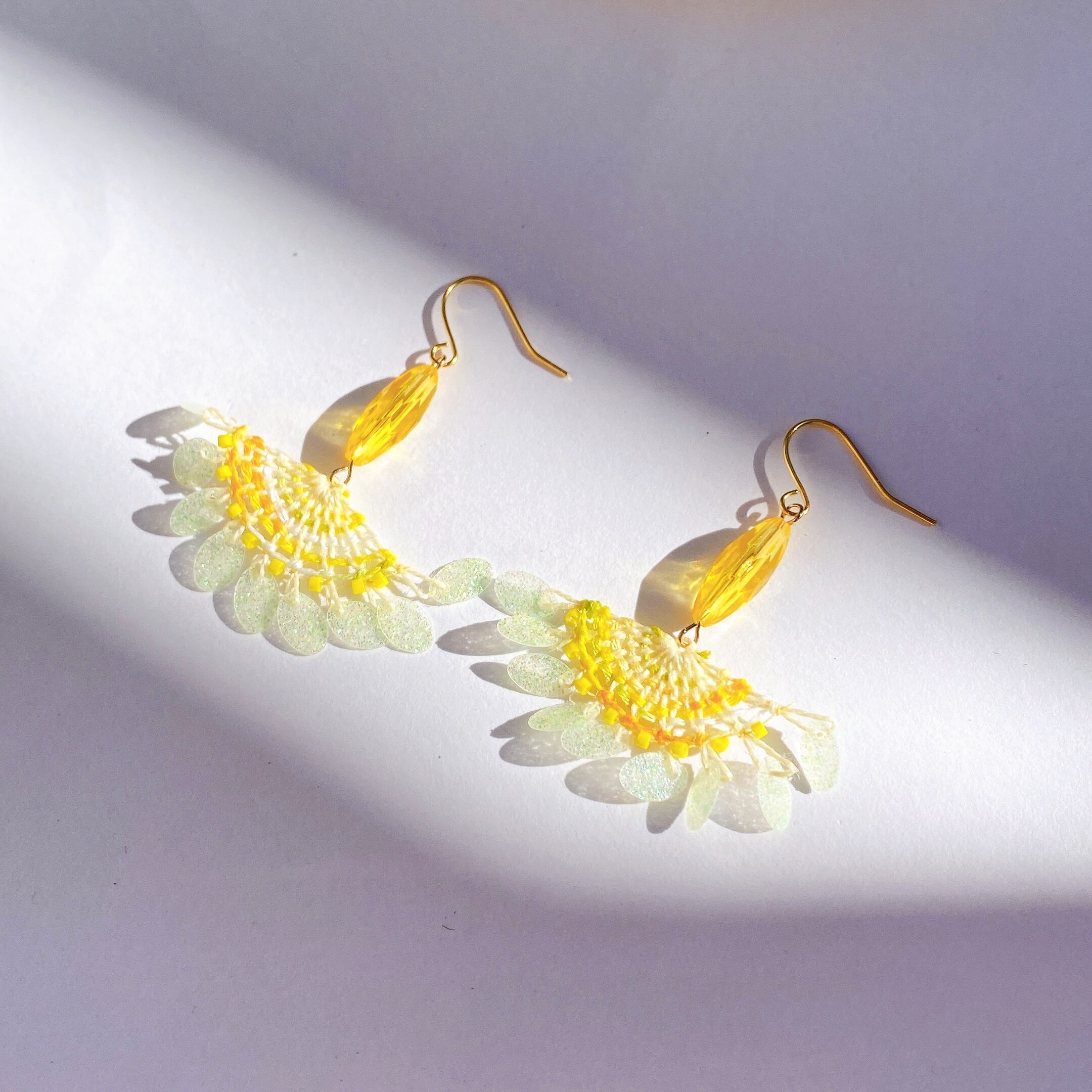 [材料]   薄いイエロー・イエローグラデーション糸・ラメ入りスパンコールビーズ・アクリルビーズ・ピアス金具