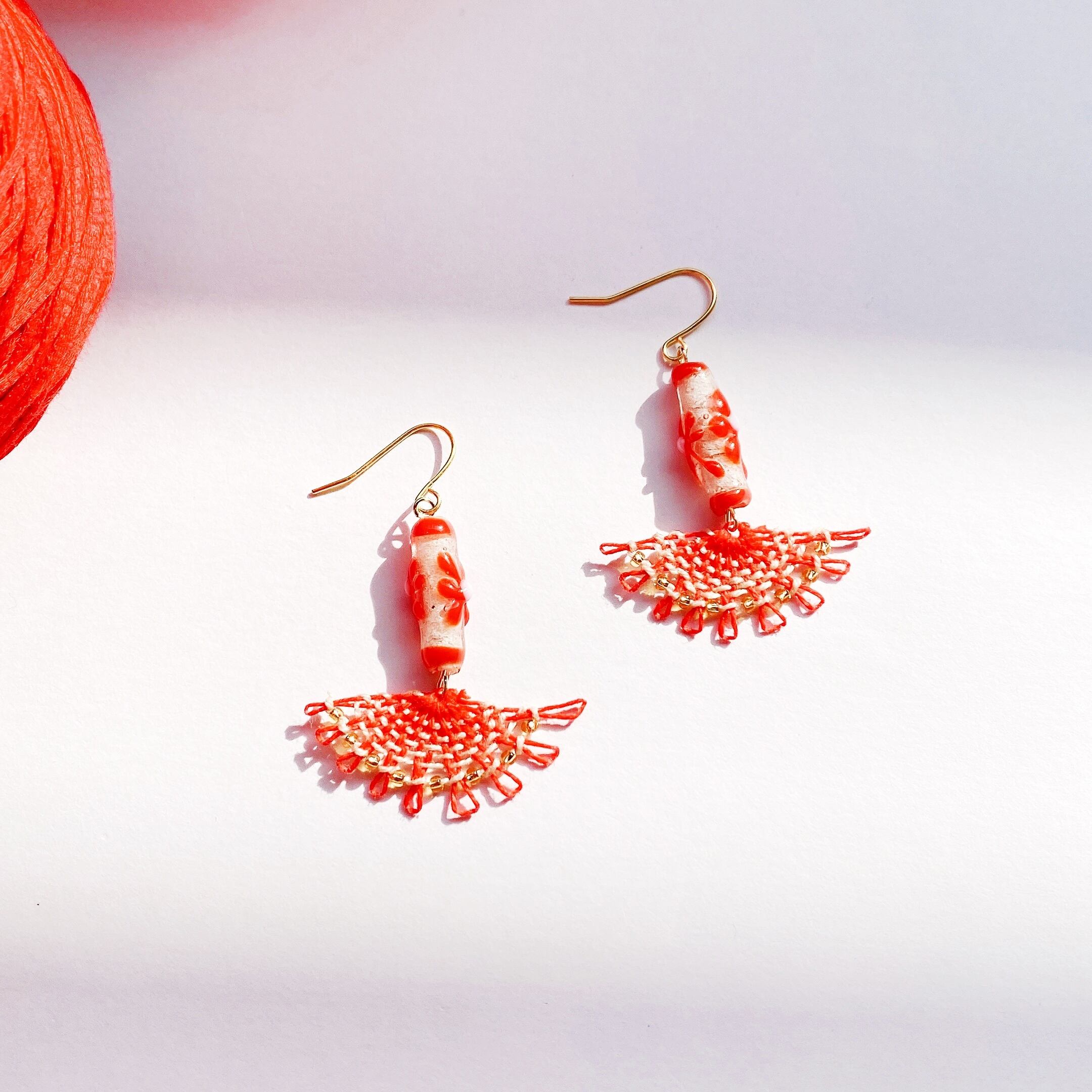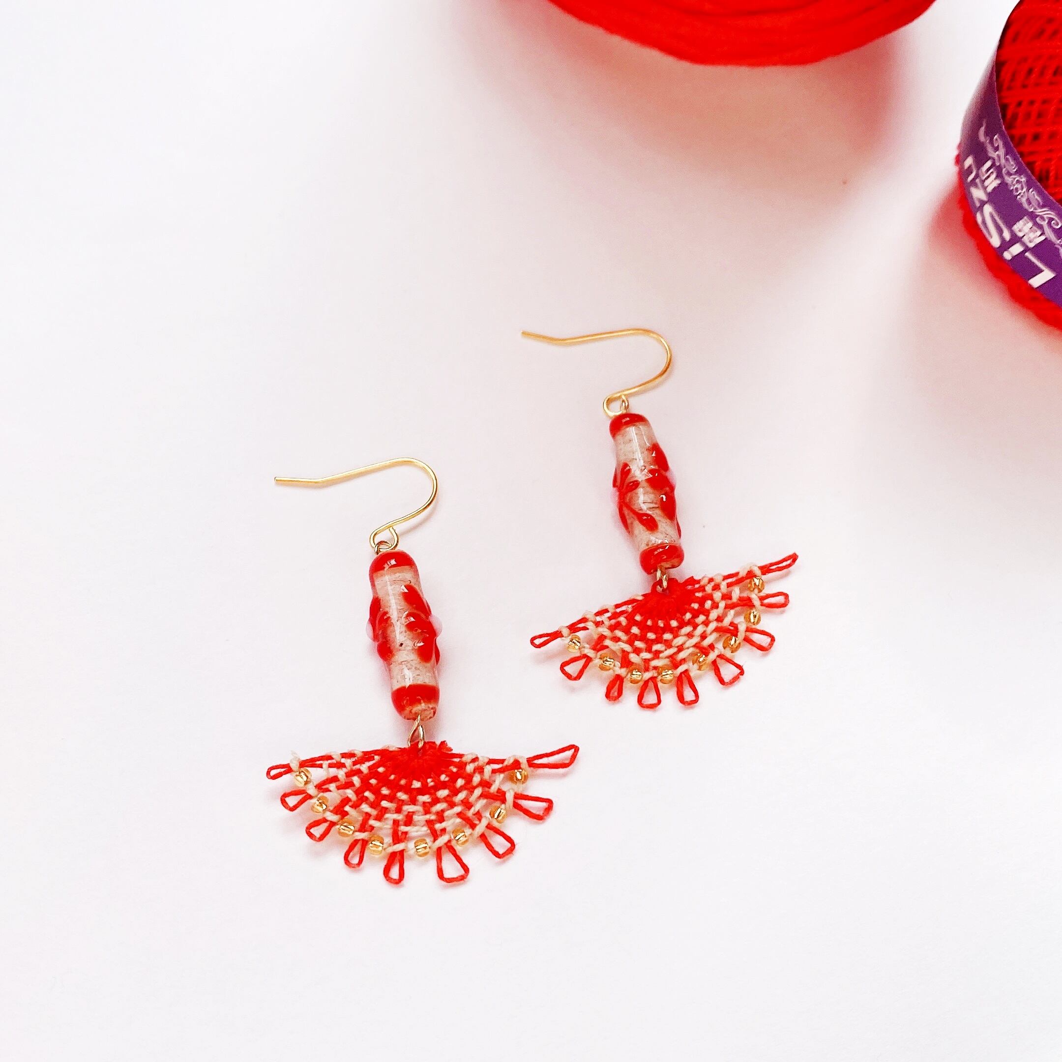 [材料]   赤/白糸・デザインガラスビーズ・極小ゴールドガラスビーズ・ピアス金具