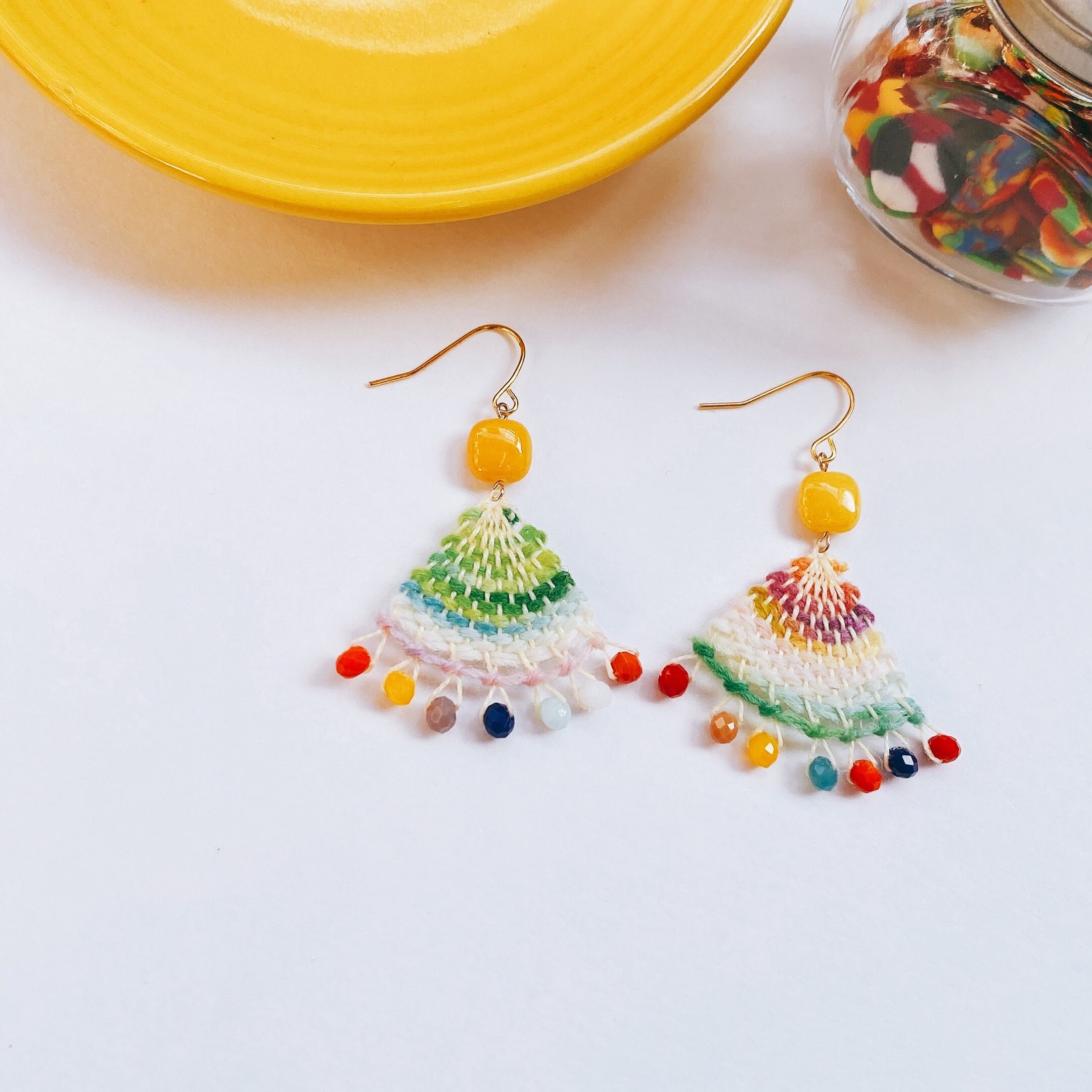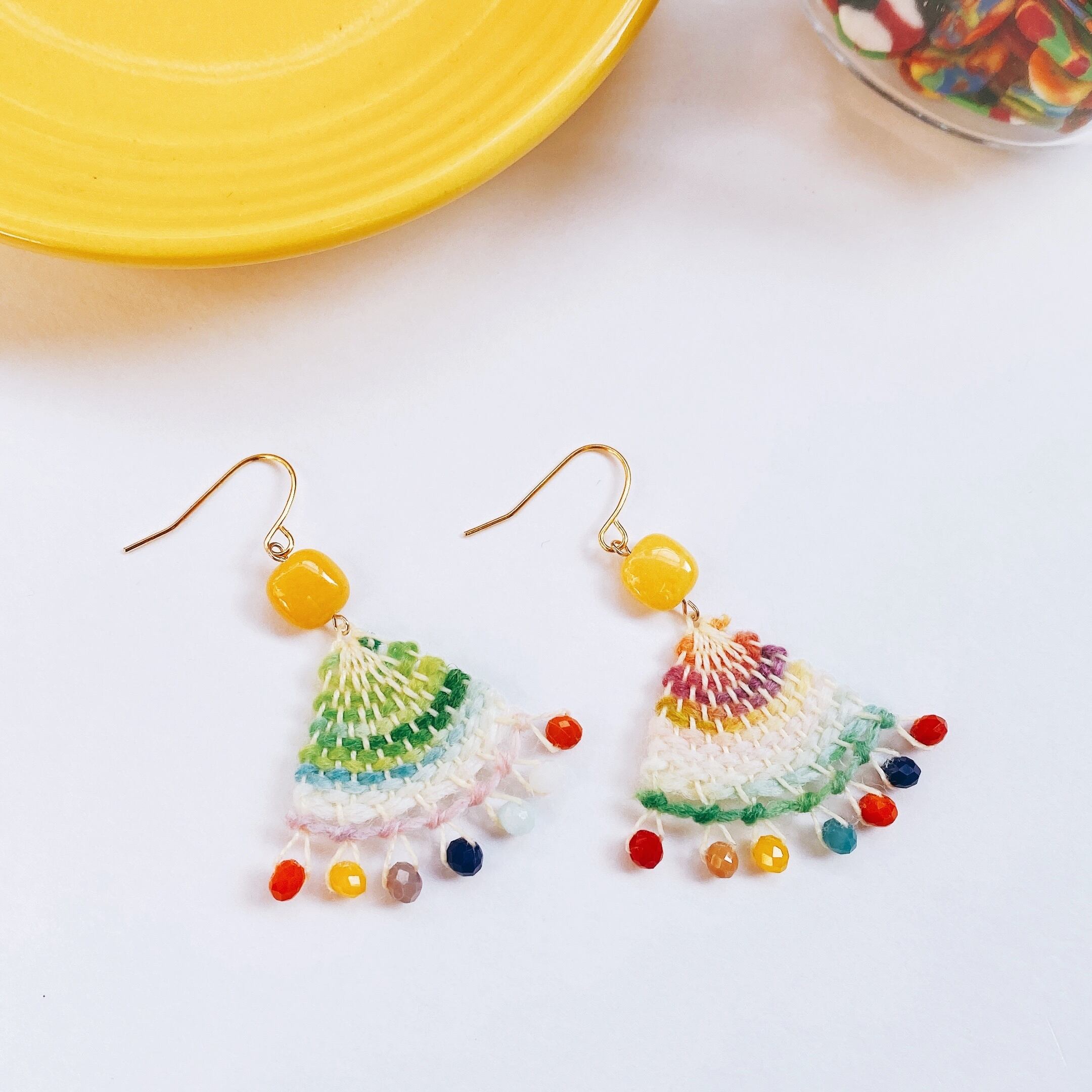 [材料]     ホワイト・手染め毛糸・ガラスカラフルビース・トルコビーズ・ピアス金具