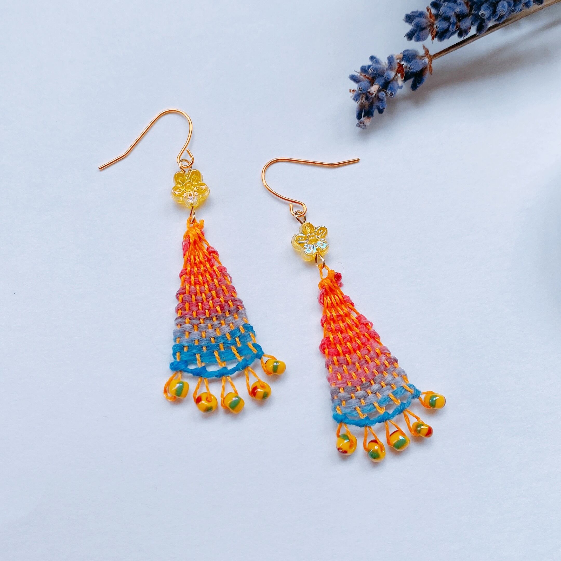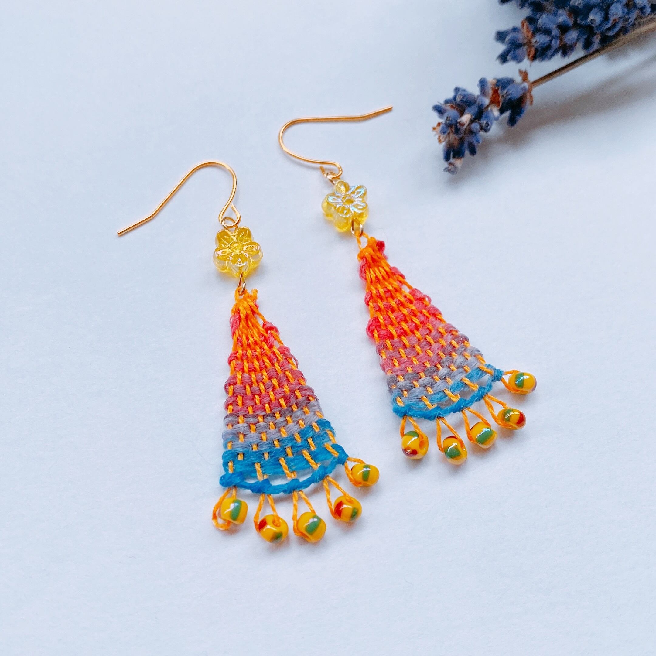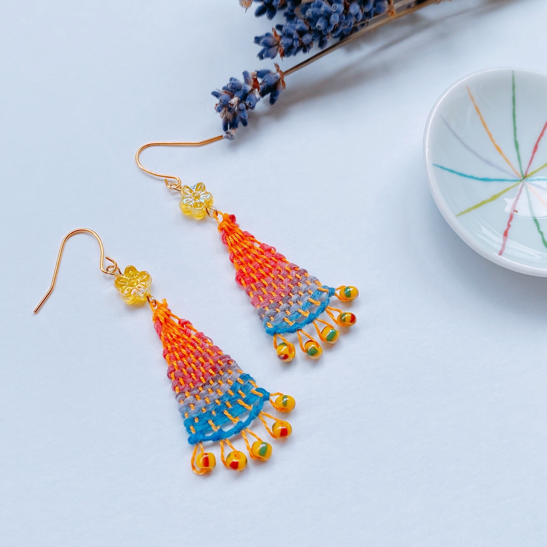 [材料]     薄いイエロー・手染め糸・ストライプビース・お花モチーフビース・ピアス金具