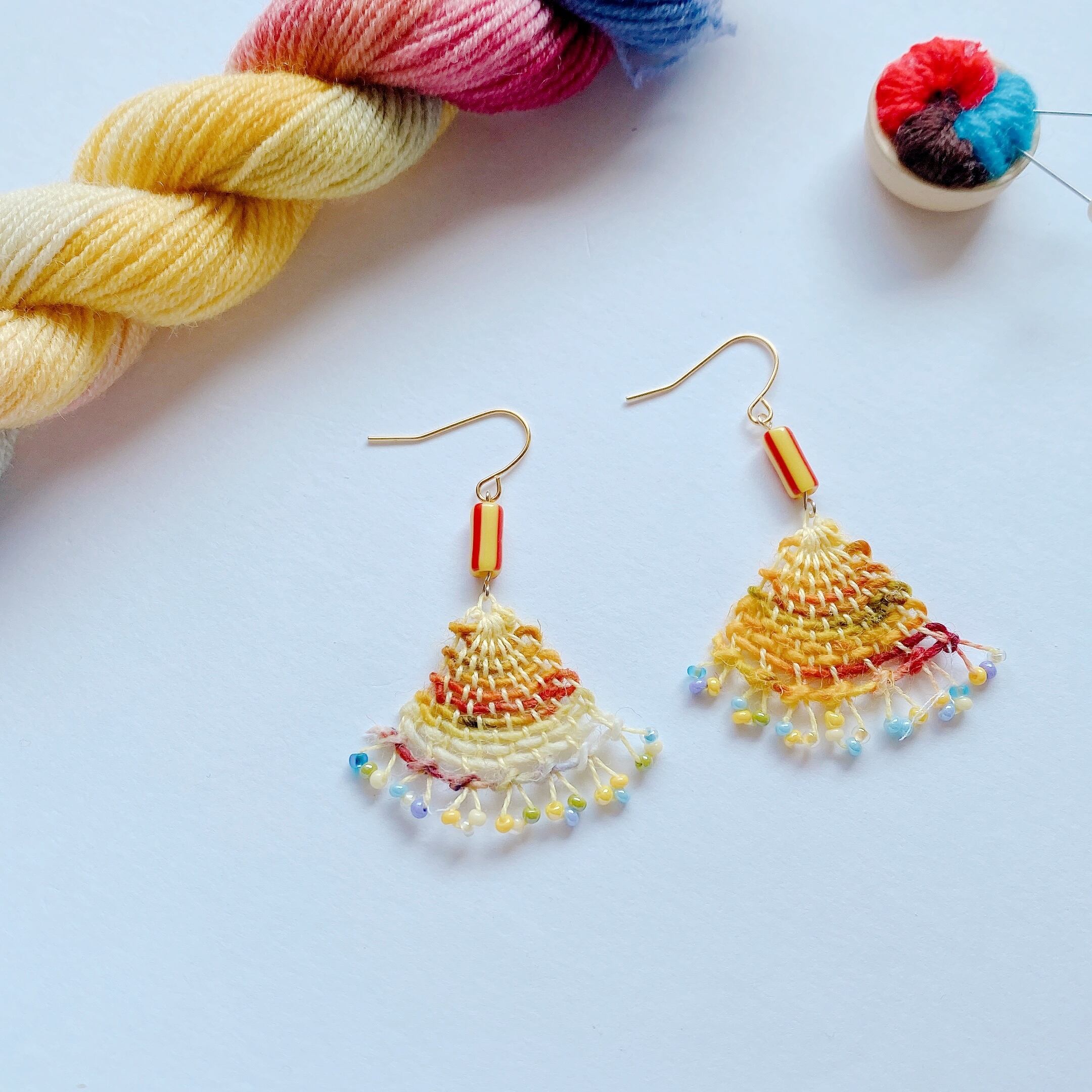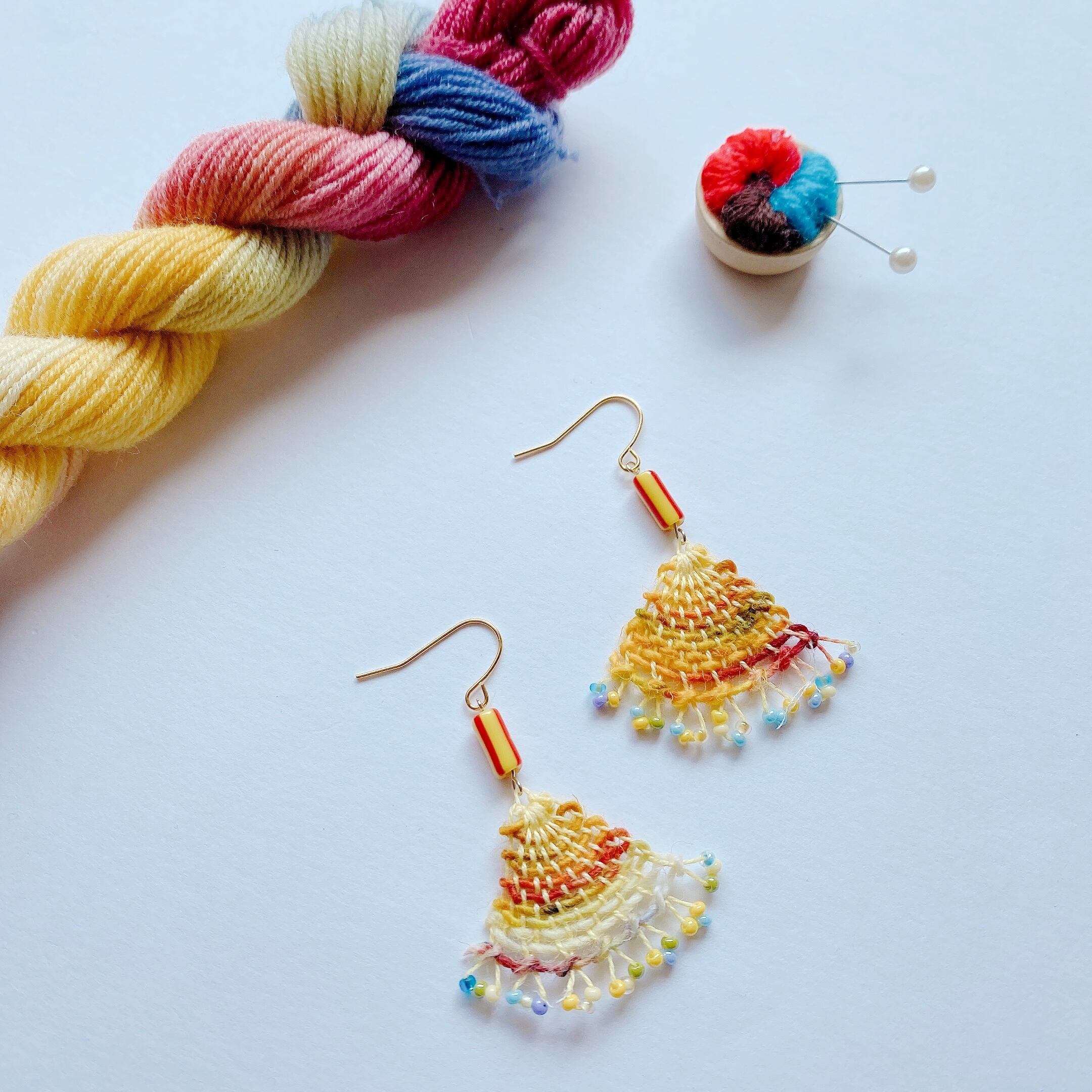 [材料]     薄いイエロー糸・グラデーション手染め糸・極小パステルビーズ・竹型イエロービーズ・ピアス金具