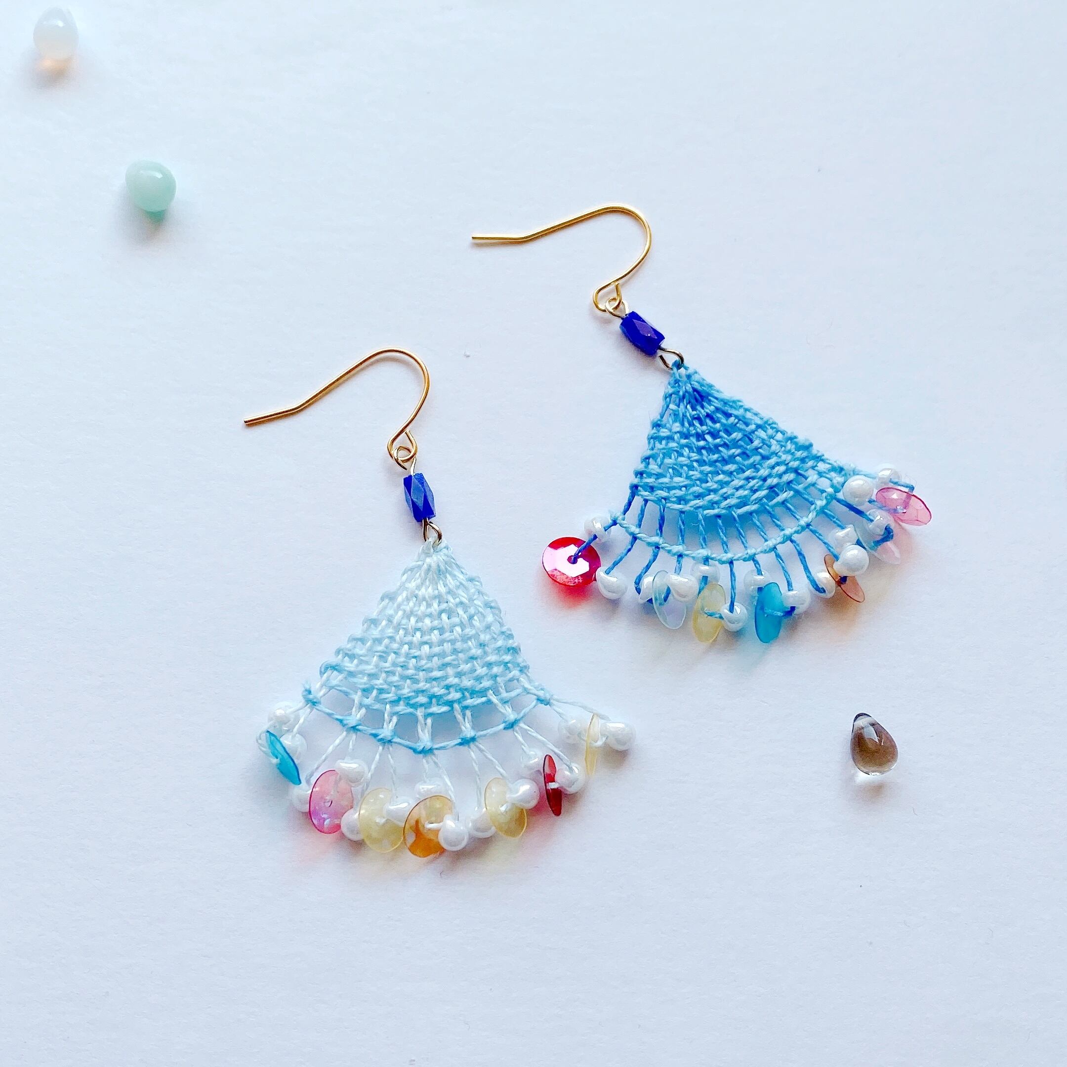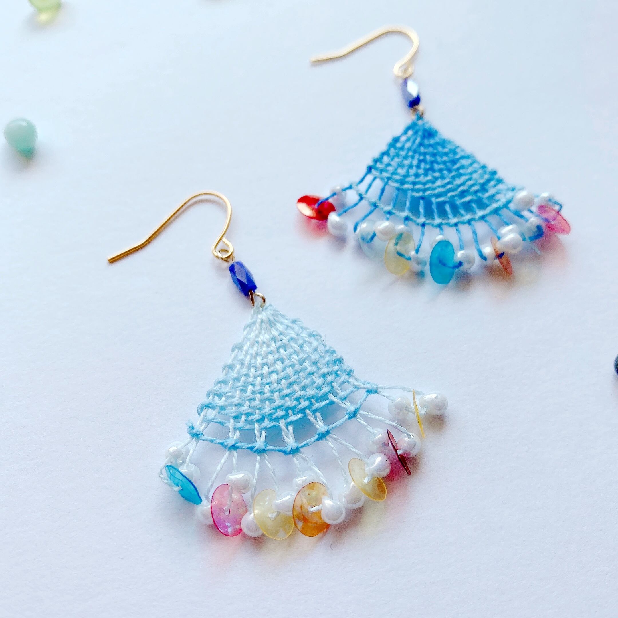 [材料]     DMC白色糸・グラデーション手染めブルー糸・パールビーズ・シーグラススパンコール・ピアス金具