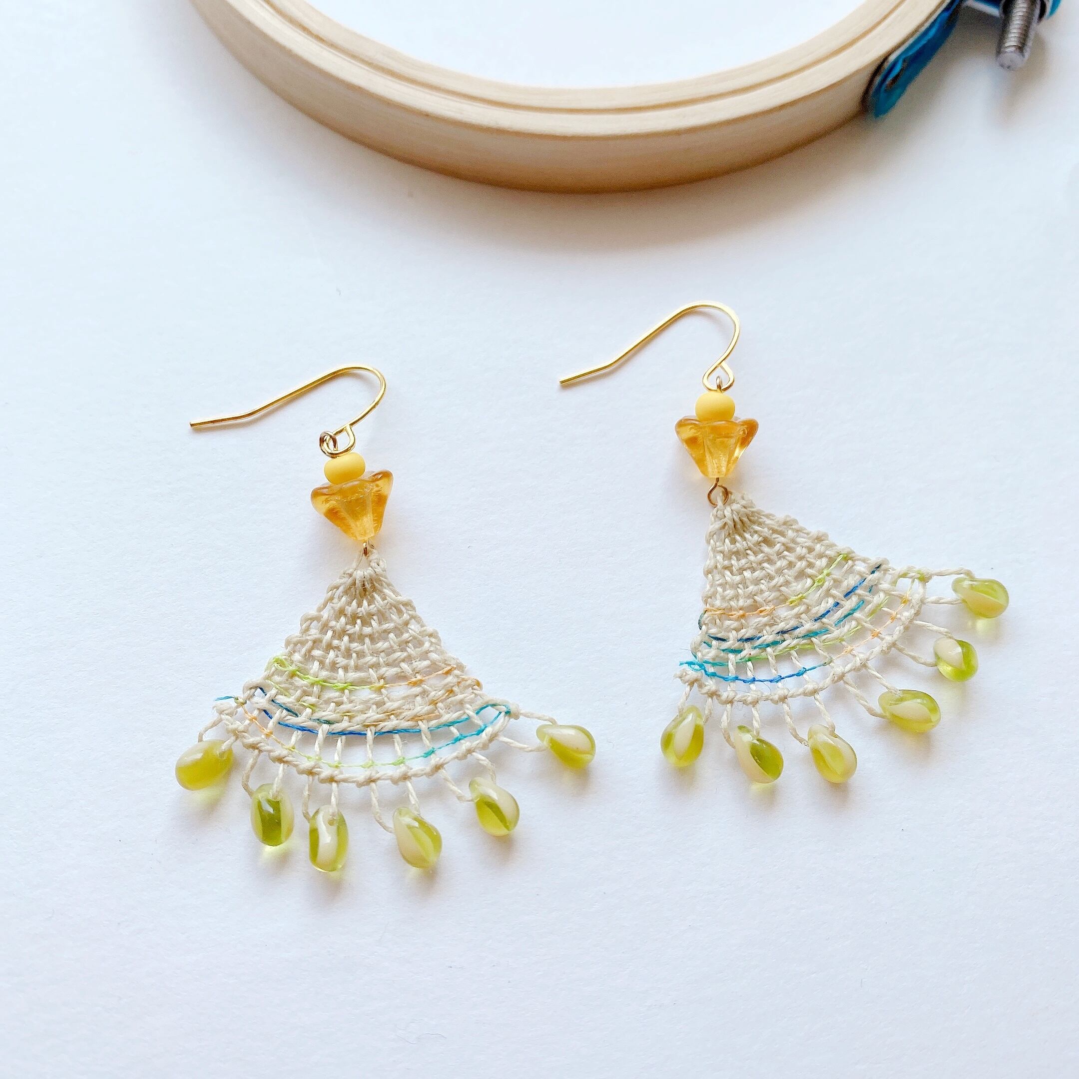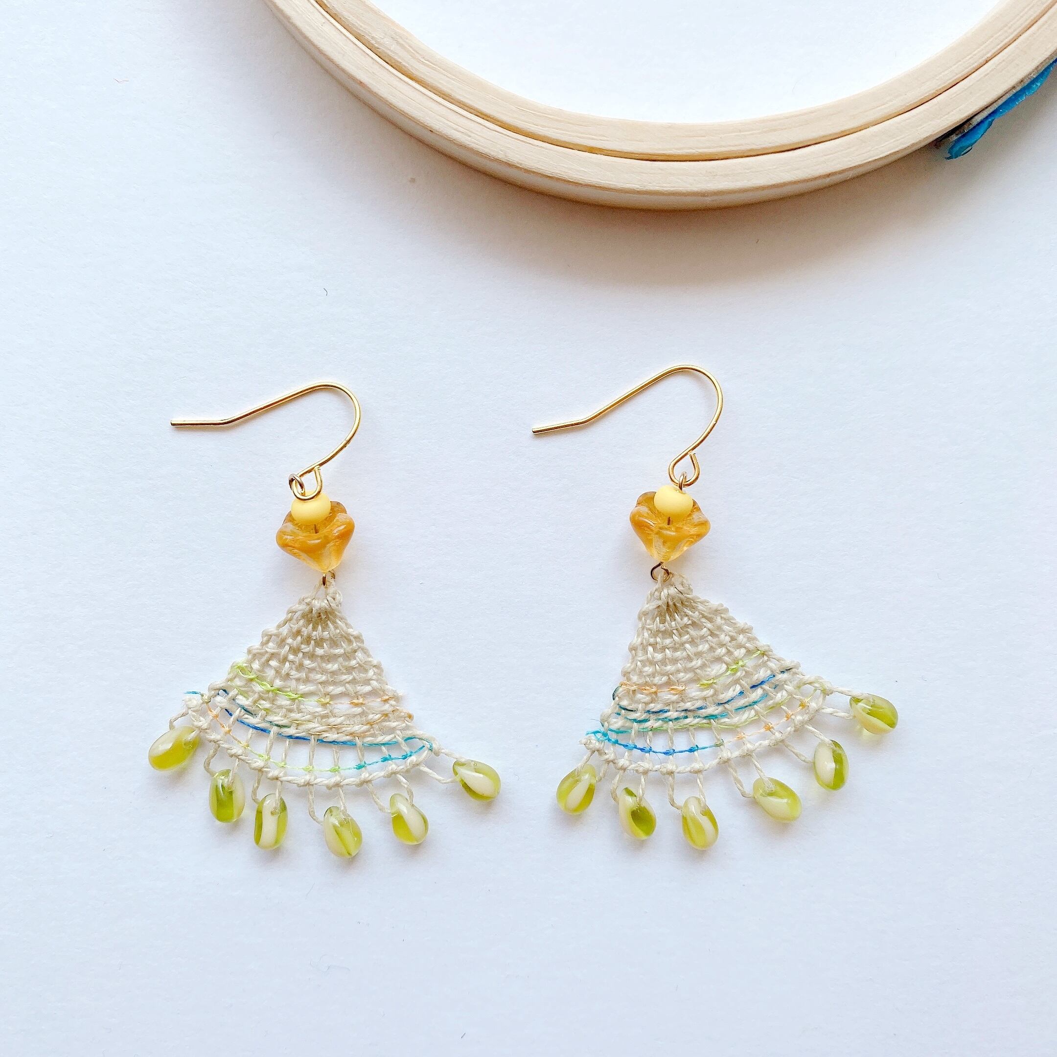 [材料]     生成り白色糸・グラデーション絹糸・2色ドロップ・お花ガラス・ピアス金具