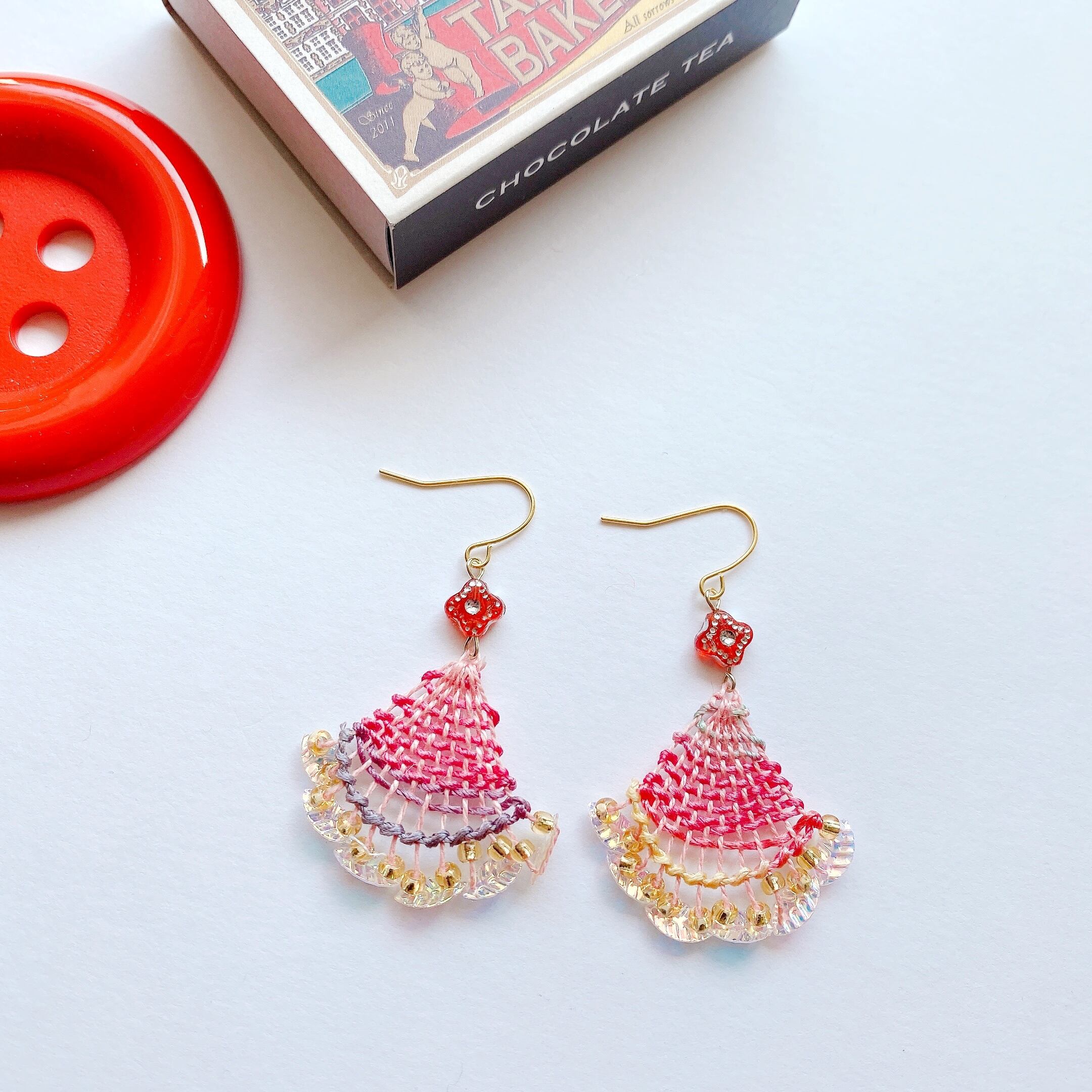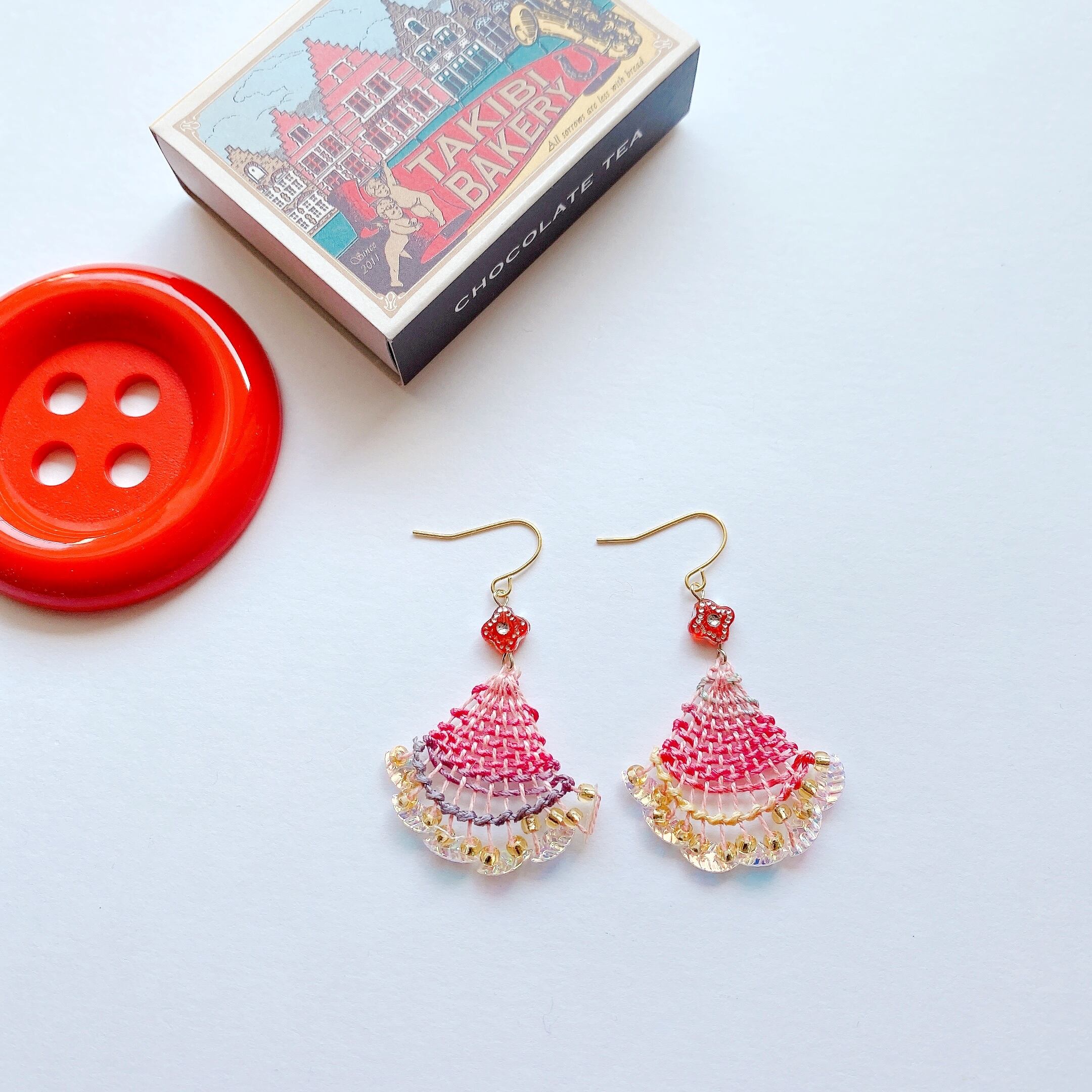 [材料]     ホワイト色糸・グラデーション赤糸・オーロラスパンコール・ガラスビーズ・ピアス金具