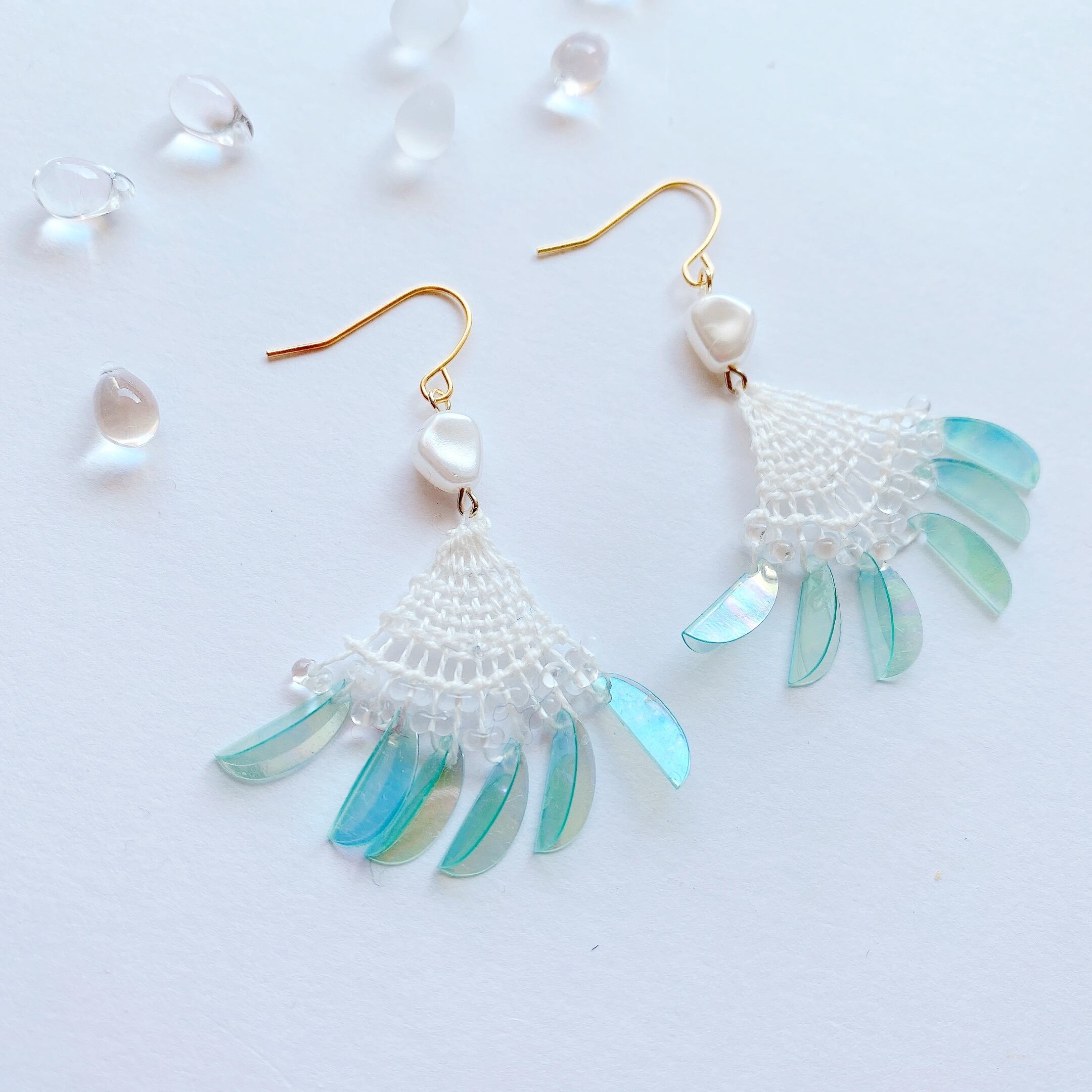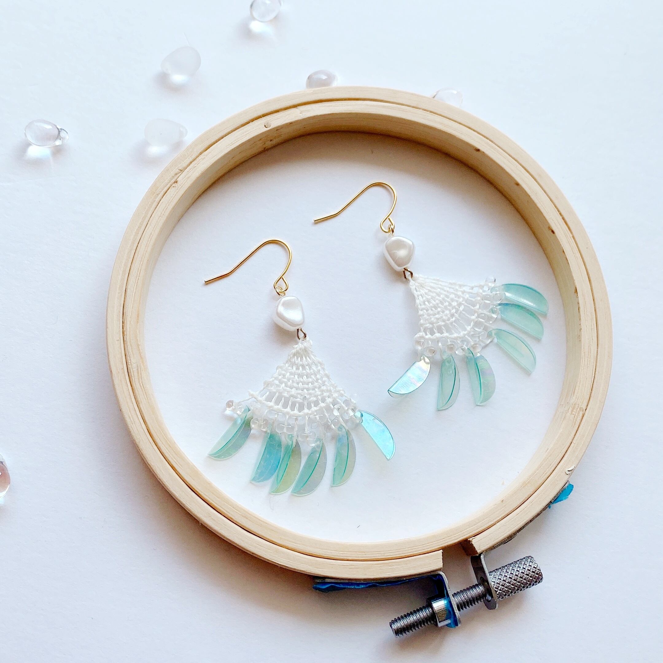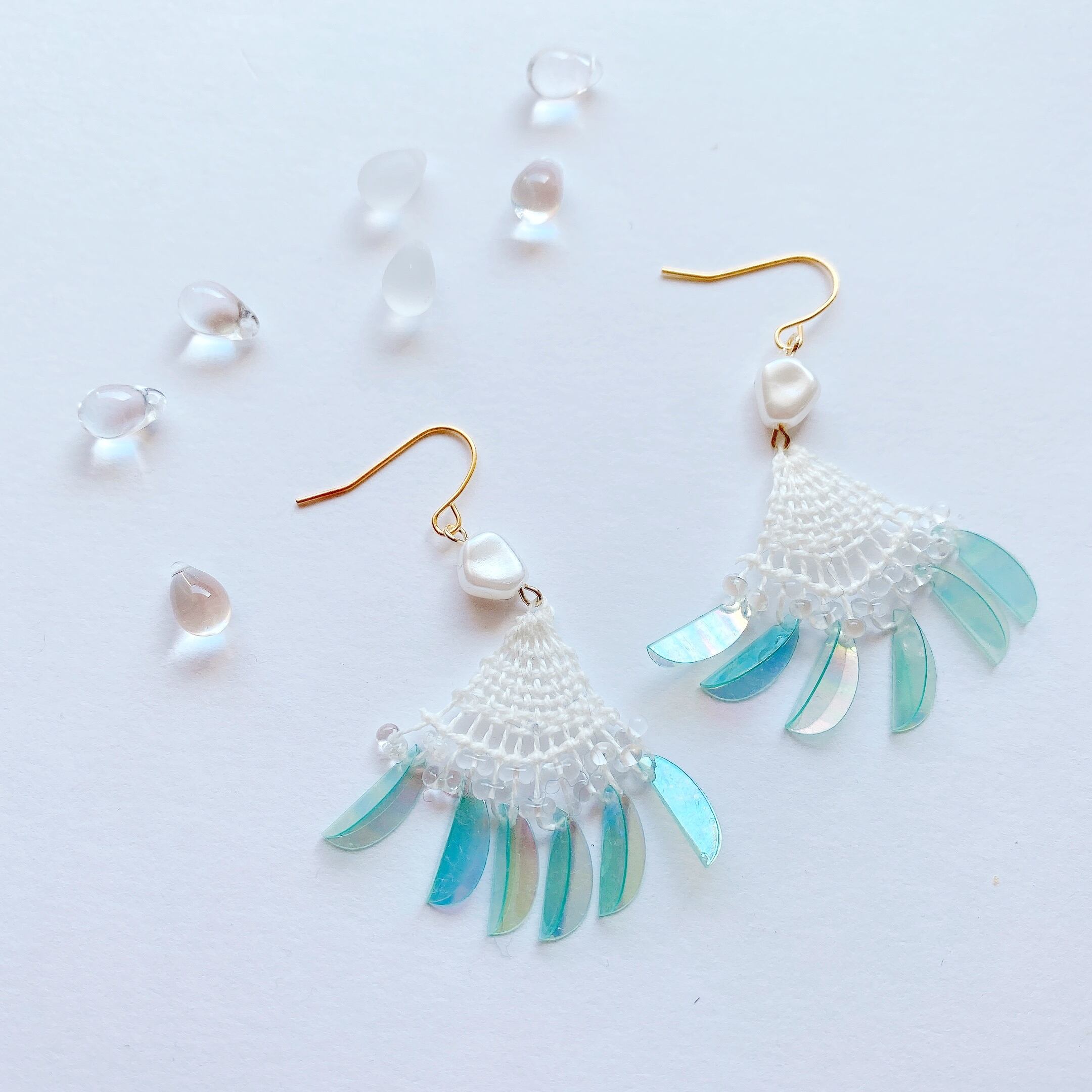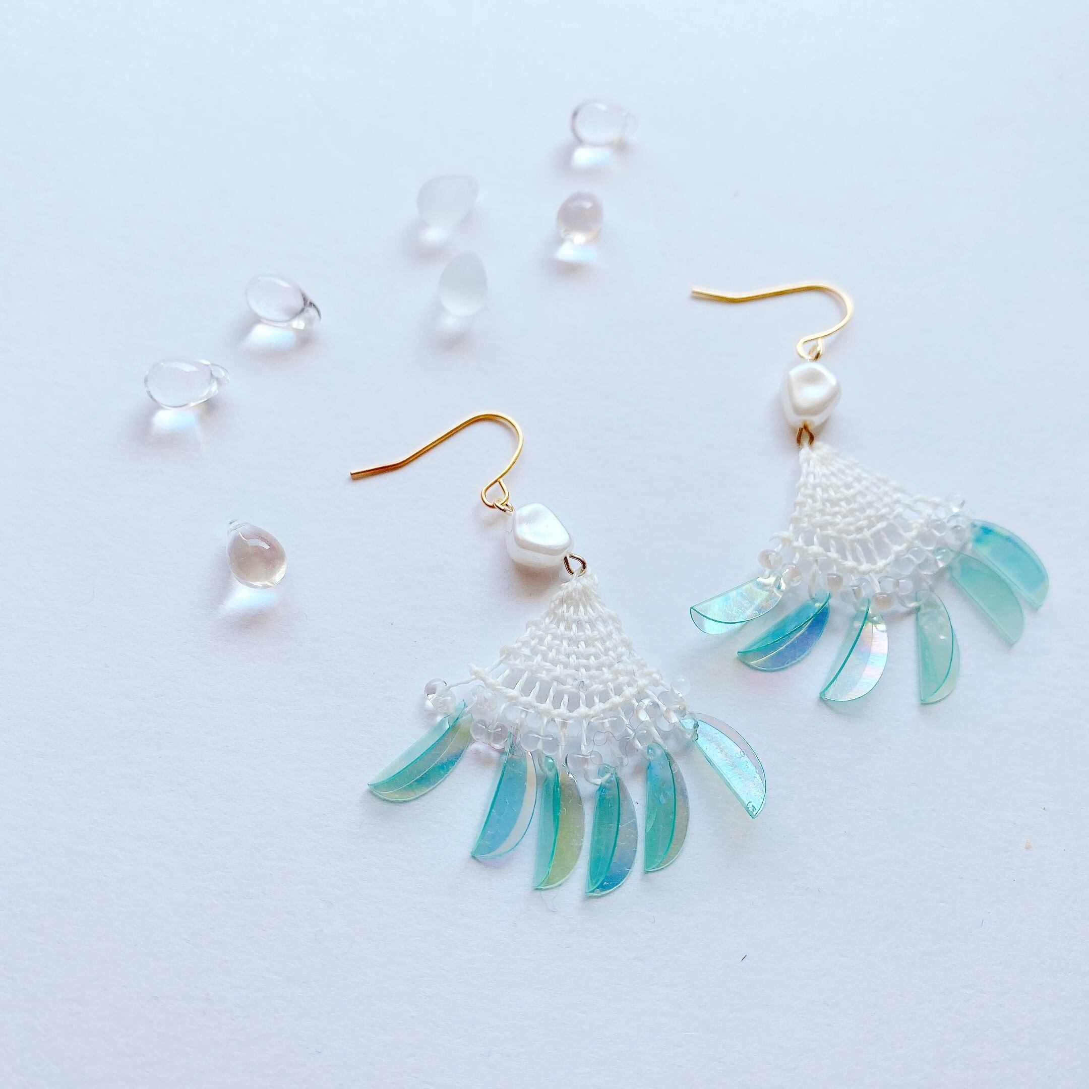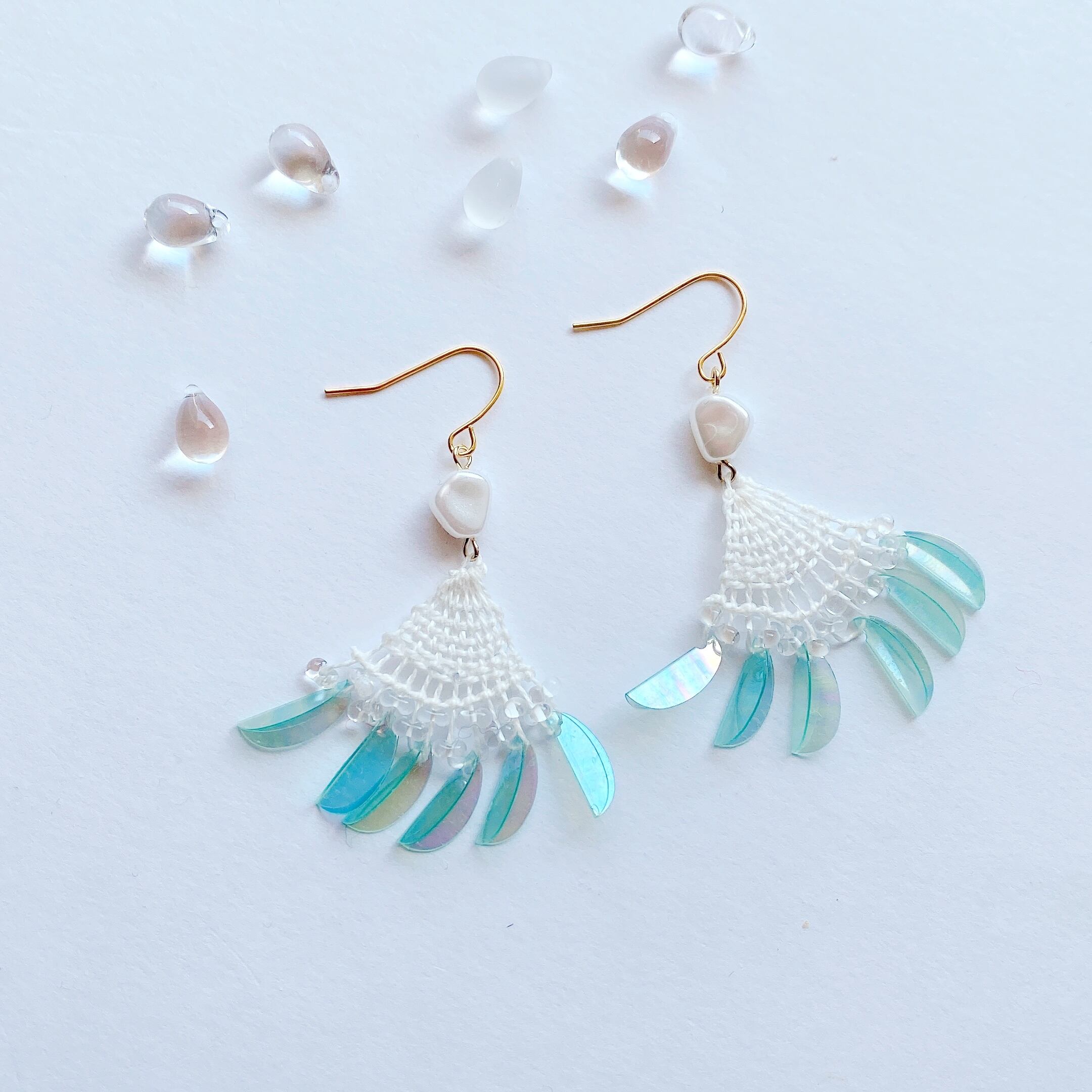 [材料]     ホワイト糸・小さなしずくガラスビーズ・シルク色ビーズ・オーロラスカイブルースパンコール・ピアス金具