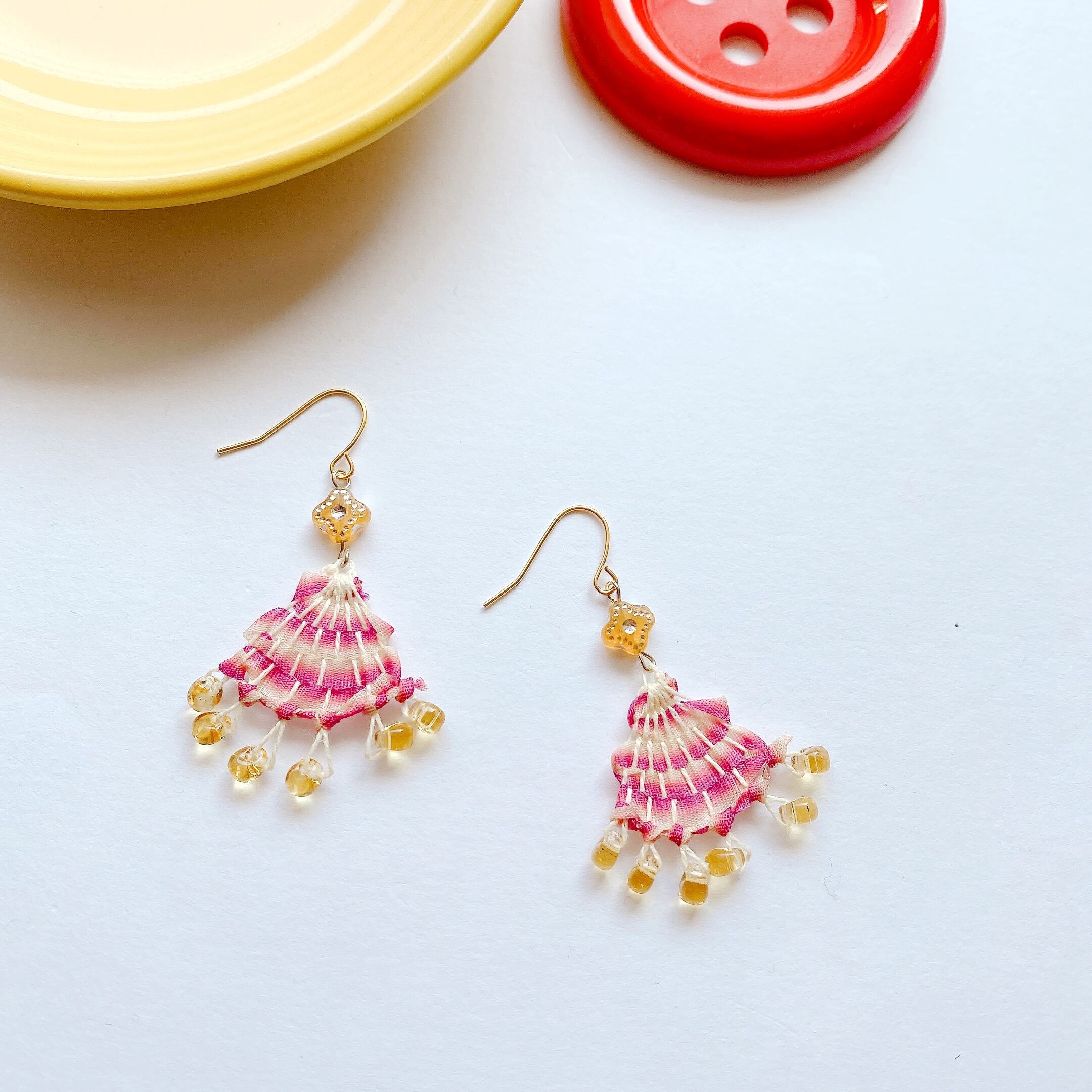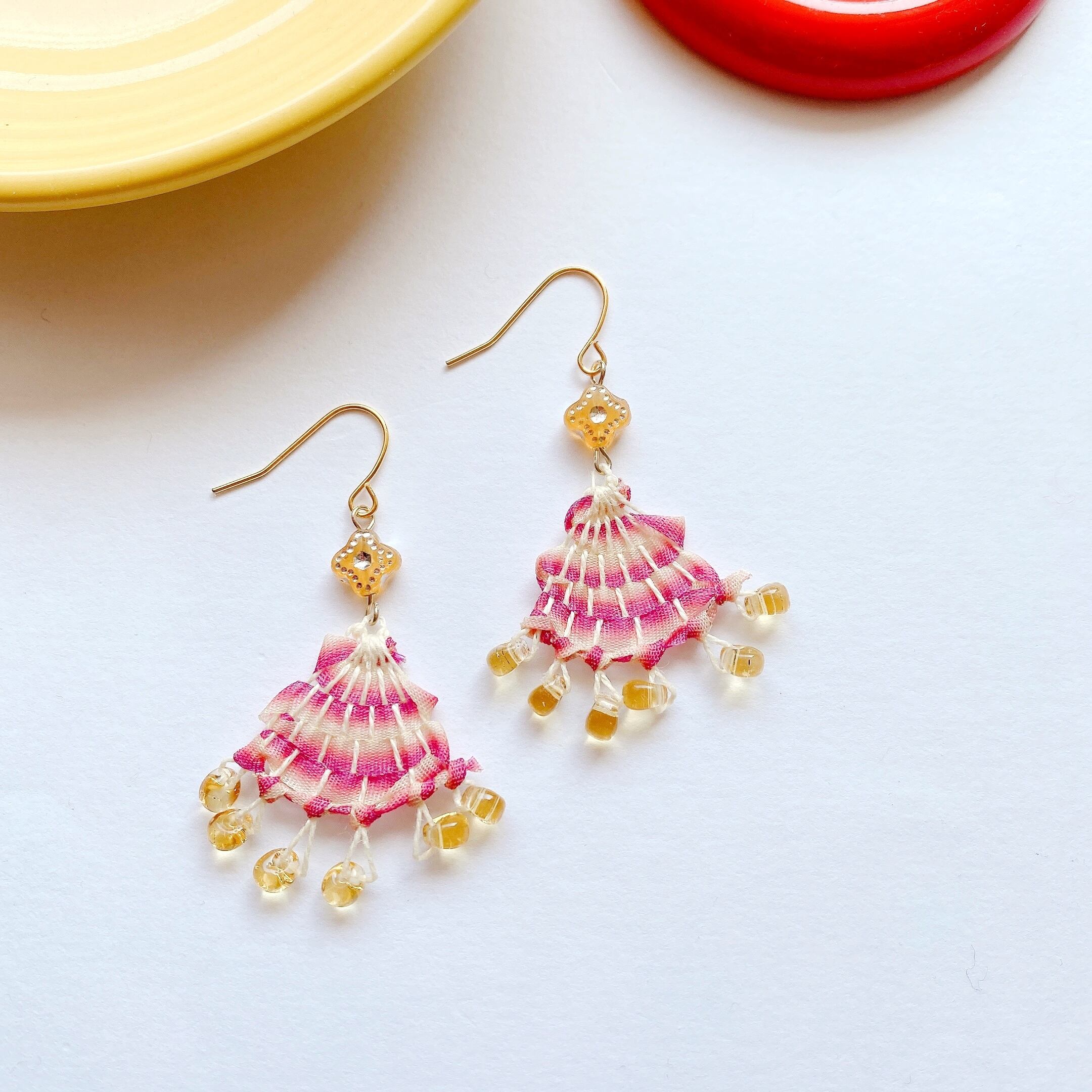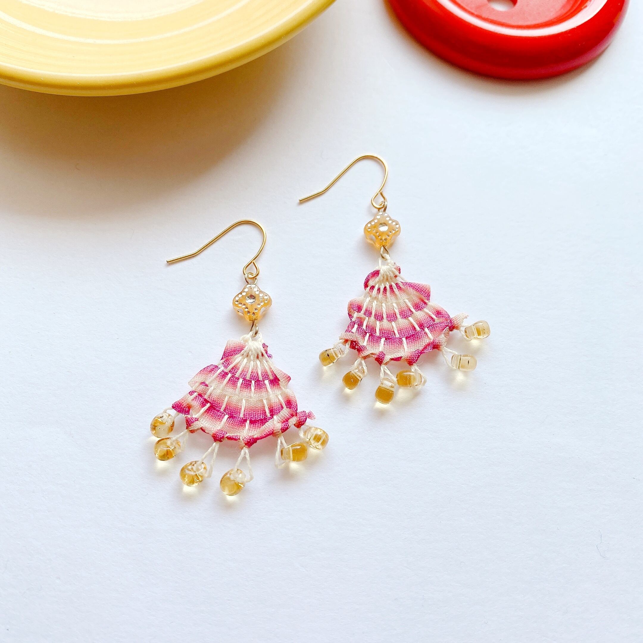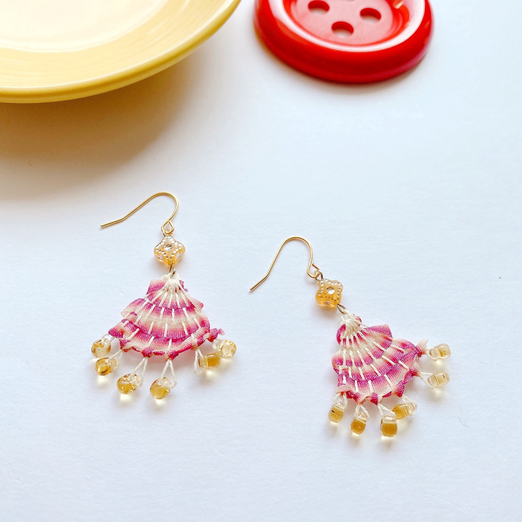 [材料]     MOKUBAリボン糸・ハチミツ色ガラスビーズ・アクリルビーズ・ピアス金具