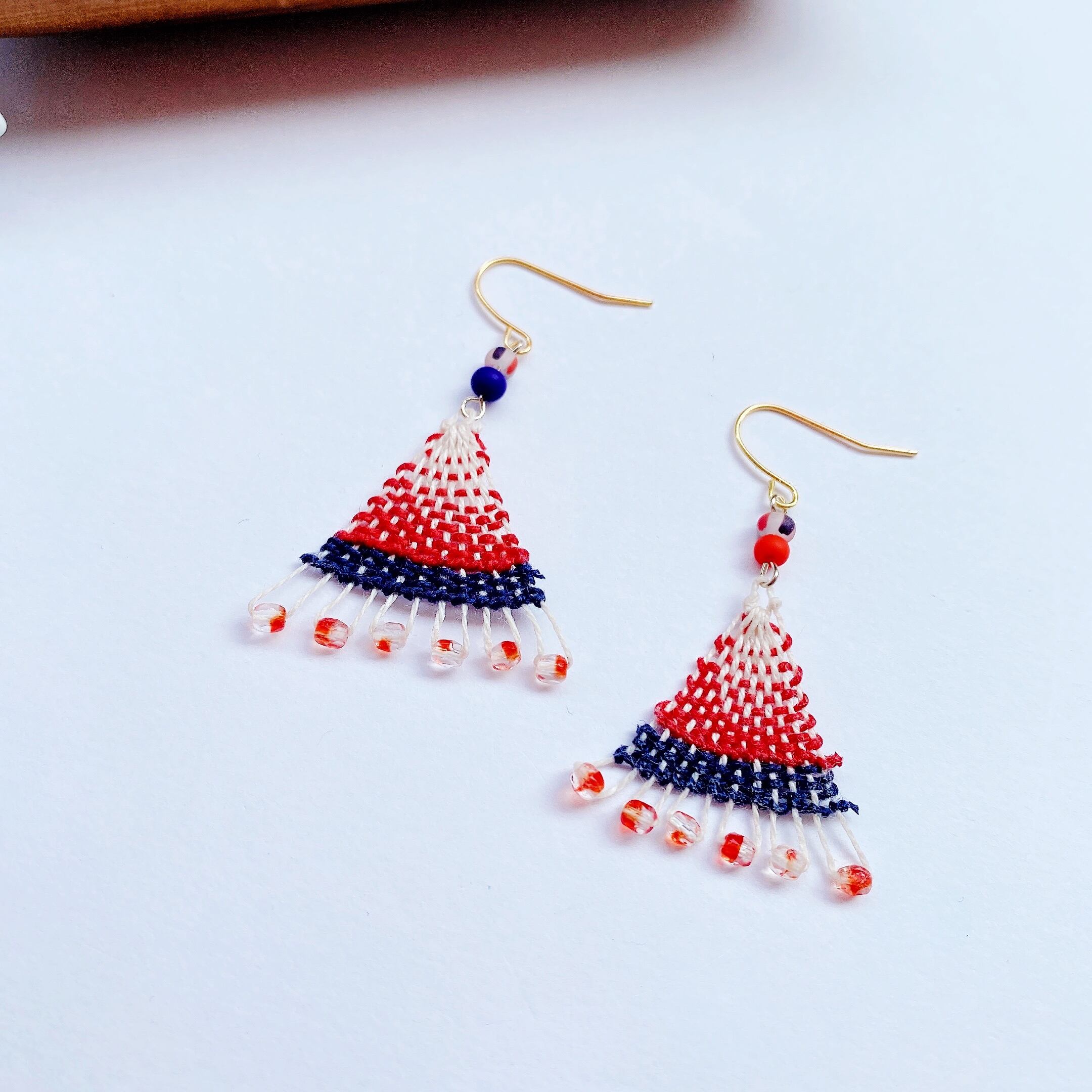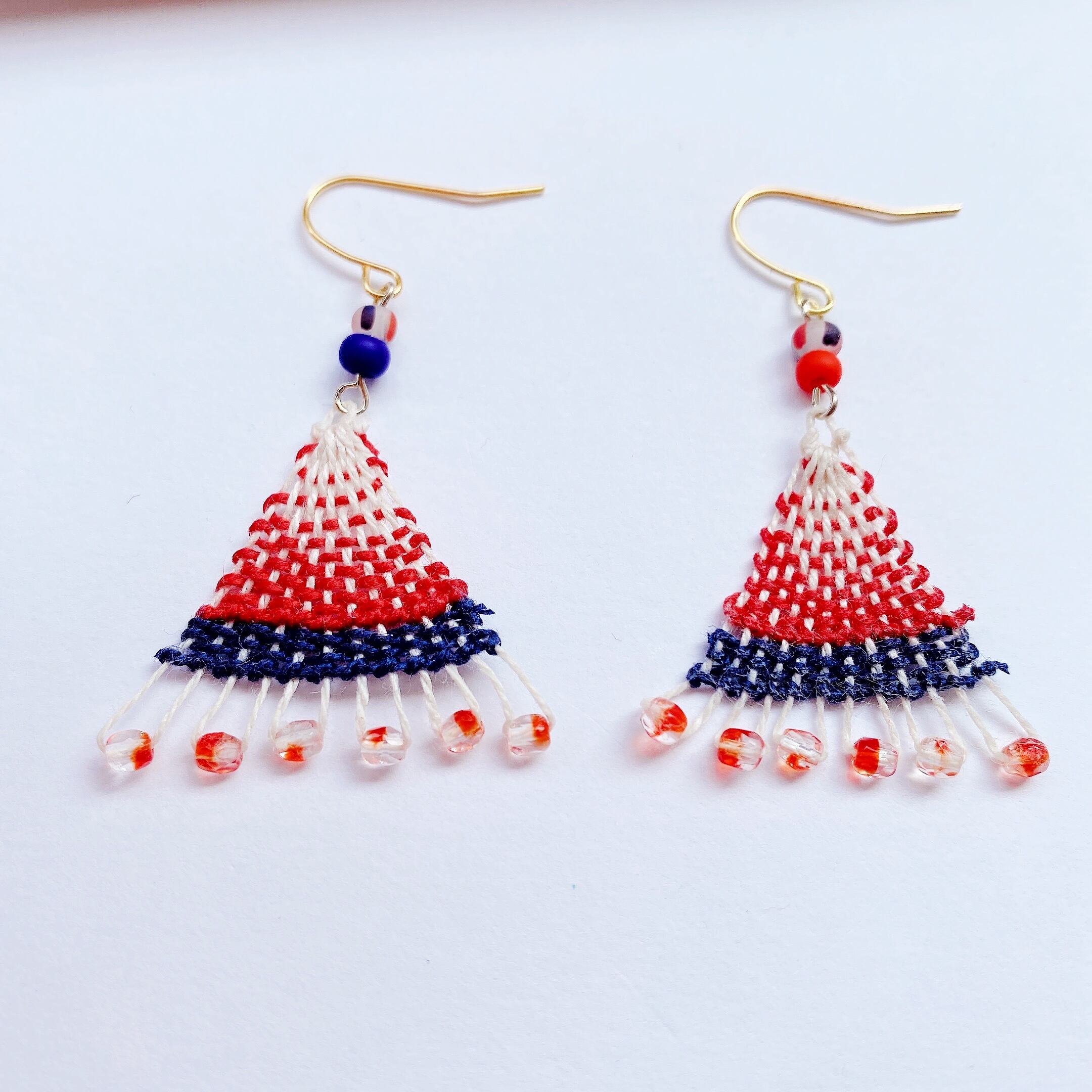 [材料]     ホワイト・ブルー・レッド糸・スクエアビーズ・ガラスビンテージビーズ・ピアス金具