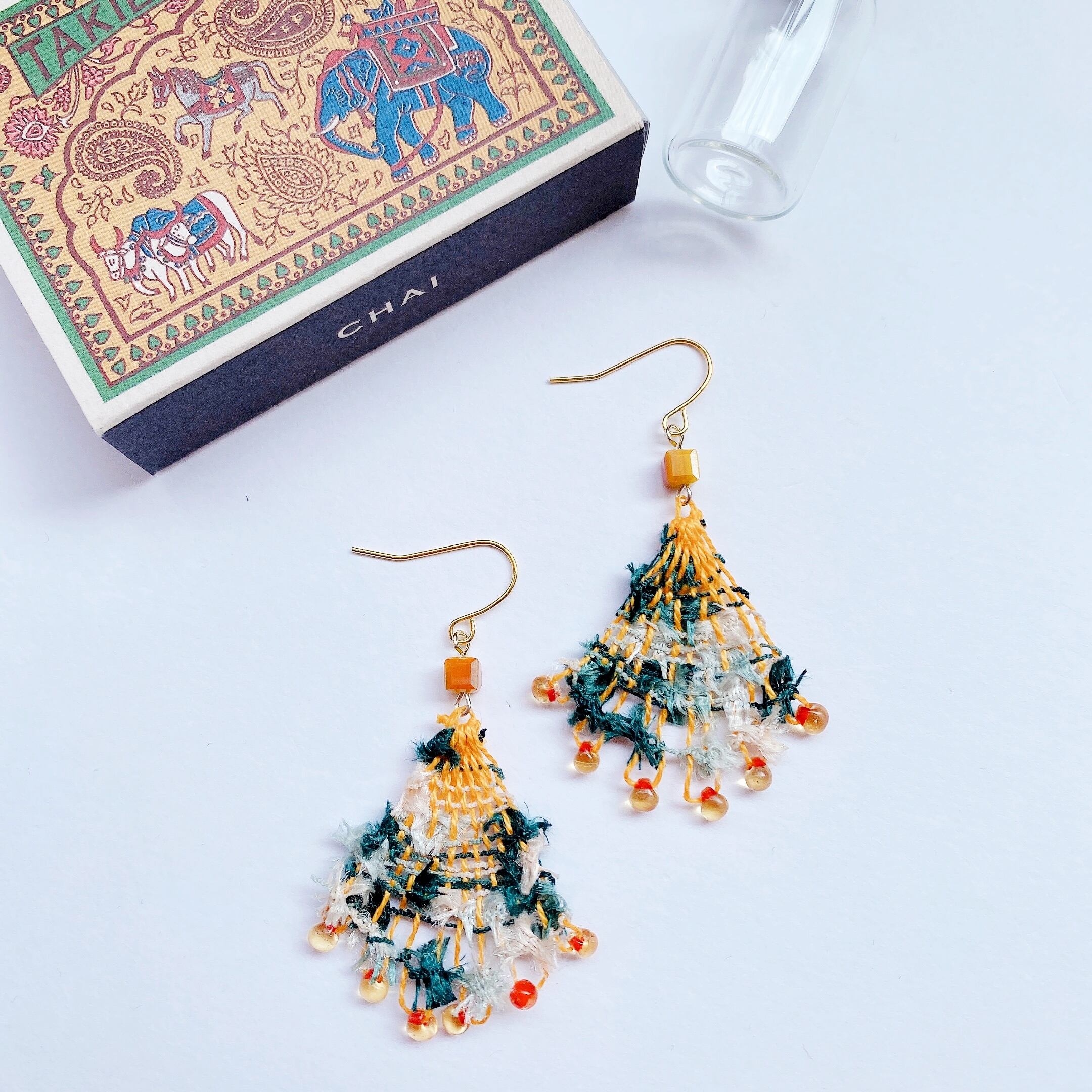 [材料]     黄色糸・グリーン変わり糸・ドロップビーズ・スクエアビーズ・ピアス金具