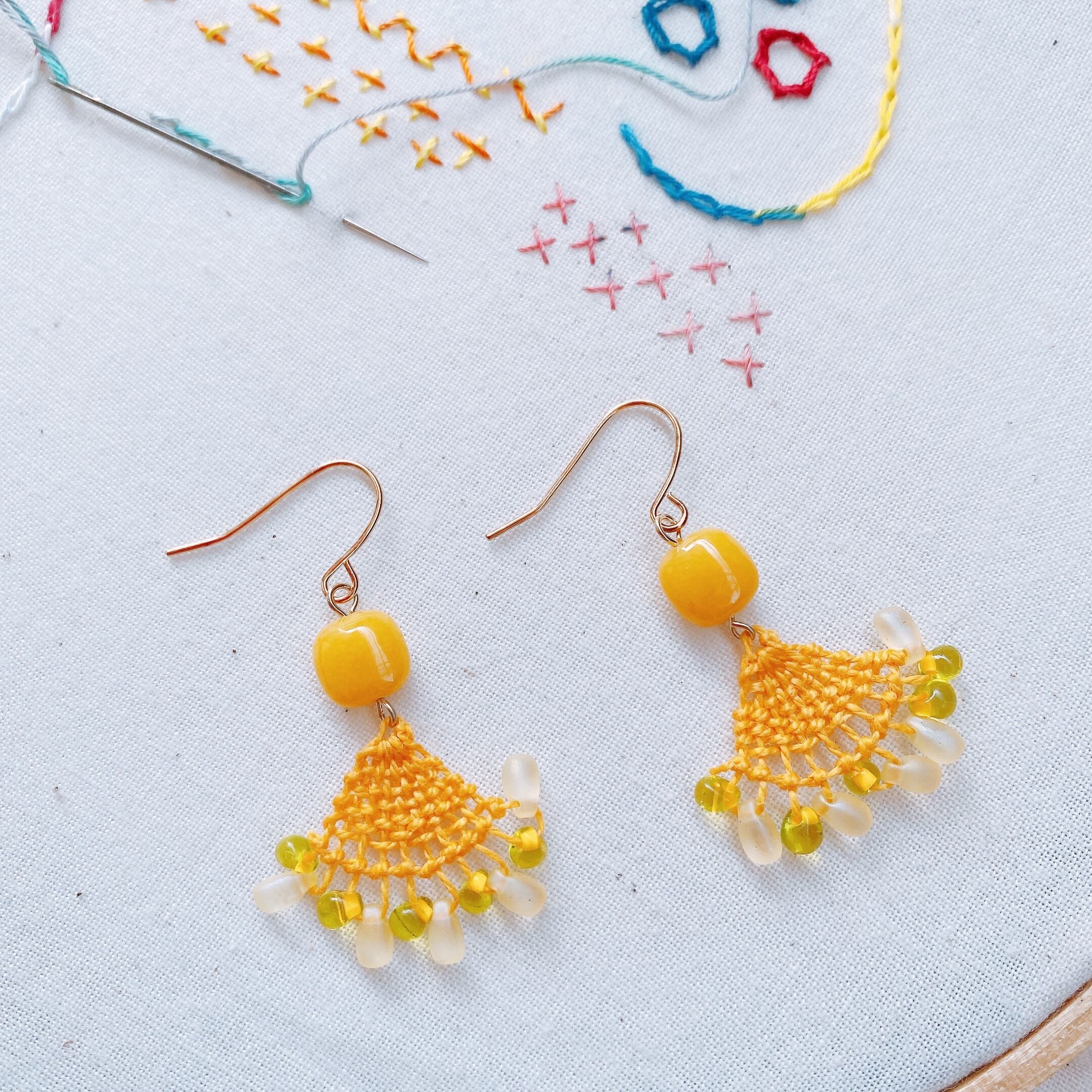 小さなサイズのパキッとしたイエローにドロップビーズをたくさん入れました。