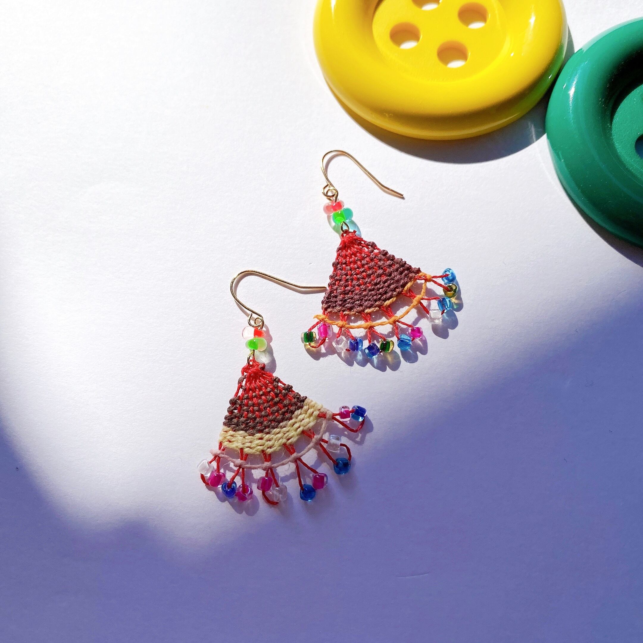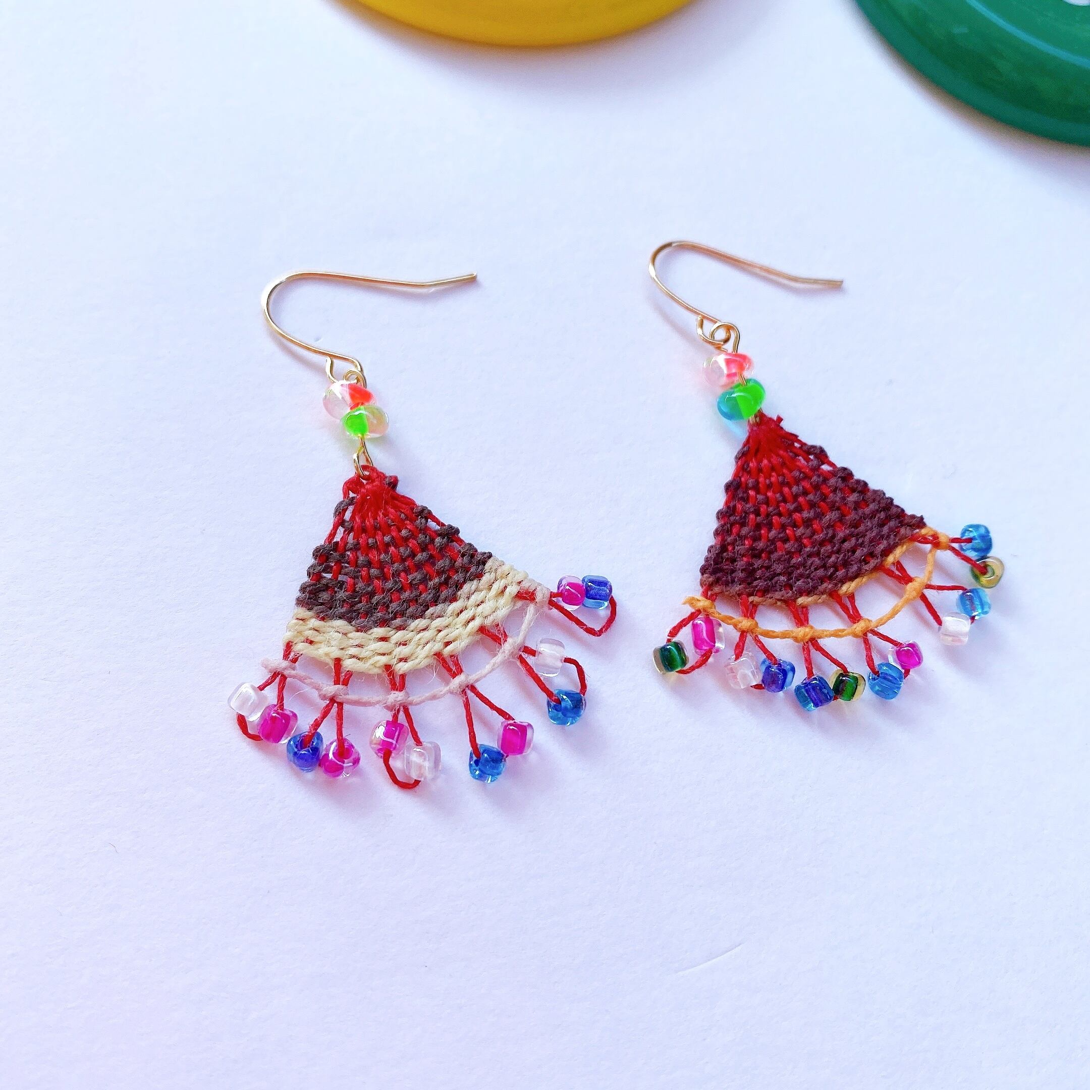 [材料]     赤色糸・グラデーション糸・カラフルガラスビーズ・ピアス金具
