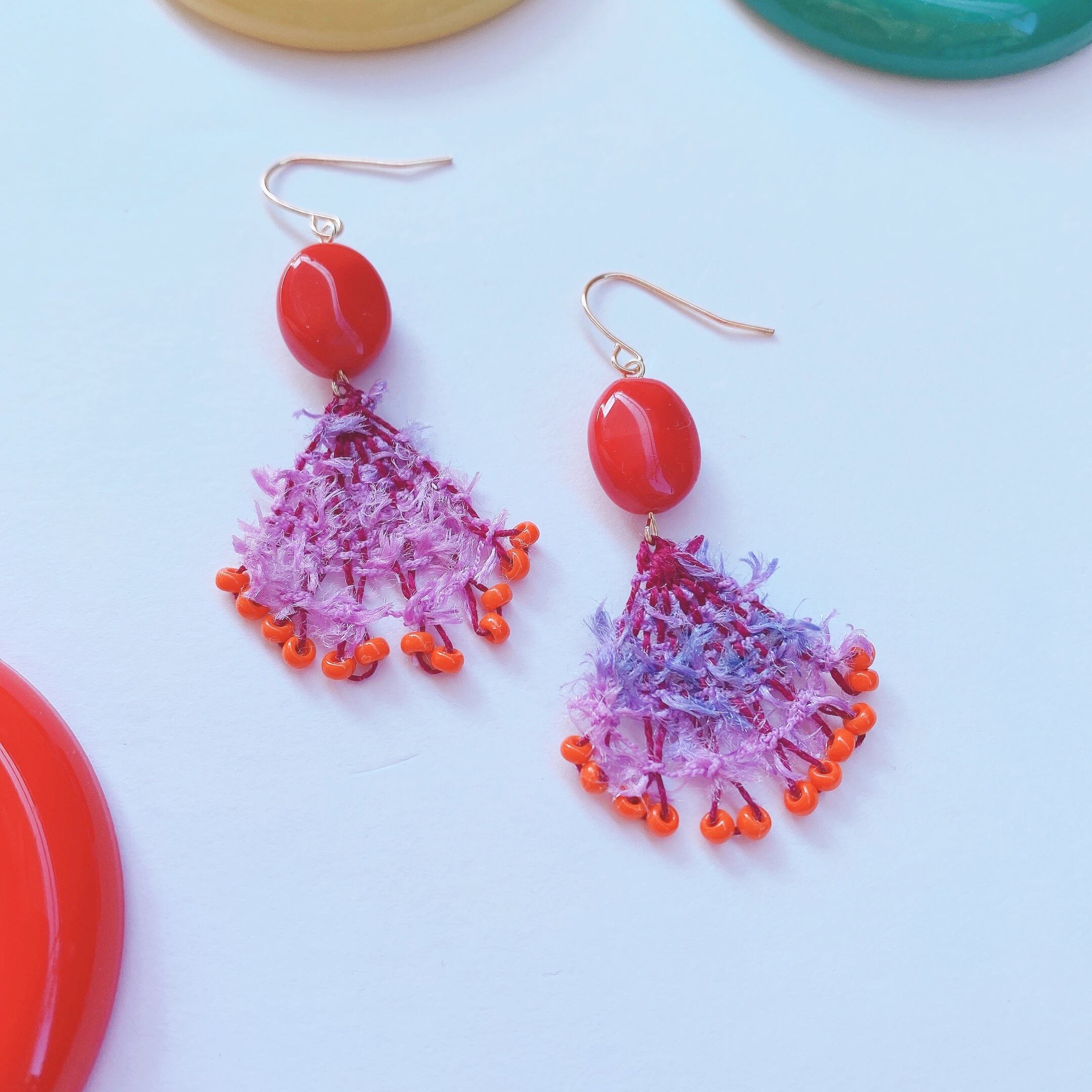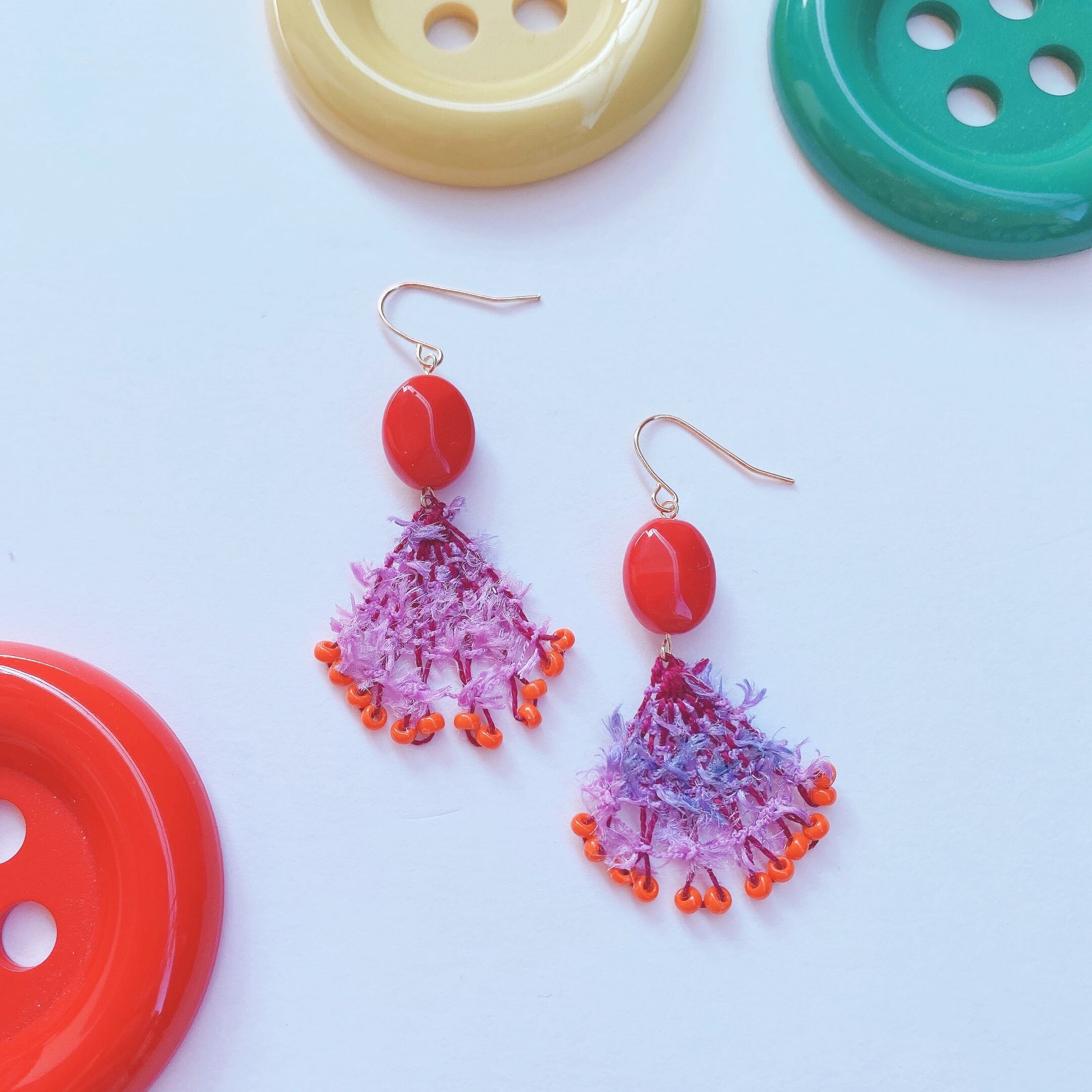 [材料]     パープル色糸・変わり糸紫グラデーション糸・極小赤シードビーズ・赤ガラスビーズ・ピアス金具