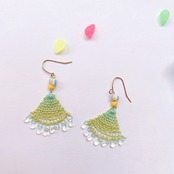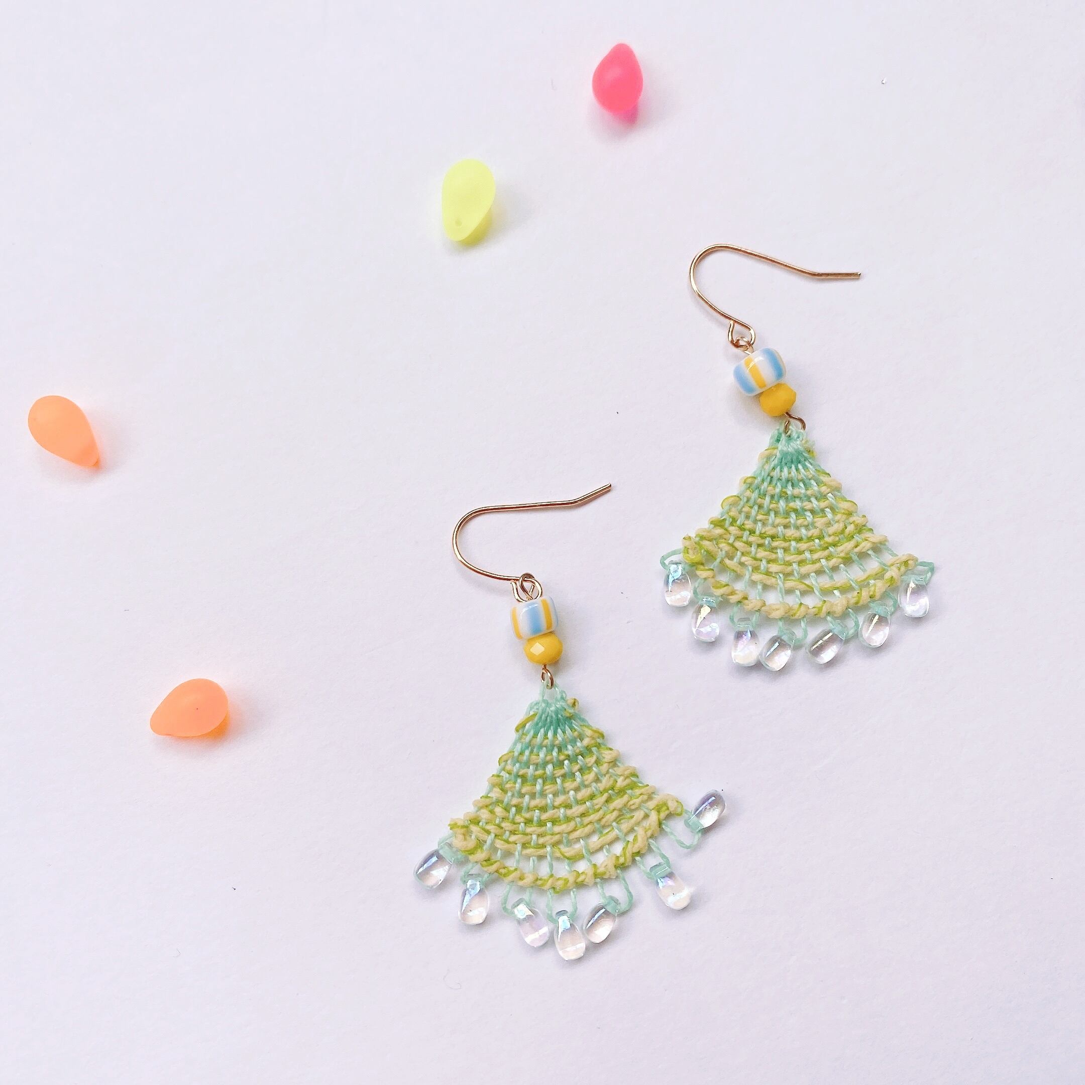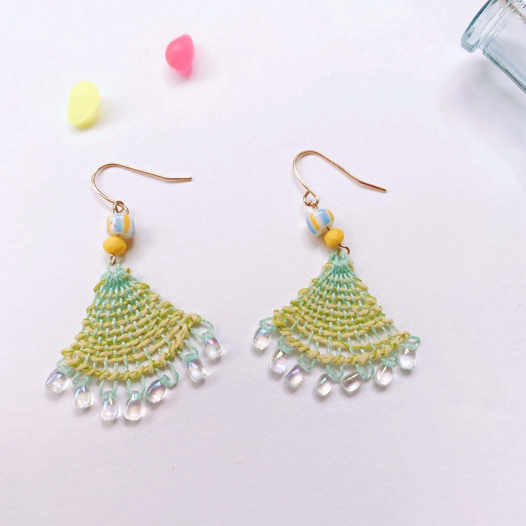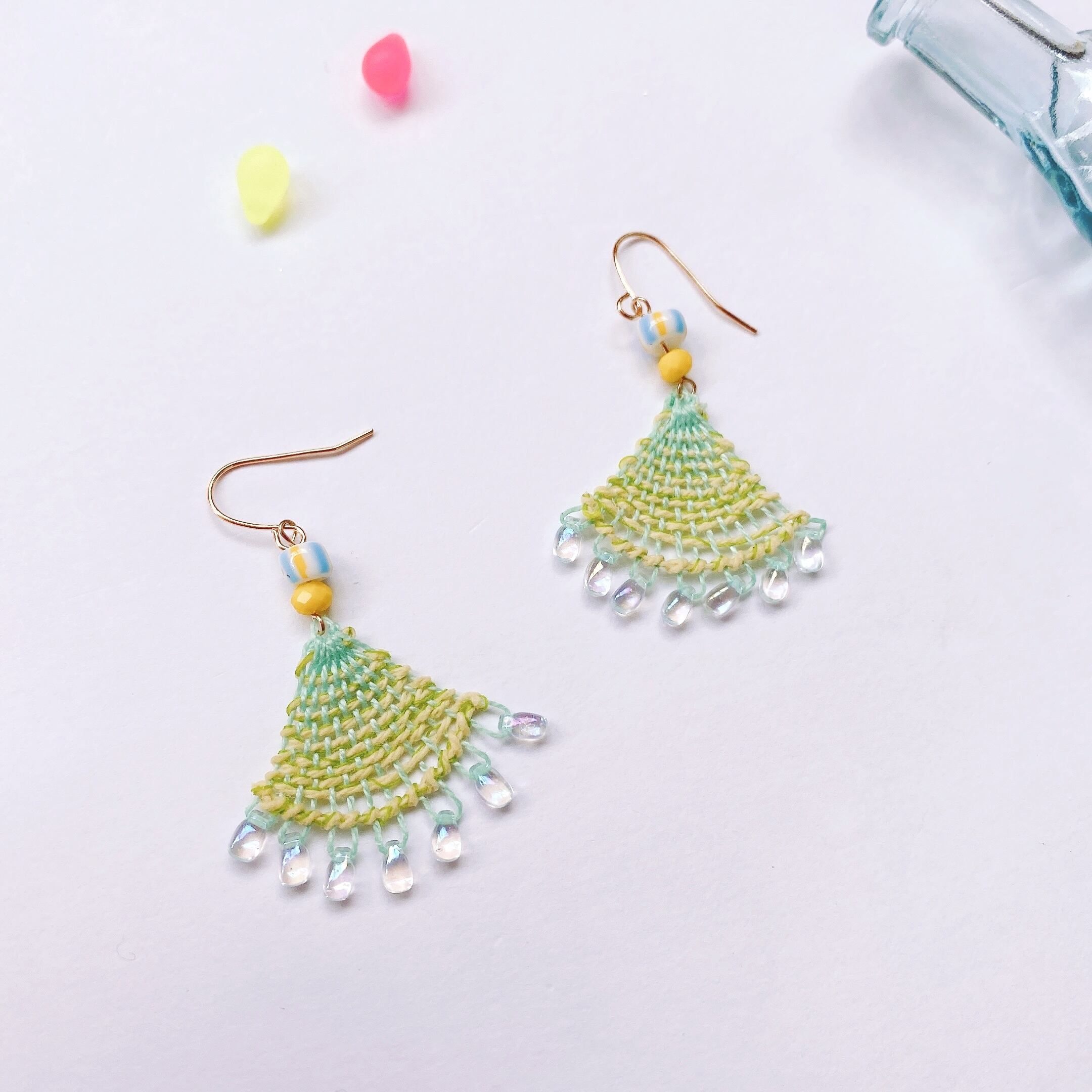 [材料]     コバルトブルー色糸・手染めグリーン糸・透明しずくガラスビーズ・ストライプビーズ・ピアス金具