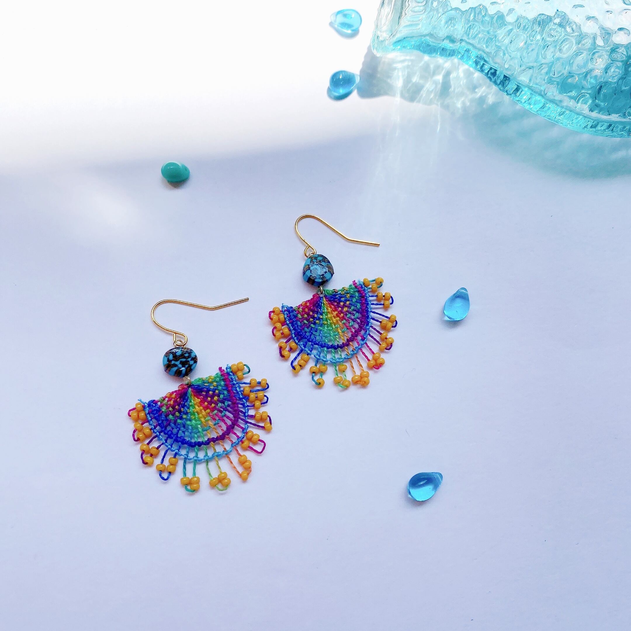 [材料]     レインボー色糸・極小黄色ビーズ・オリジナル樹脂ビーズ・ピアス金具