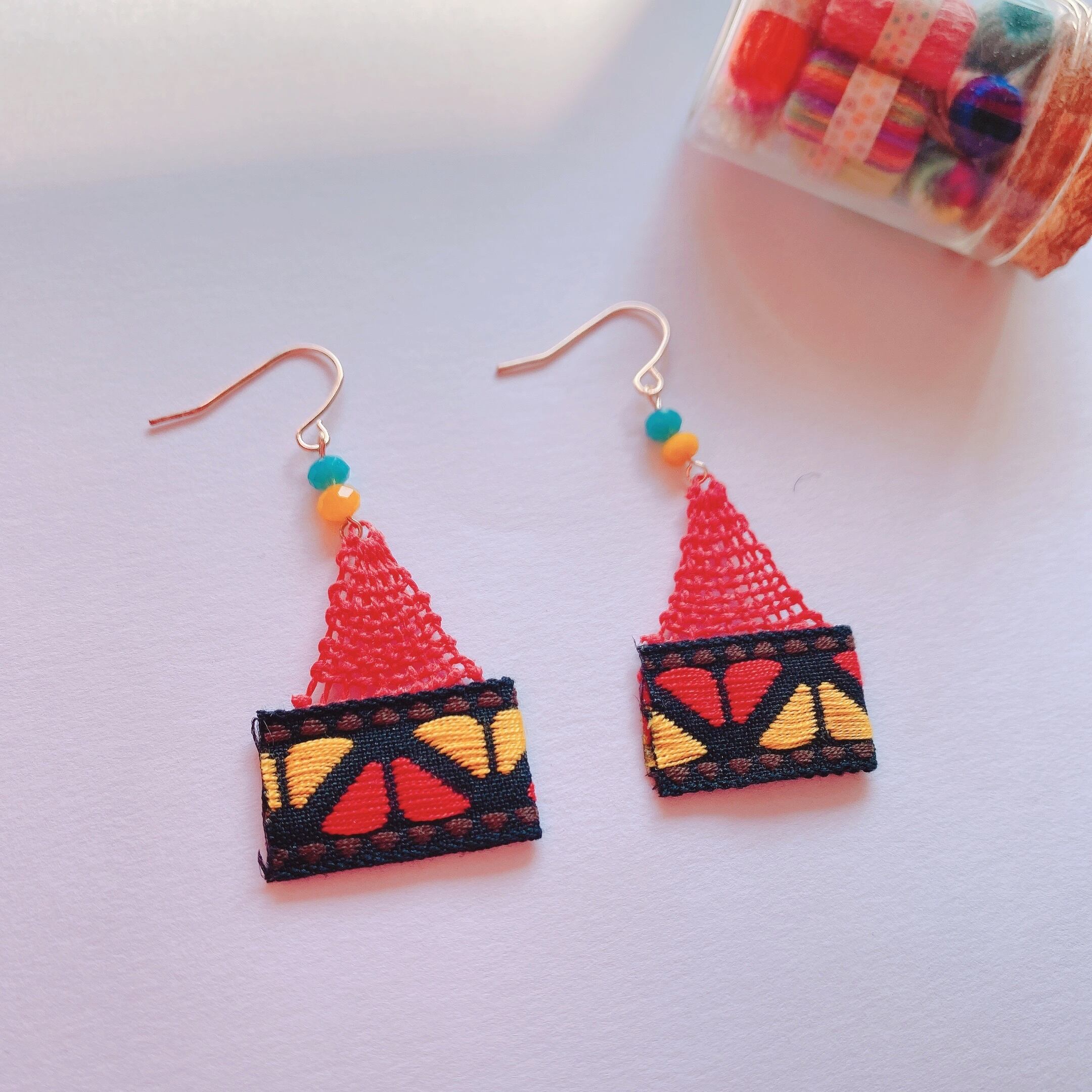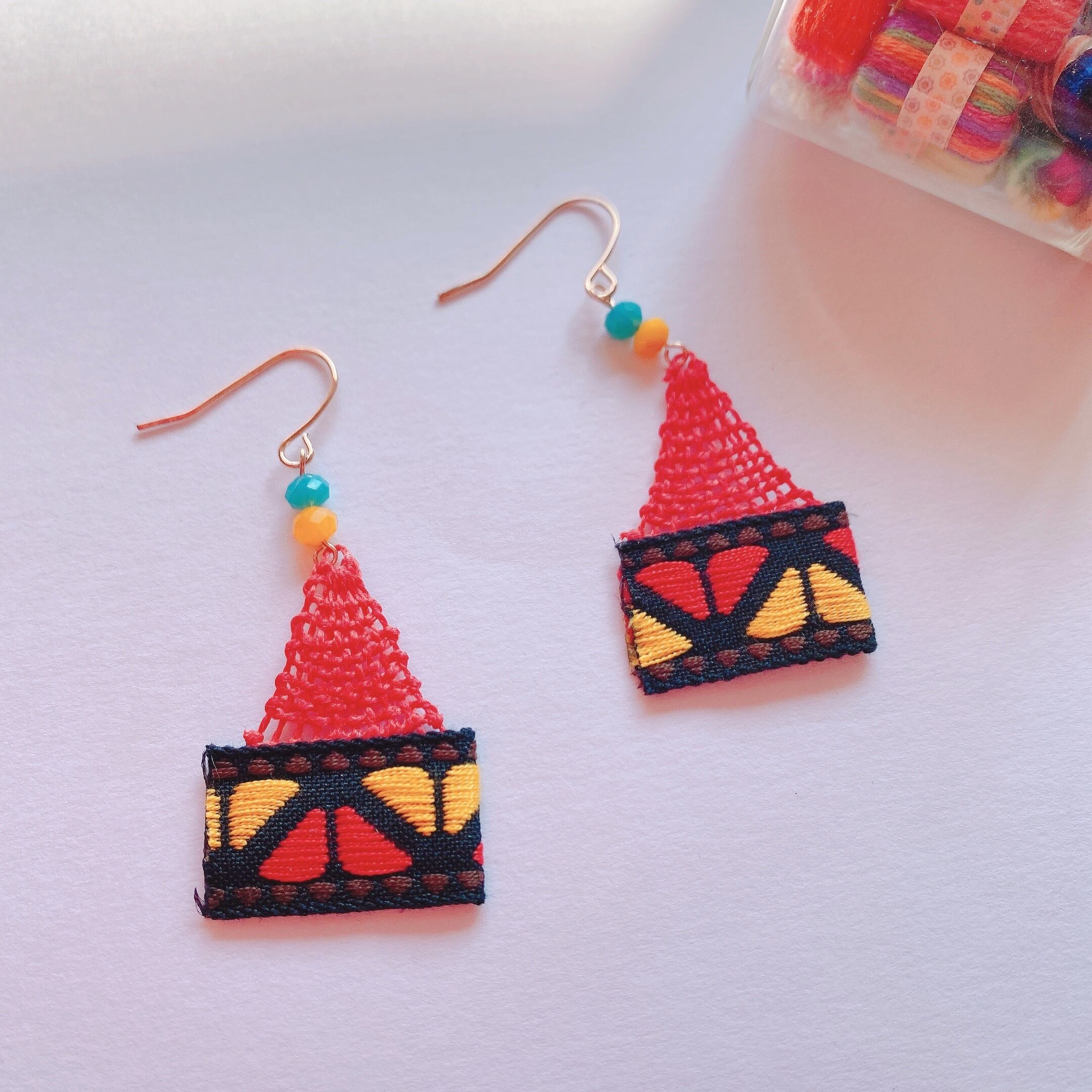 [材料]     オレンジ色糸・ トライアングル柄テープ・黄色、水色ガラスビーズ・ピアス金具