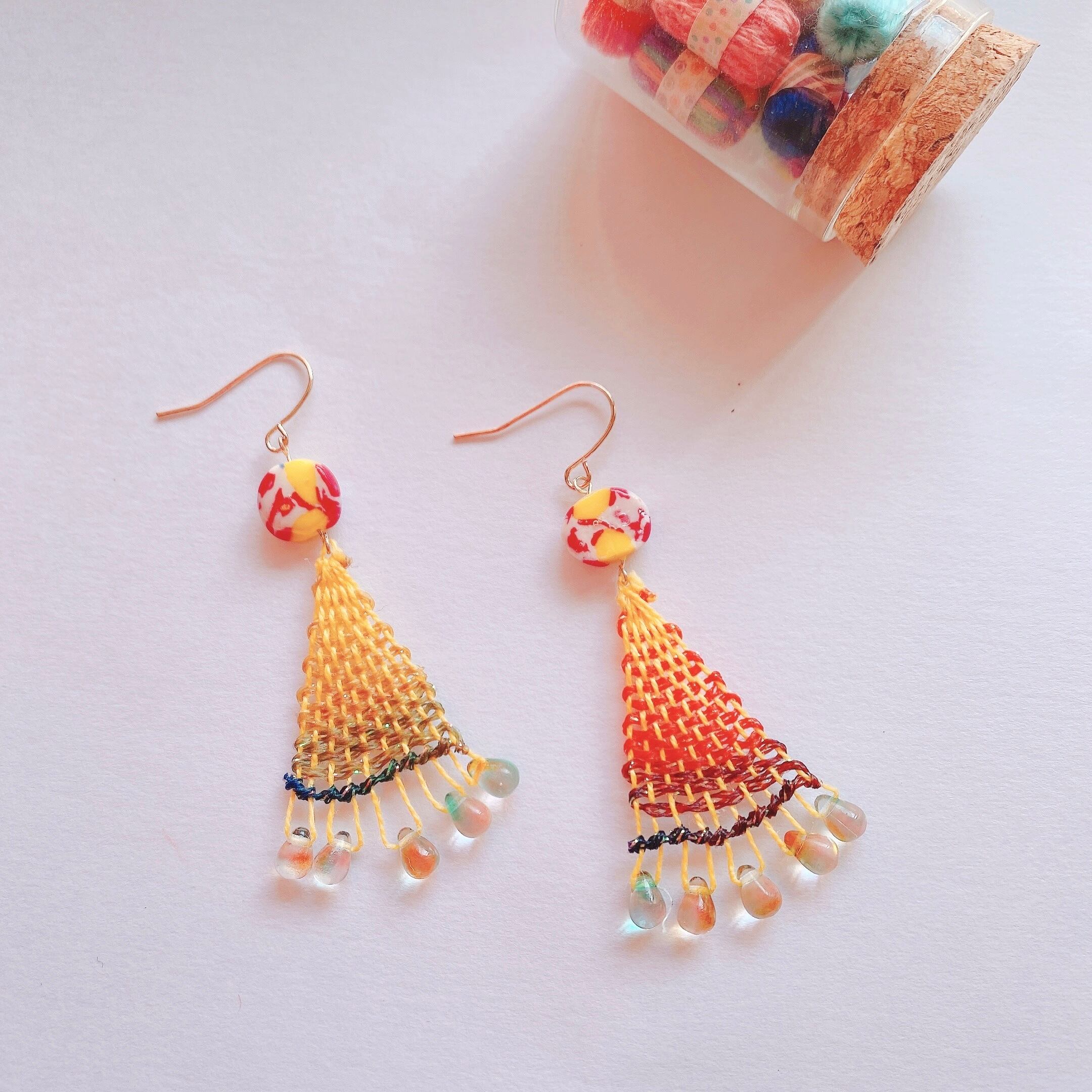 [材料]     黄色糸・ グラデーション糸・しずく型ガラスビーズ・オリジナル樹脂ビーズ・ピアス金具